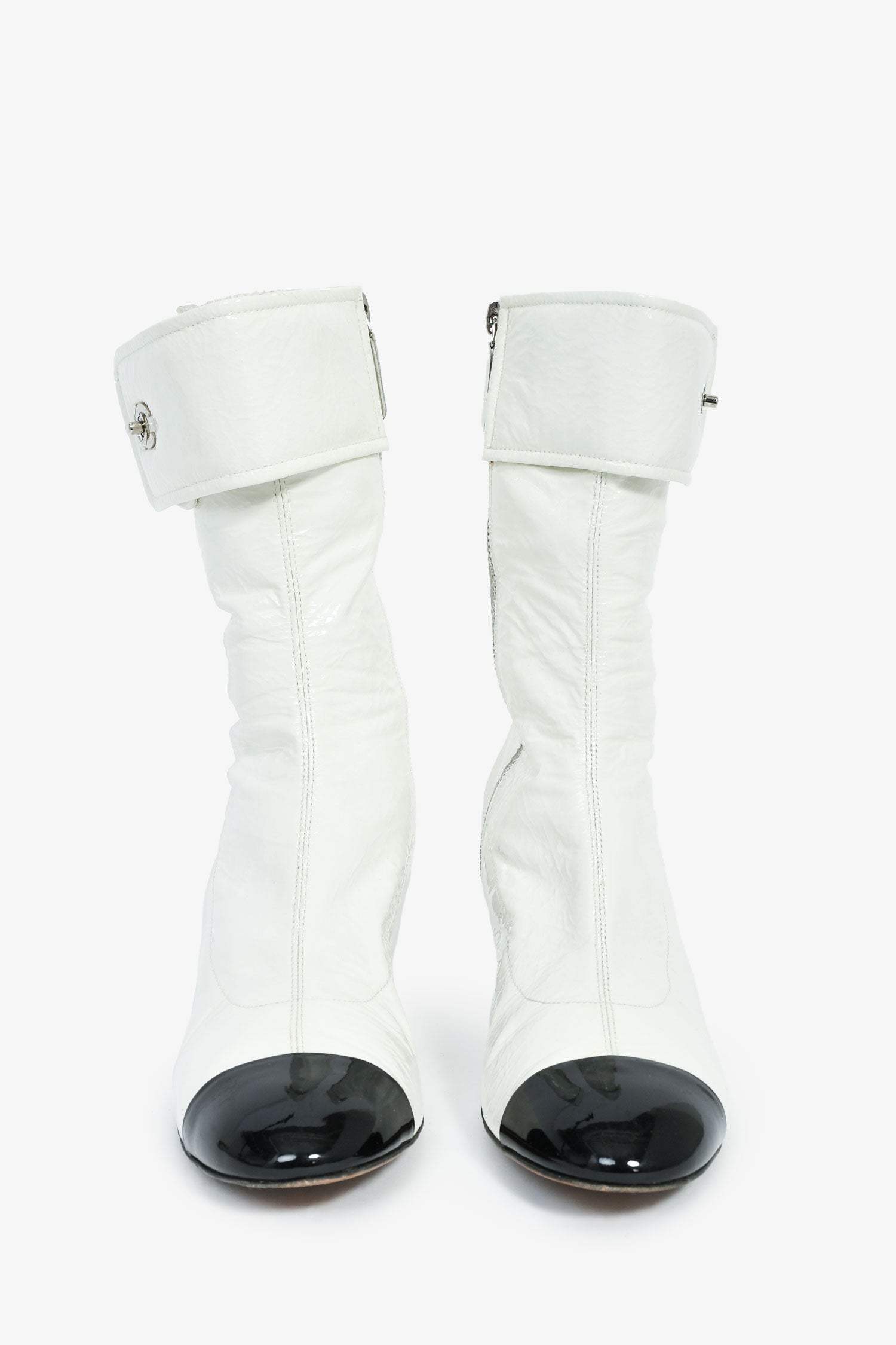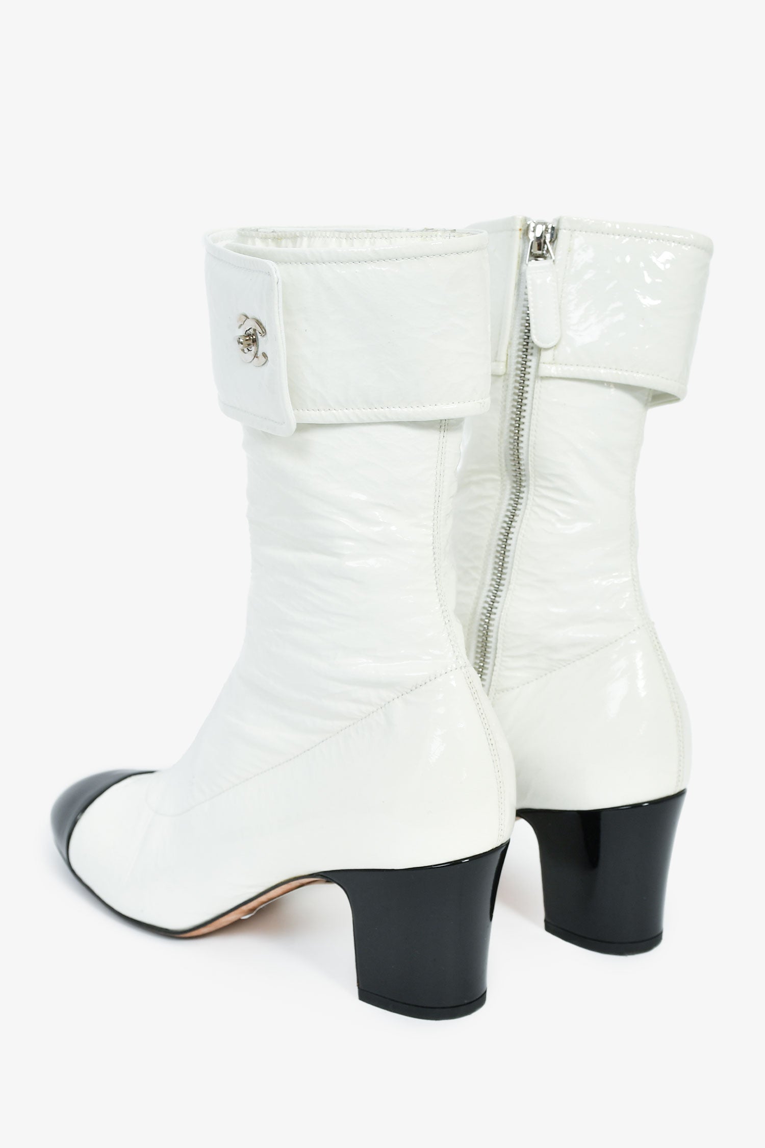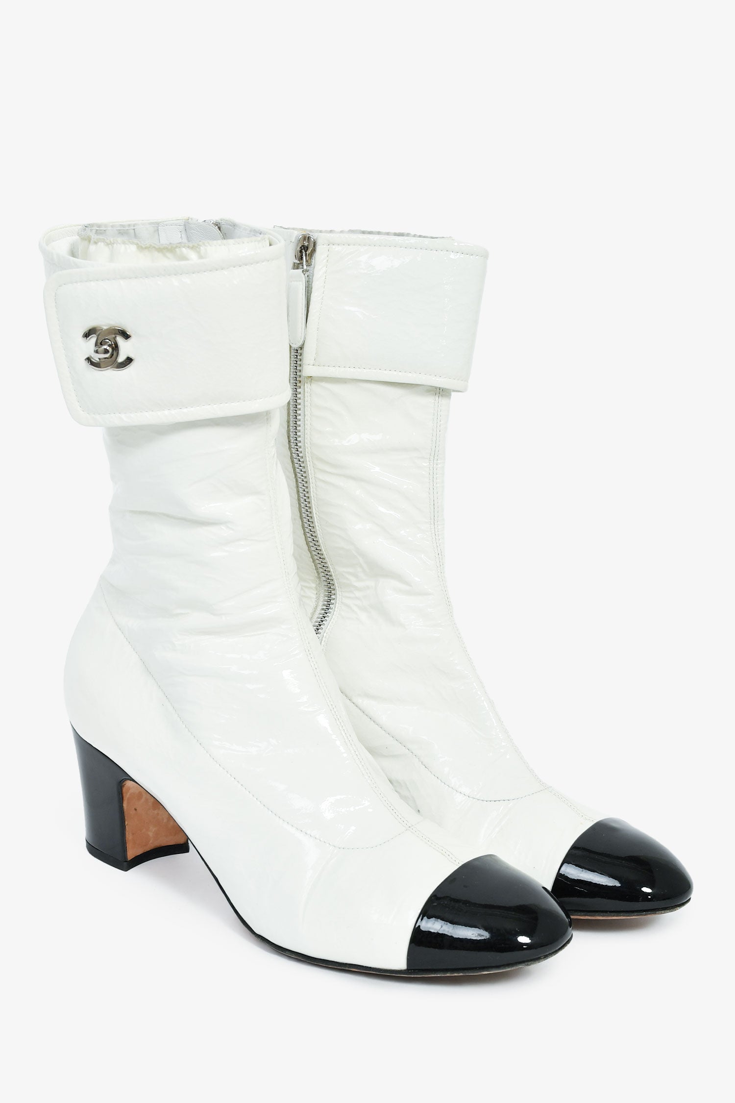 Refresh availabilityPre-Loved Chanel™ White Patent Black Cap Toe CC Turnlock Booties. Side zip closure. Glossy finish.