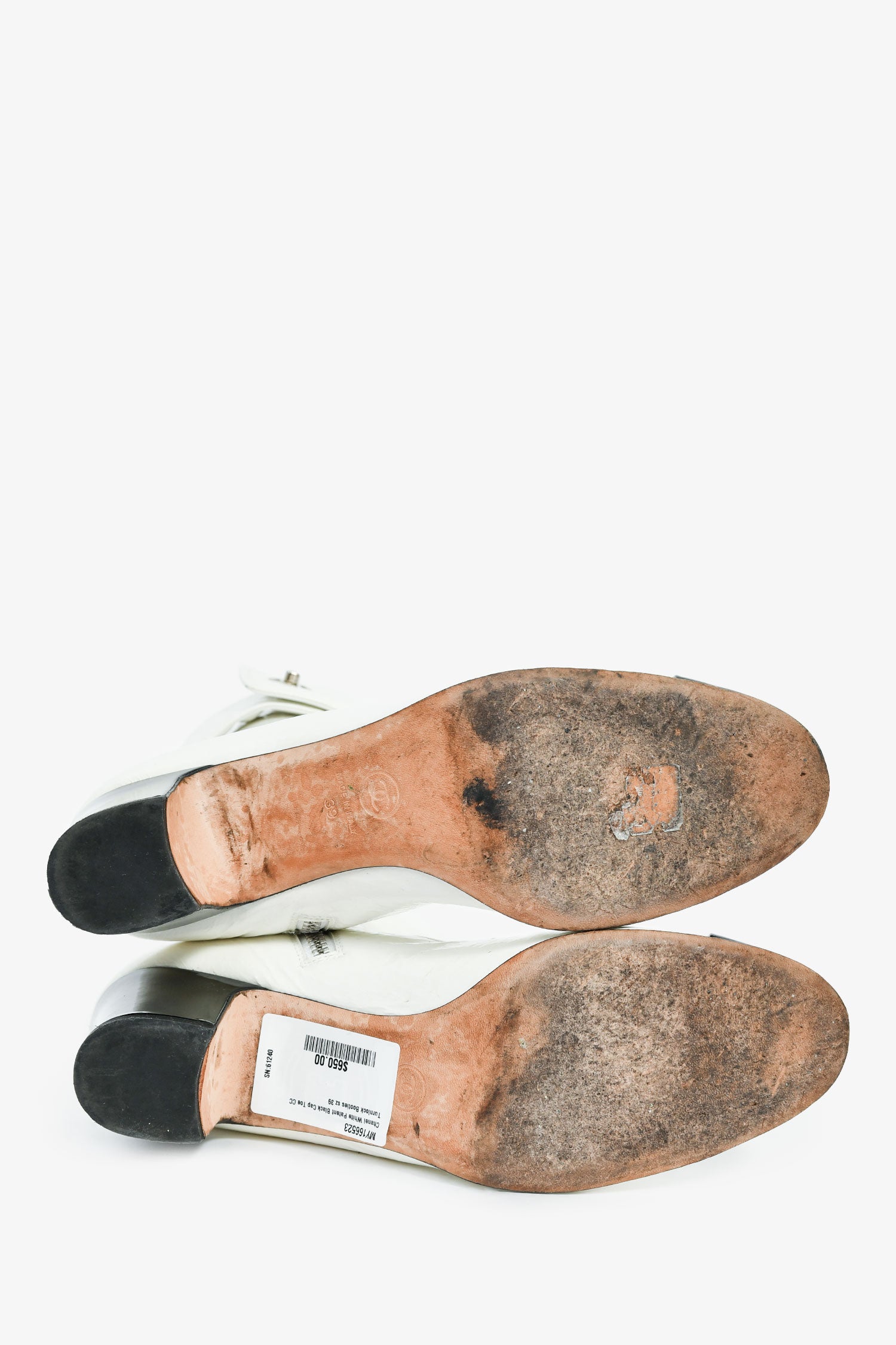 Pre-Loved Chanel™ White Patent Black Cap Toe CC Turnlock Booties Size 39