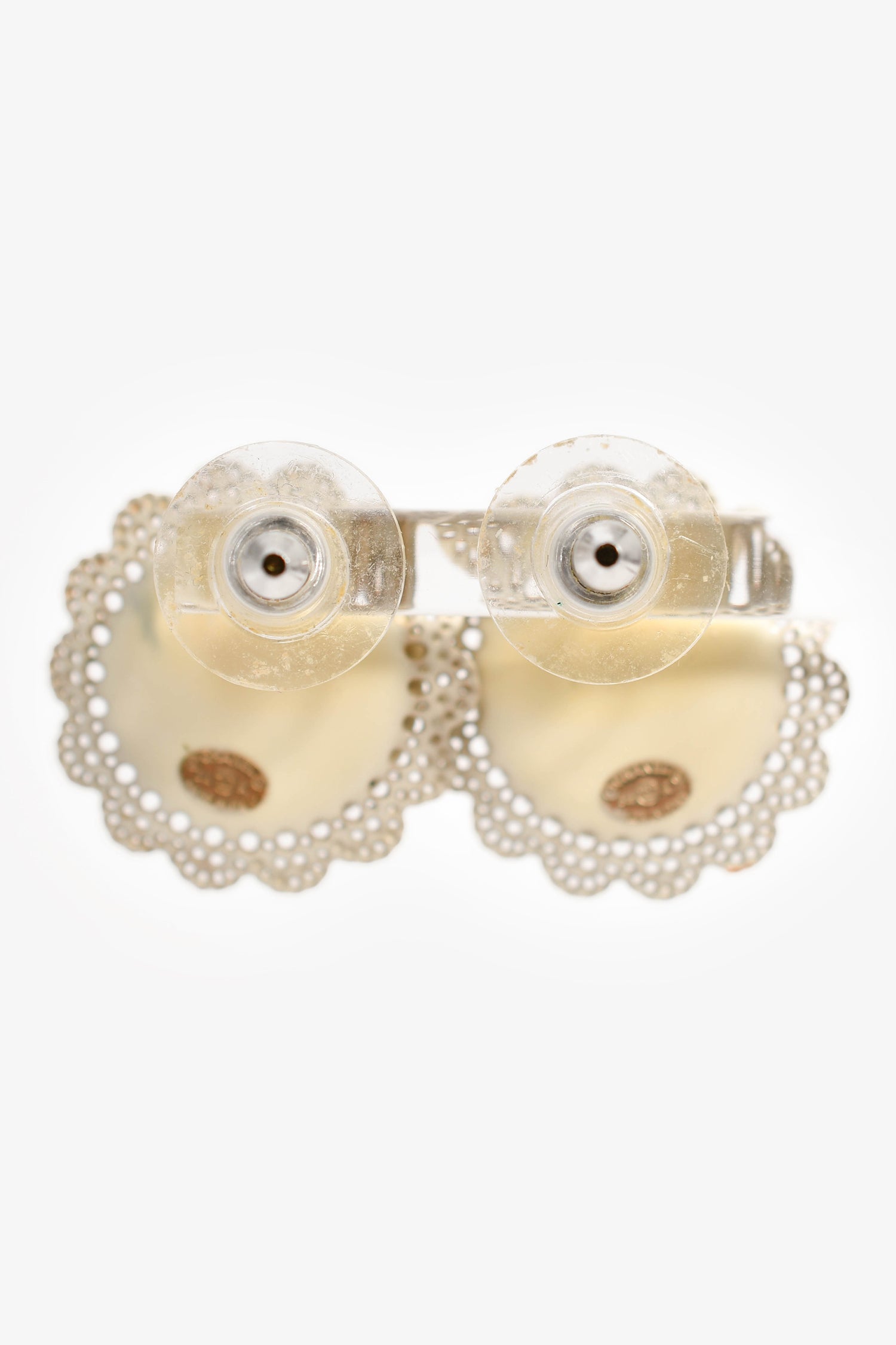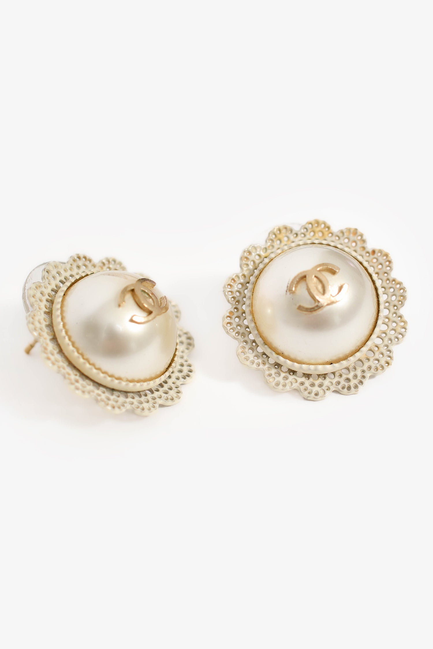 Refresh availabilityPre-Loved Chanel™ White Pearl Lace Flower CC Stud Earrings. Faux pearls. Gold-tone hardware. Post-stud closure.