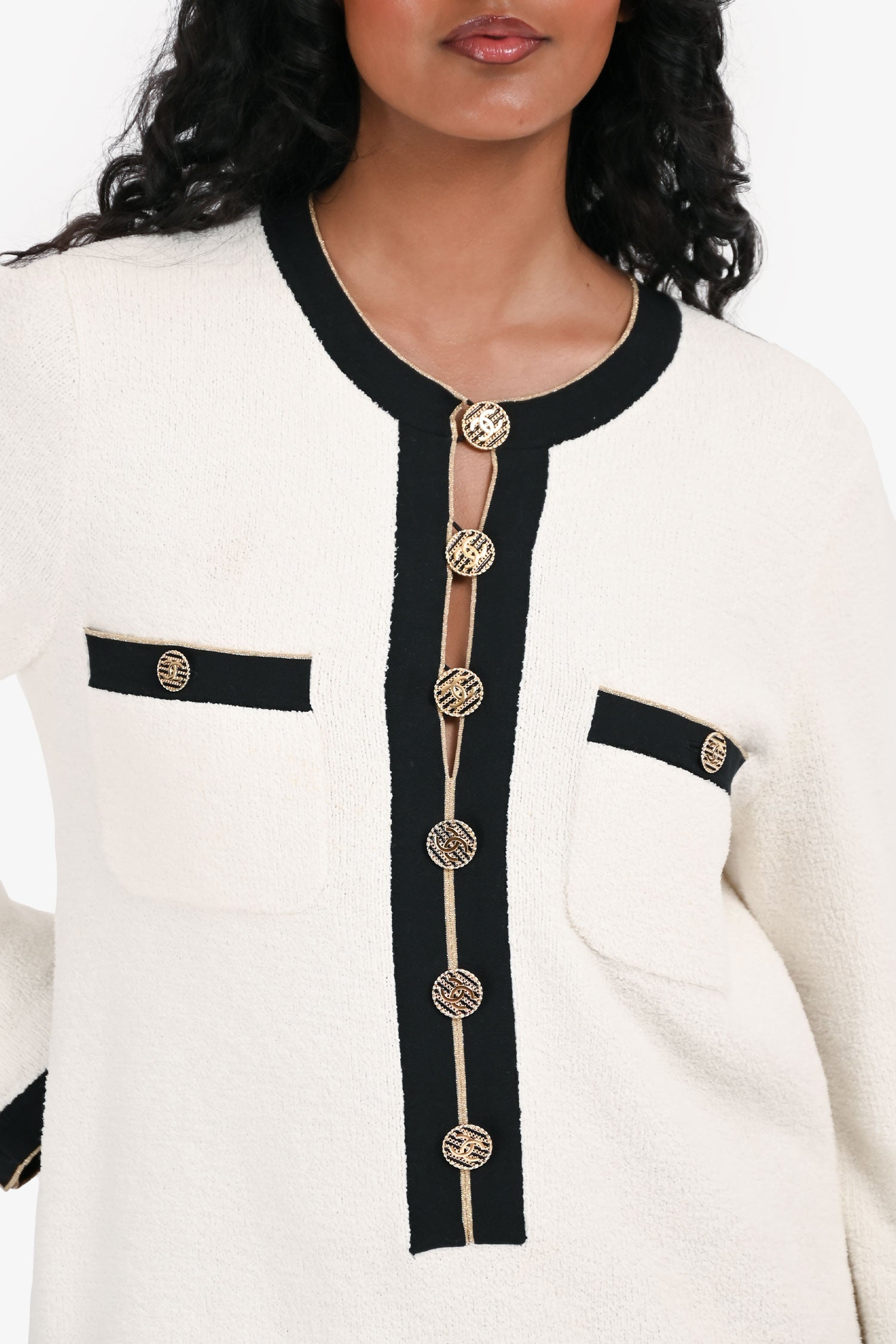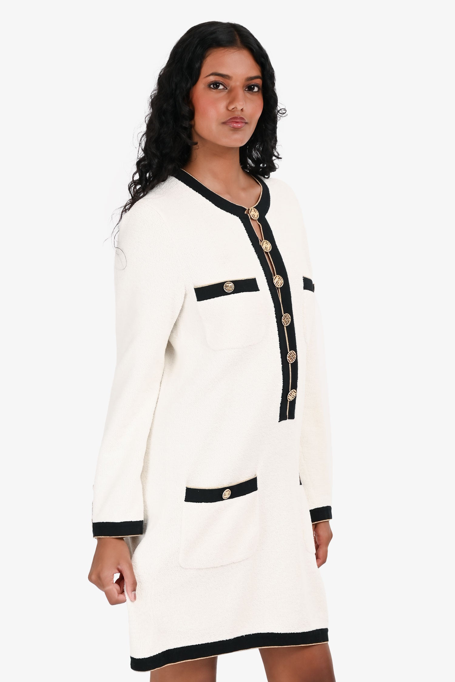 Pre-Loved Chanel™ White Terry Cloth Black/Gold Trim CC Button Cotton Knit Dress Size 36