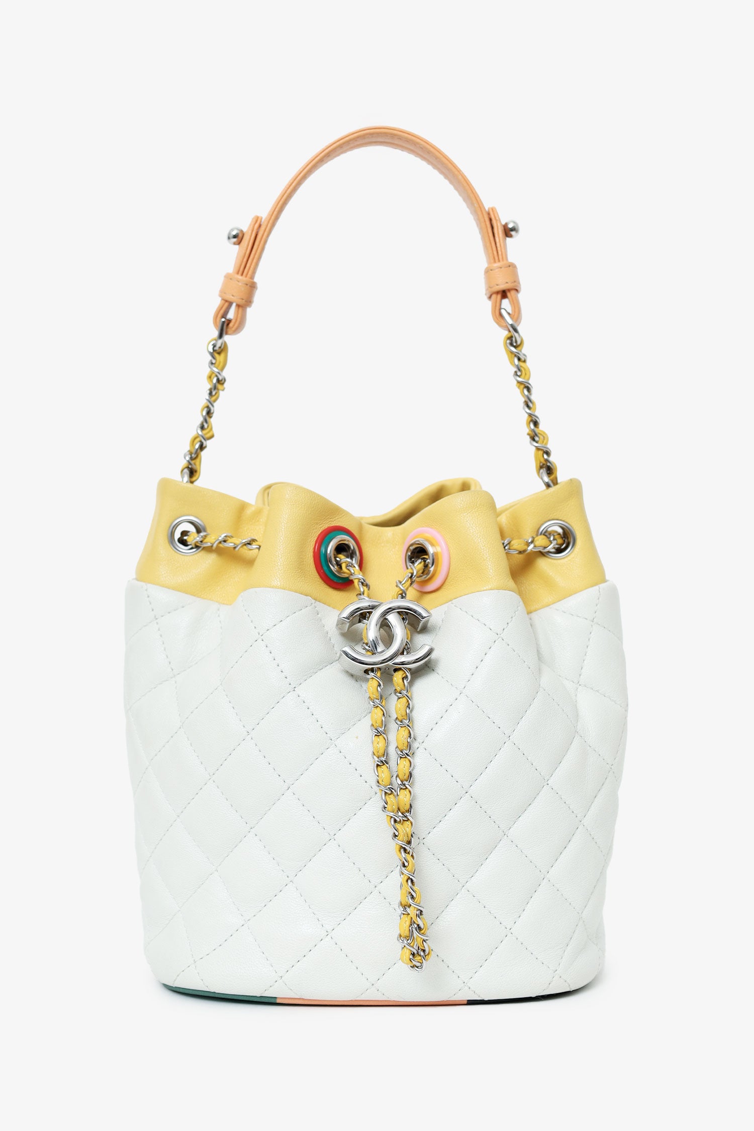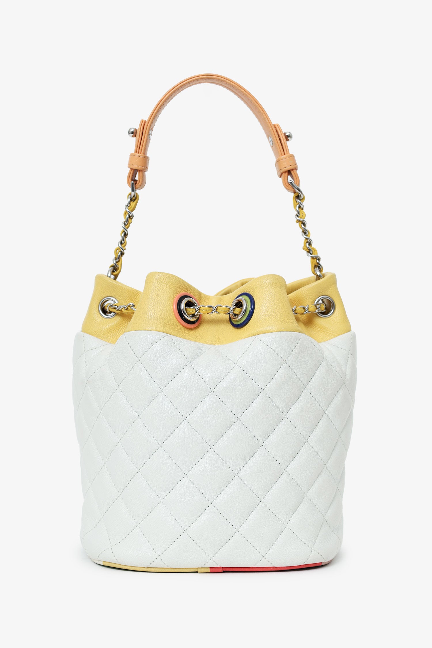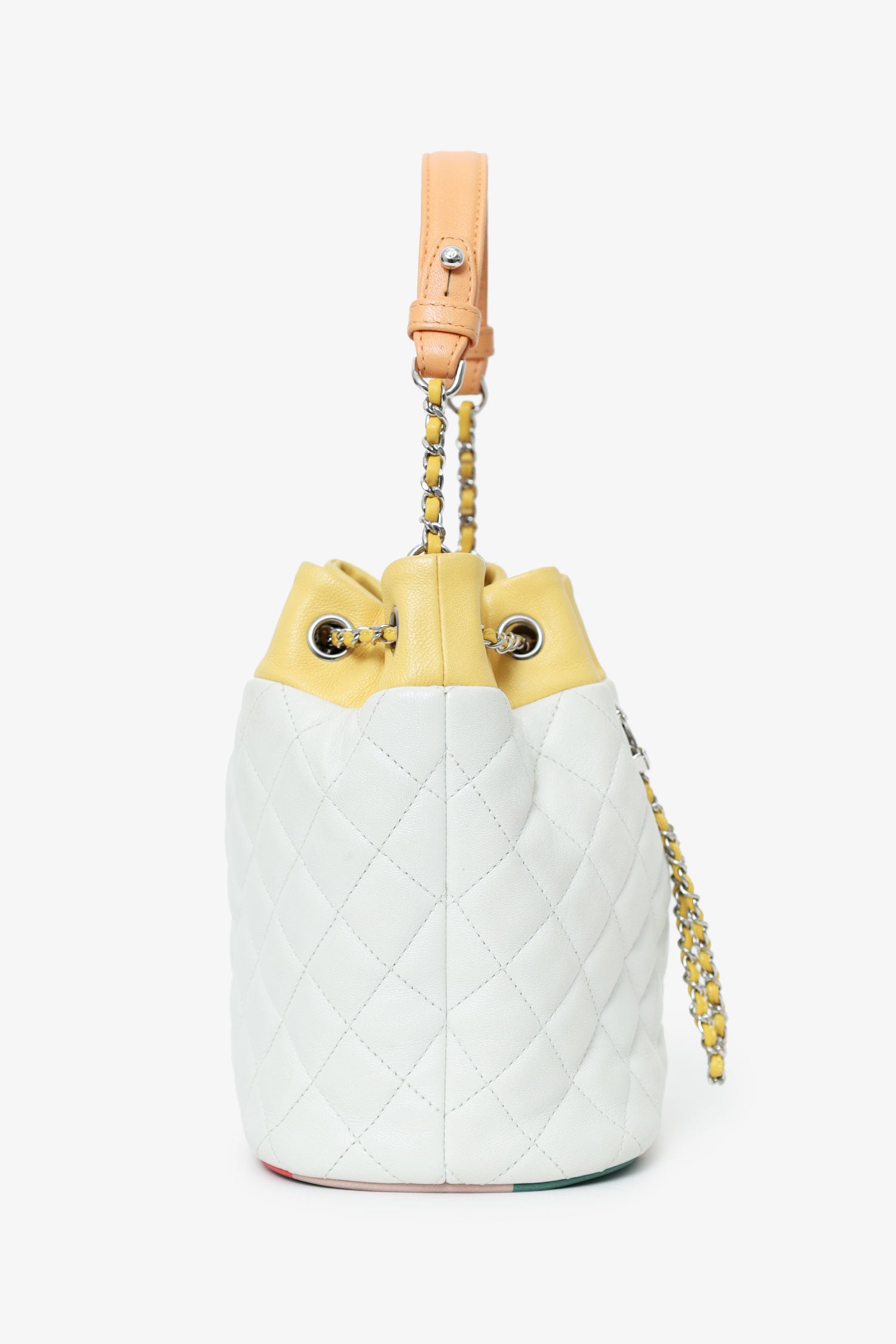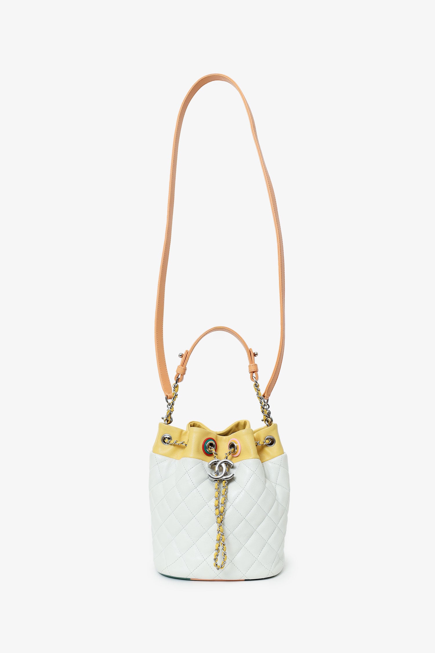 Refresh availabilityPre-Loved Chanel™ White/Yellow Leather Paris-Cuba Chain Bucket Bag. Top open. Top cinching closure with logo hardware. Leather top handle. Removable leather strap. Canvas-lined interior. Silver-tone hardware. Tonal stitching.