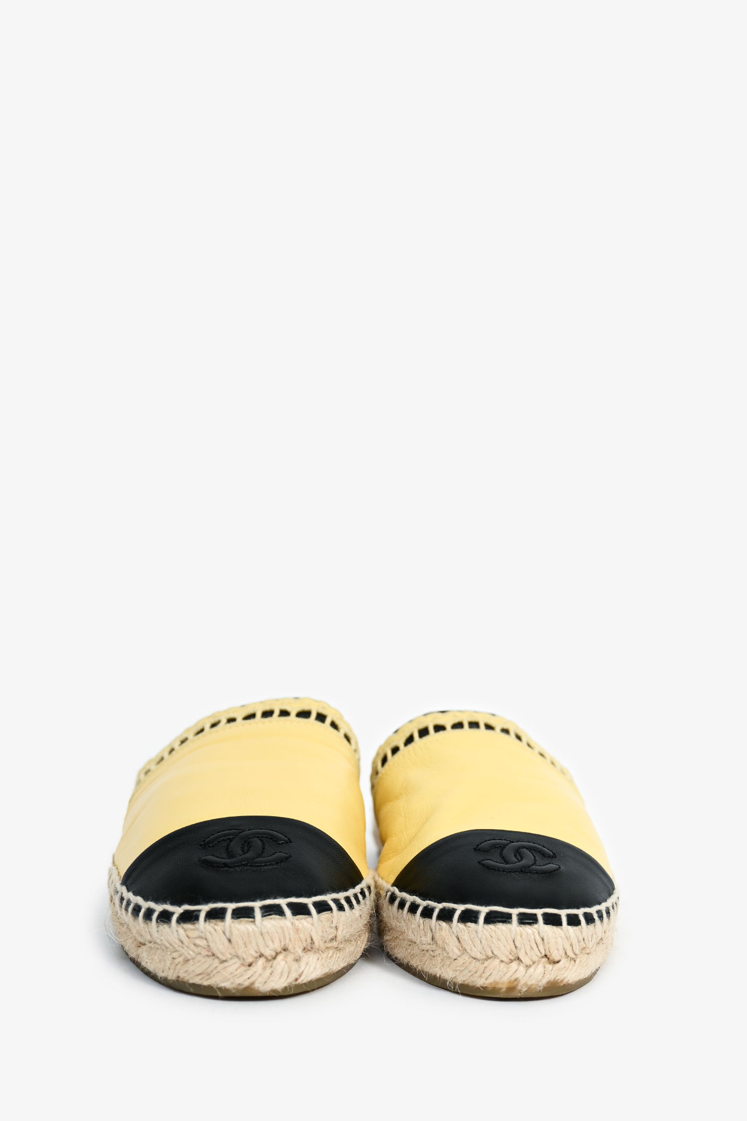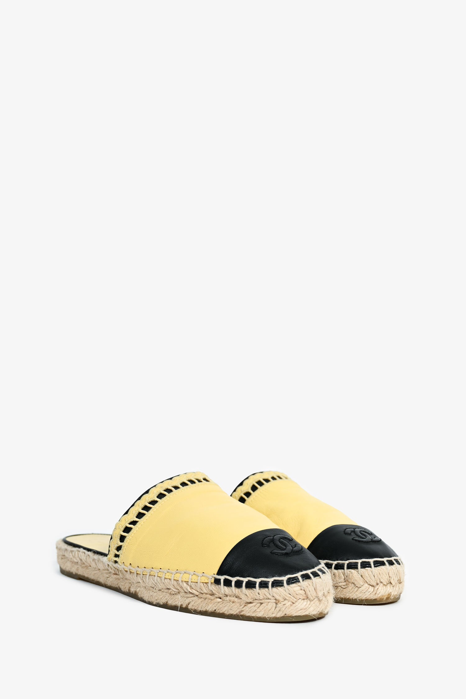 Refresh availabilityPre-Loved Chanel™ Yellow/Black Leather CC Espadrille Slides. Slip-on. Round toe. Tonal stitching.