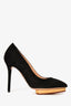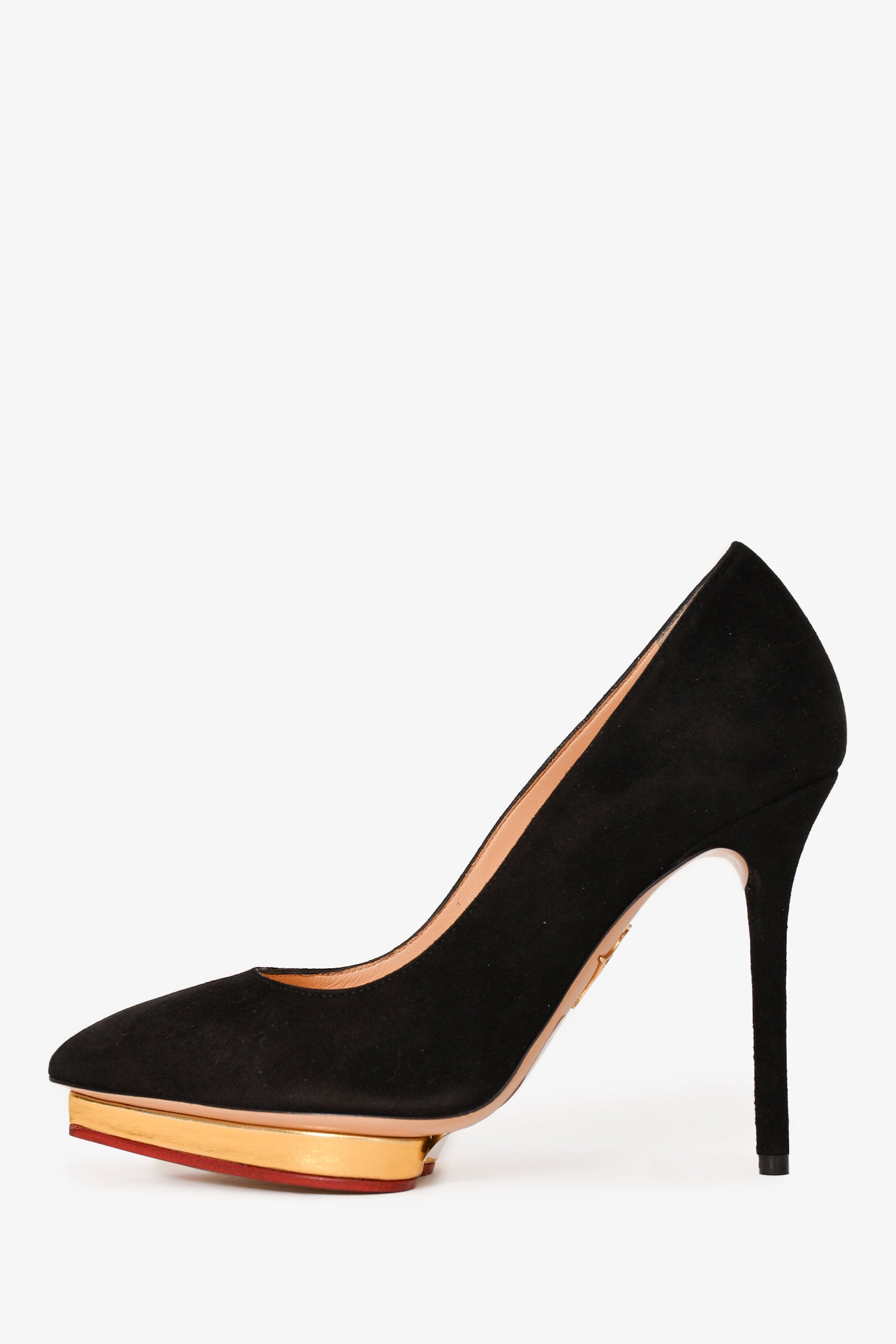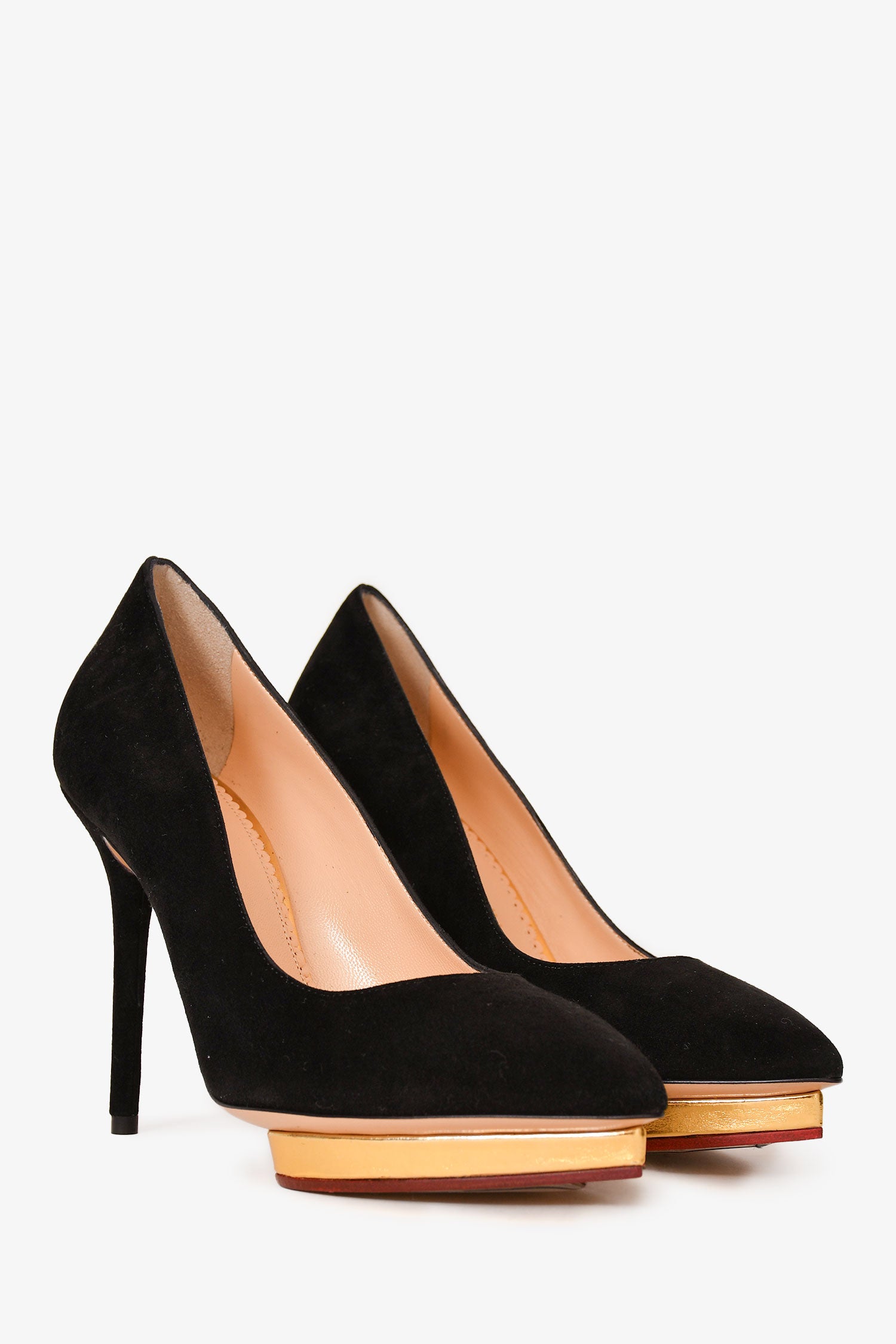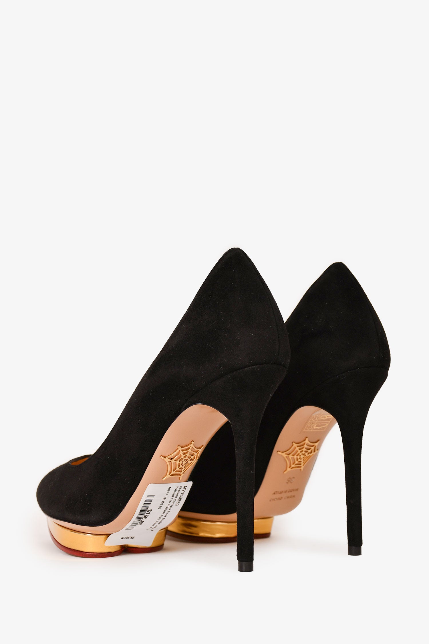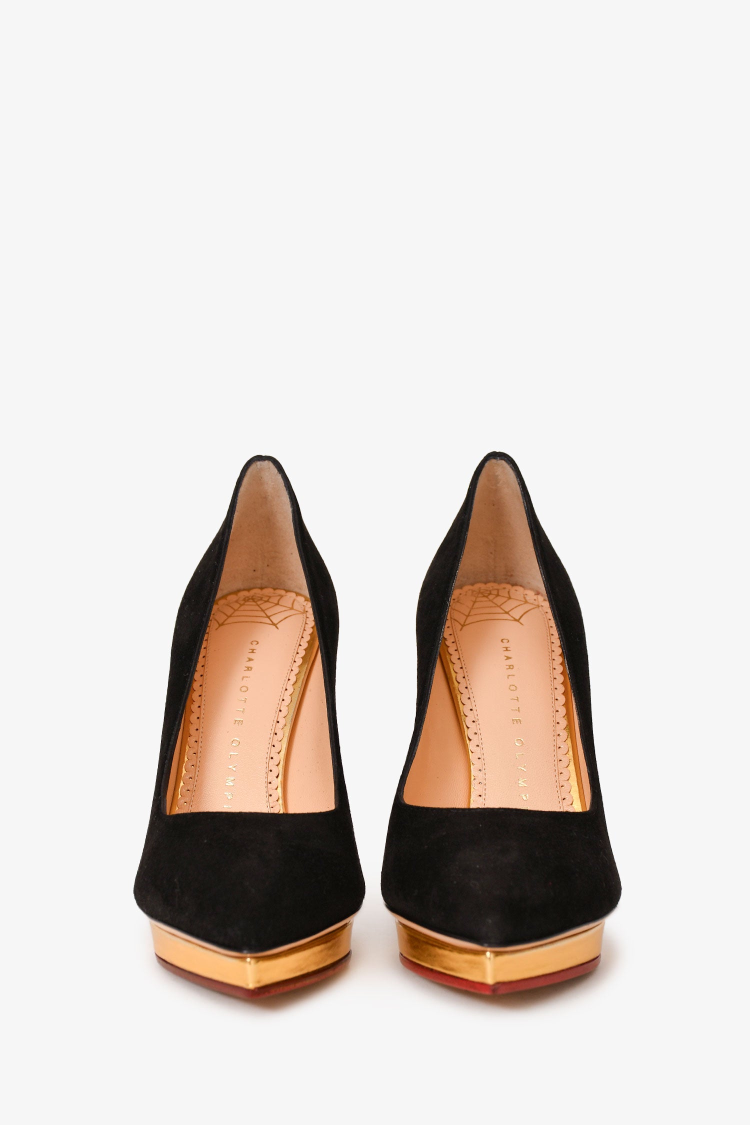 Refresh availabilityCharlotte Olympia Black Suede Leather Pointed Toe Platform Dolly Heels. Slip-on. Gold detail at soles. Tonal stitching.