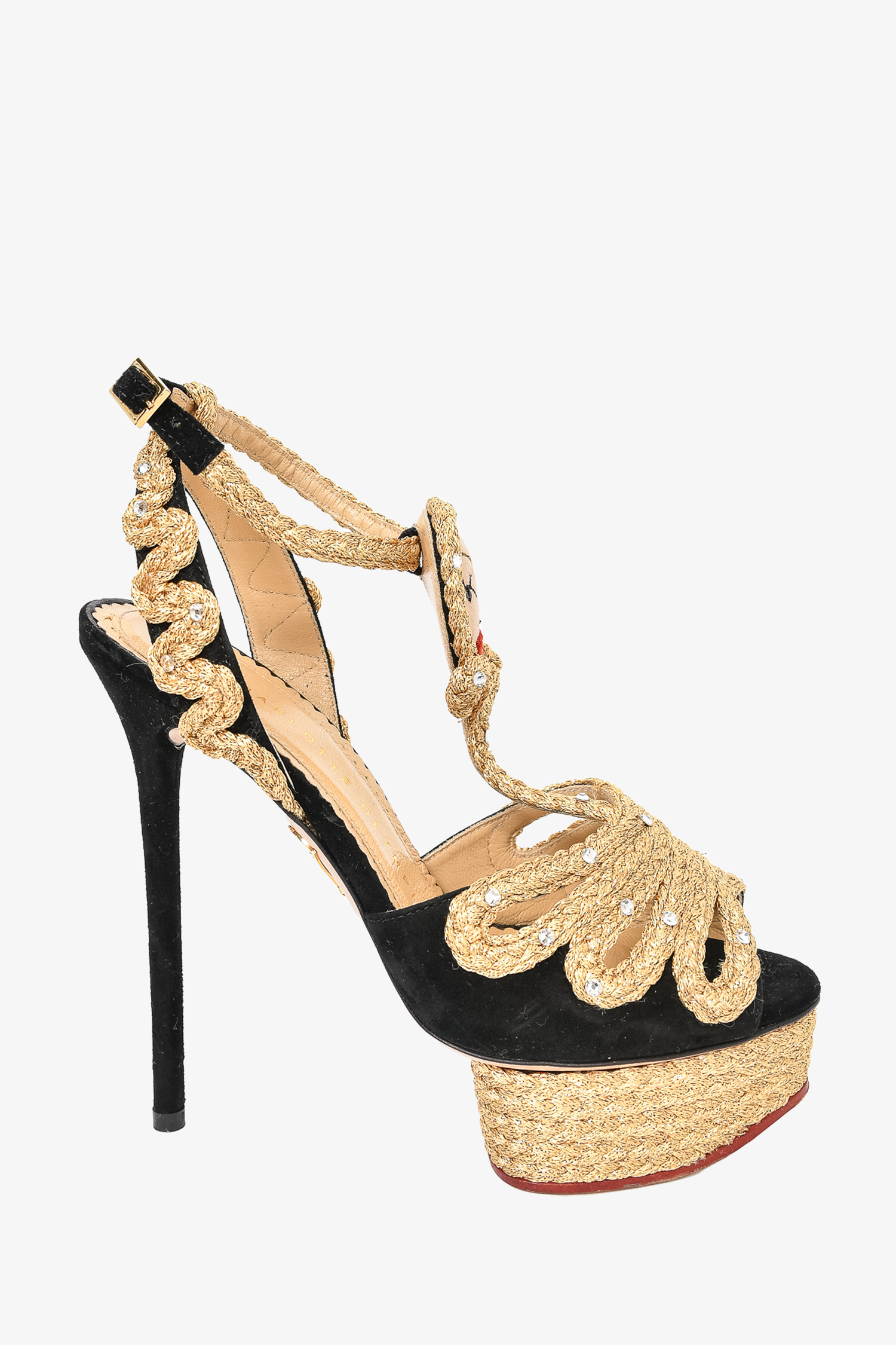Refresh availabilityCharlotte Olympia Gold Metallic 'Doll' Platform Heels. Peep-toe. Ankle strap with buckle closure. Tonal stitching.