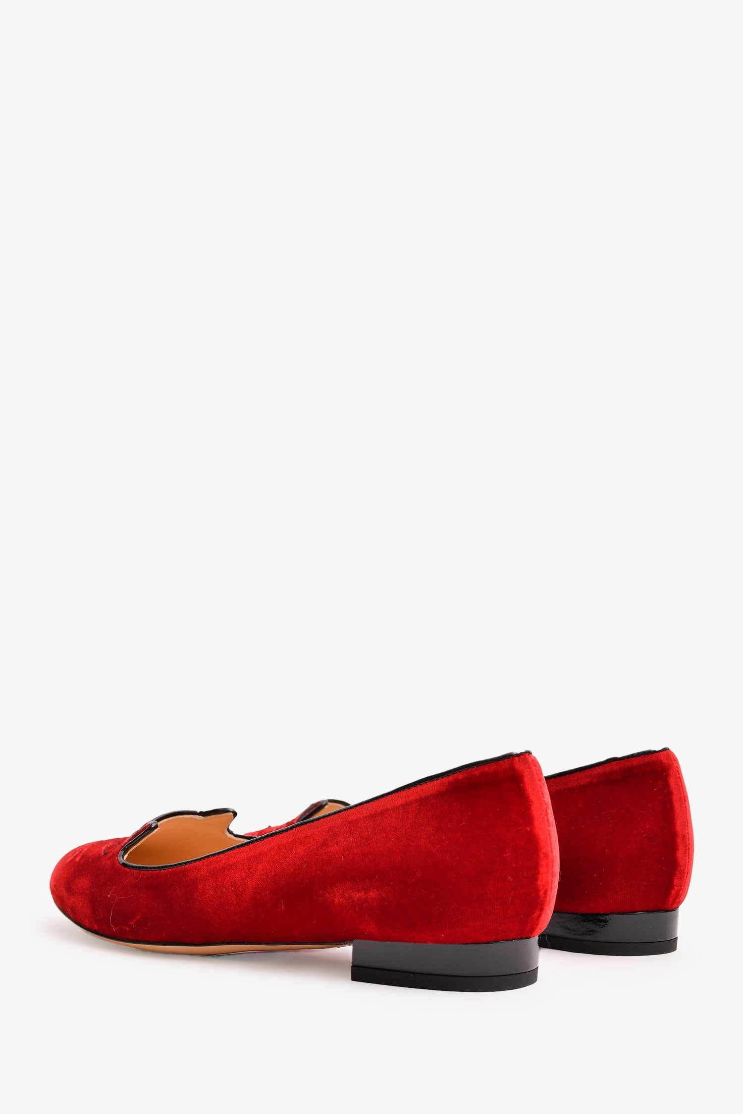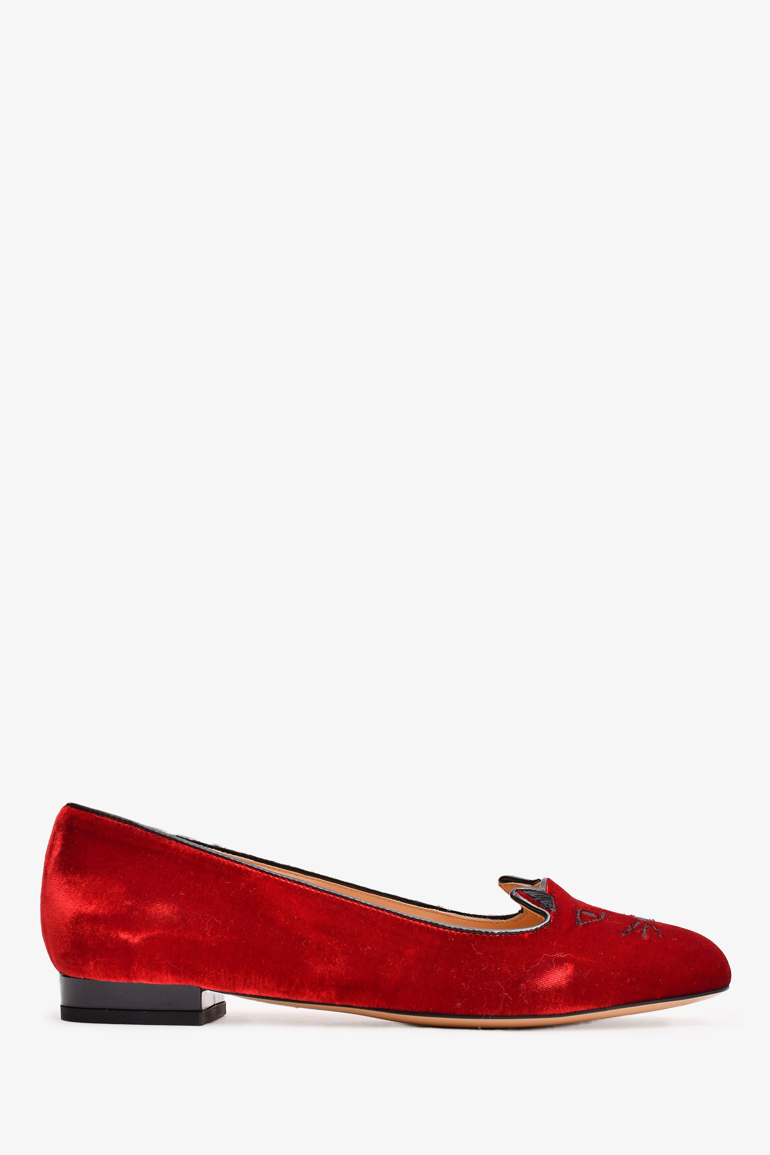 Refresh availabilityCharlotte Olympia Red Velvet Leather Kitty Flats. Round toe. Slip on.