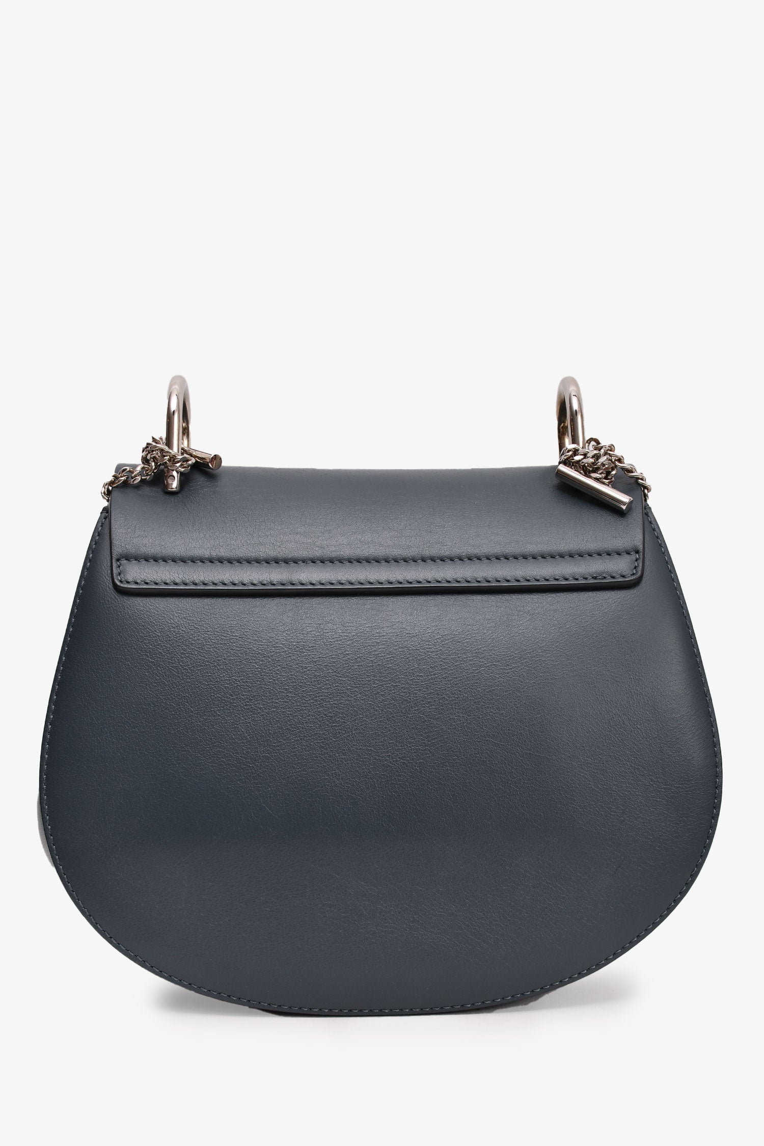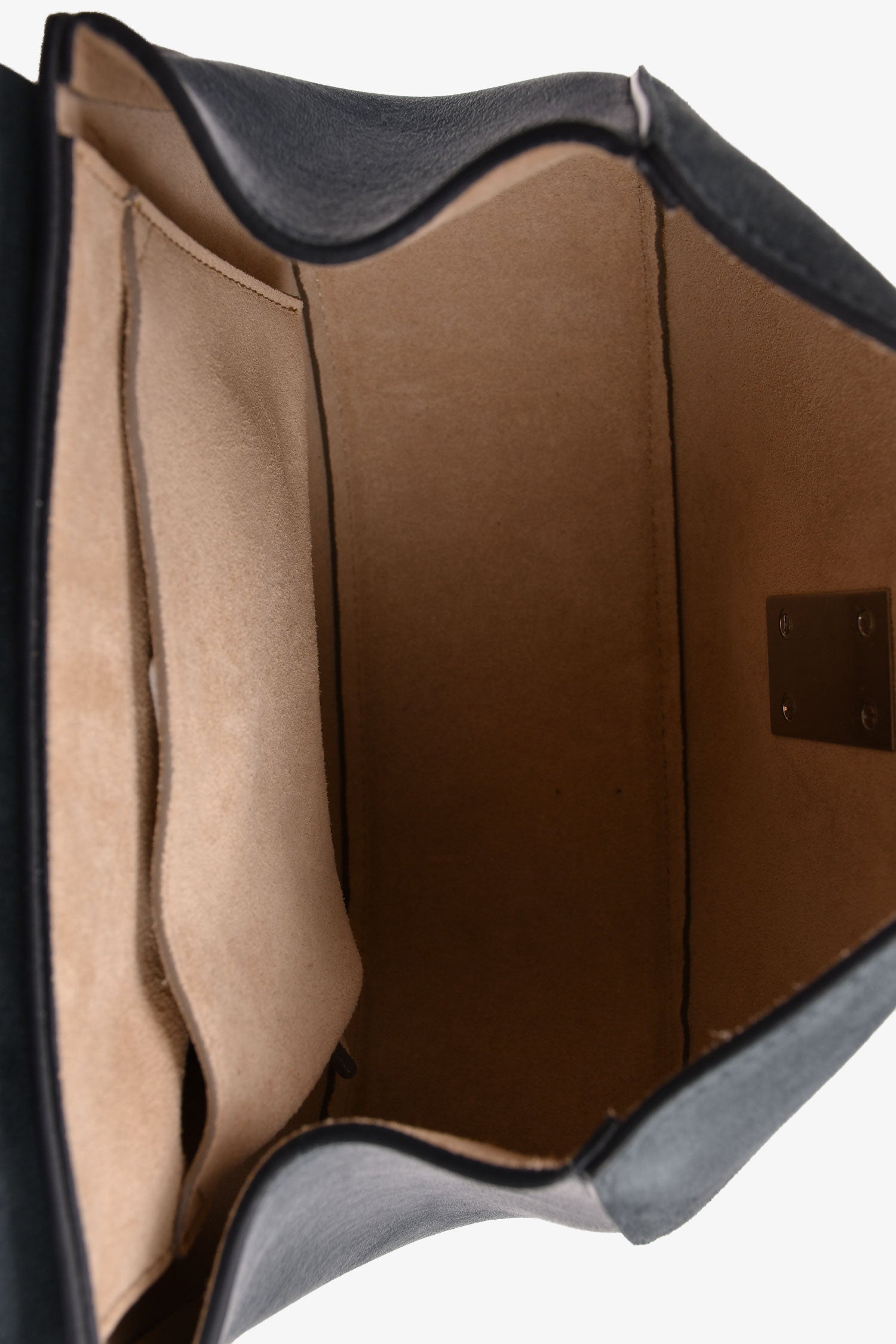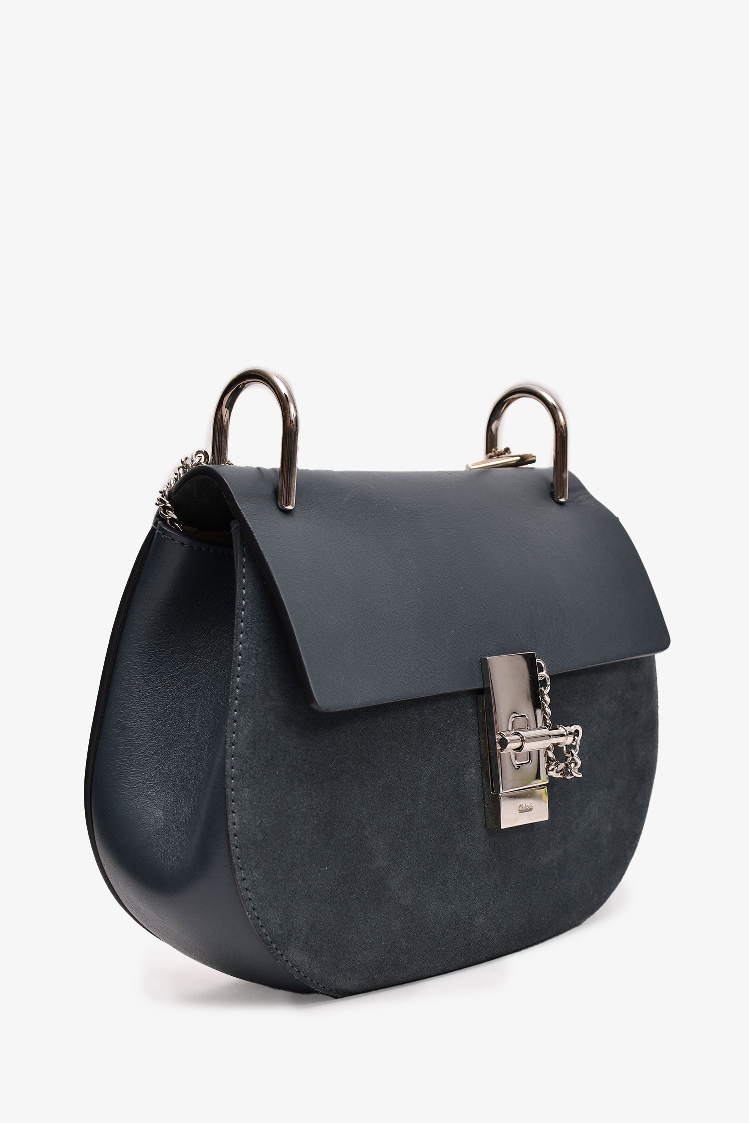 Refresh availabilityChloe 2016 Navy Suede/Leather Drew Crossbody. Front fold-over flap with turn-lock closure. Beige suede interior lining. Single interior wall flap with slip-pocket. Silver-tone hardware.