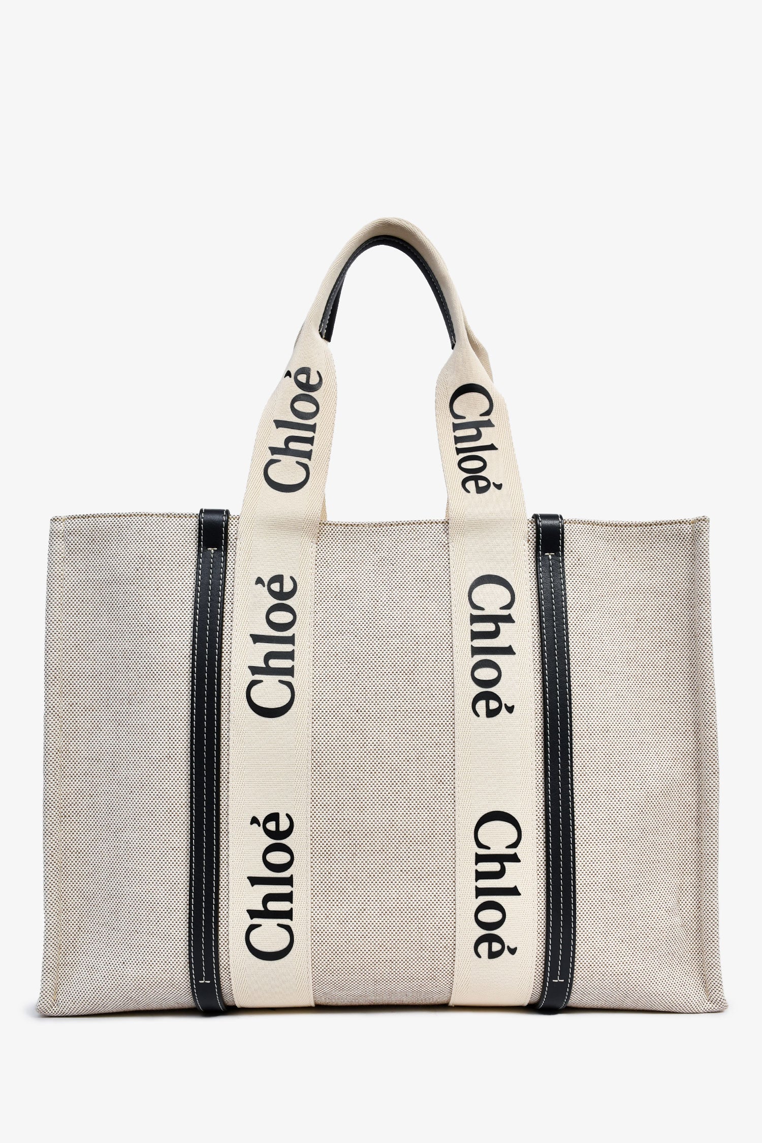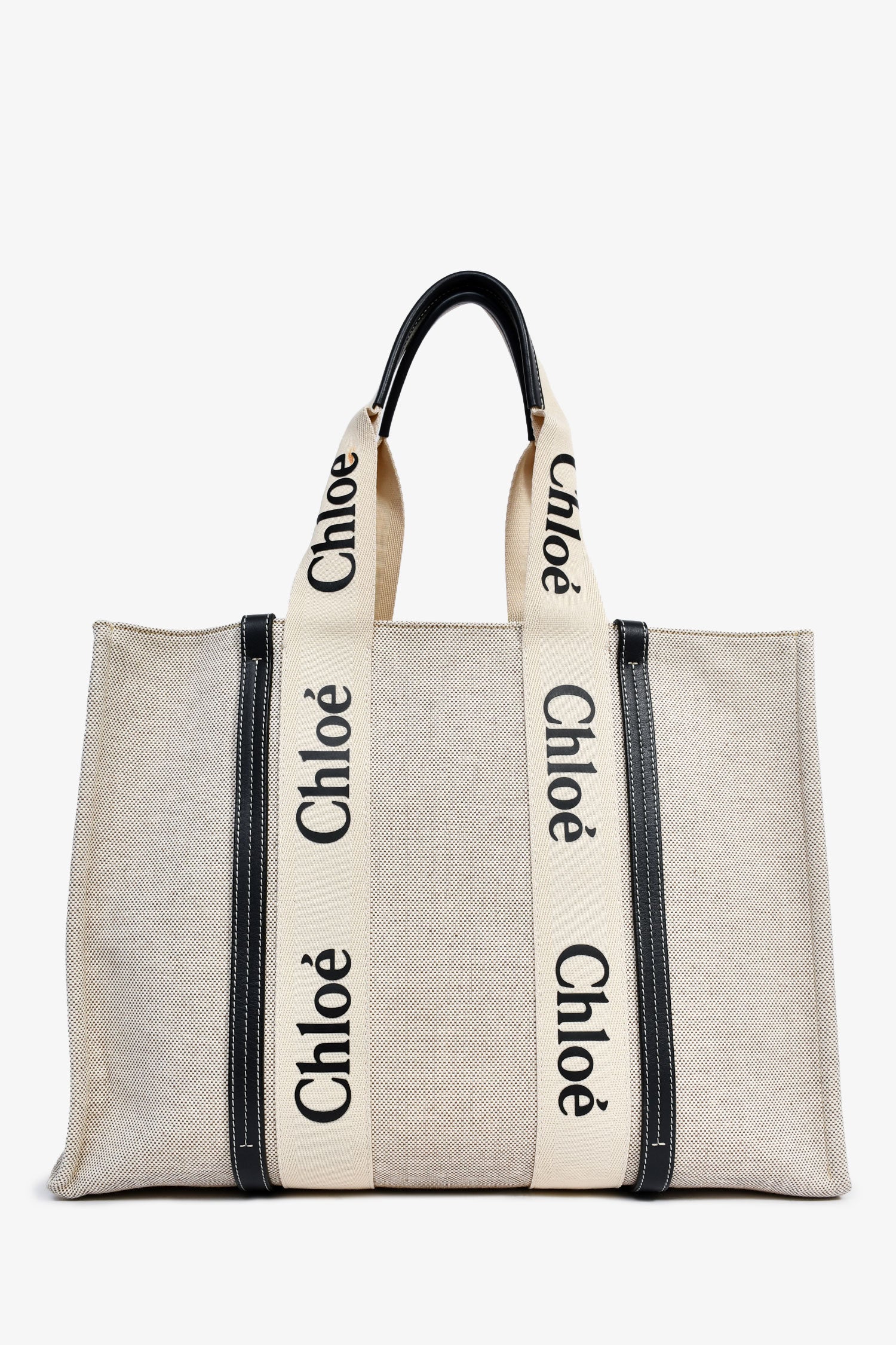 Refresh availabilityChloe Beige Fabric Black Leather Trim Logo Woody Large Tote. Canvas shoulder straps. Leather trim. Canvas-lined interior. Pressed 'Chloe' logo. Tonal and contrast stitching.