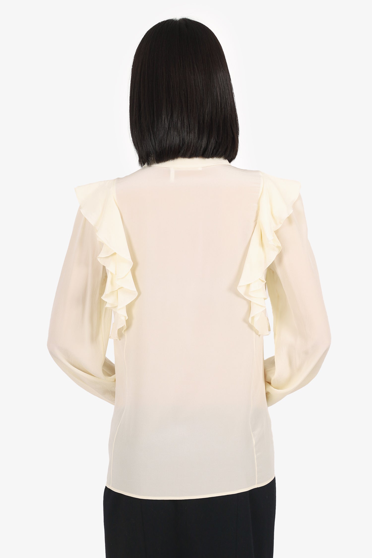 Refresh availabilityChloe Beige Silk Ruffled Blouse. Pull-on. Collared-neckline. Front button-up closure. Sleeve cuffs with button-up closure. Tonal stitching.