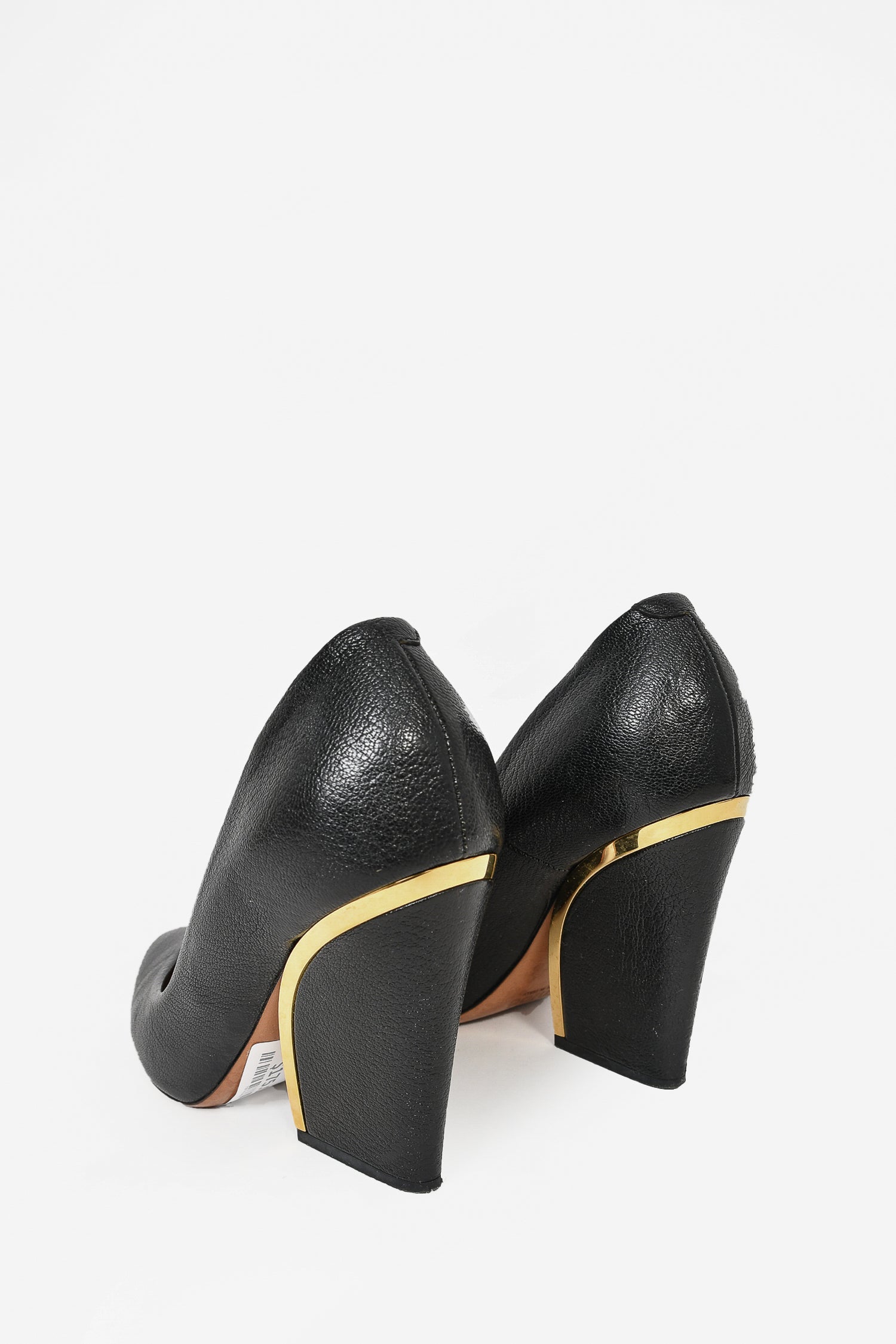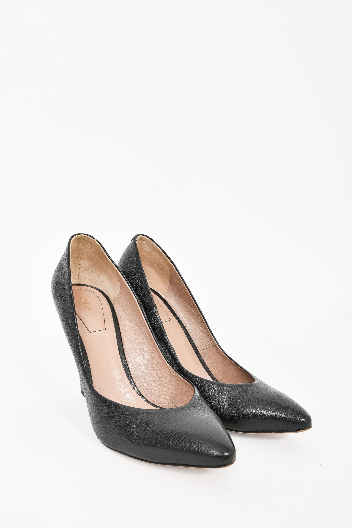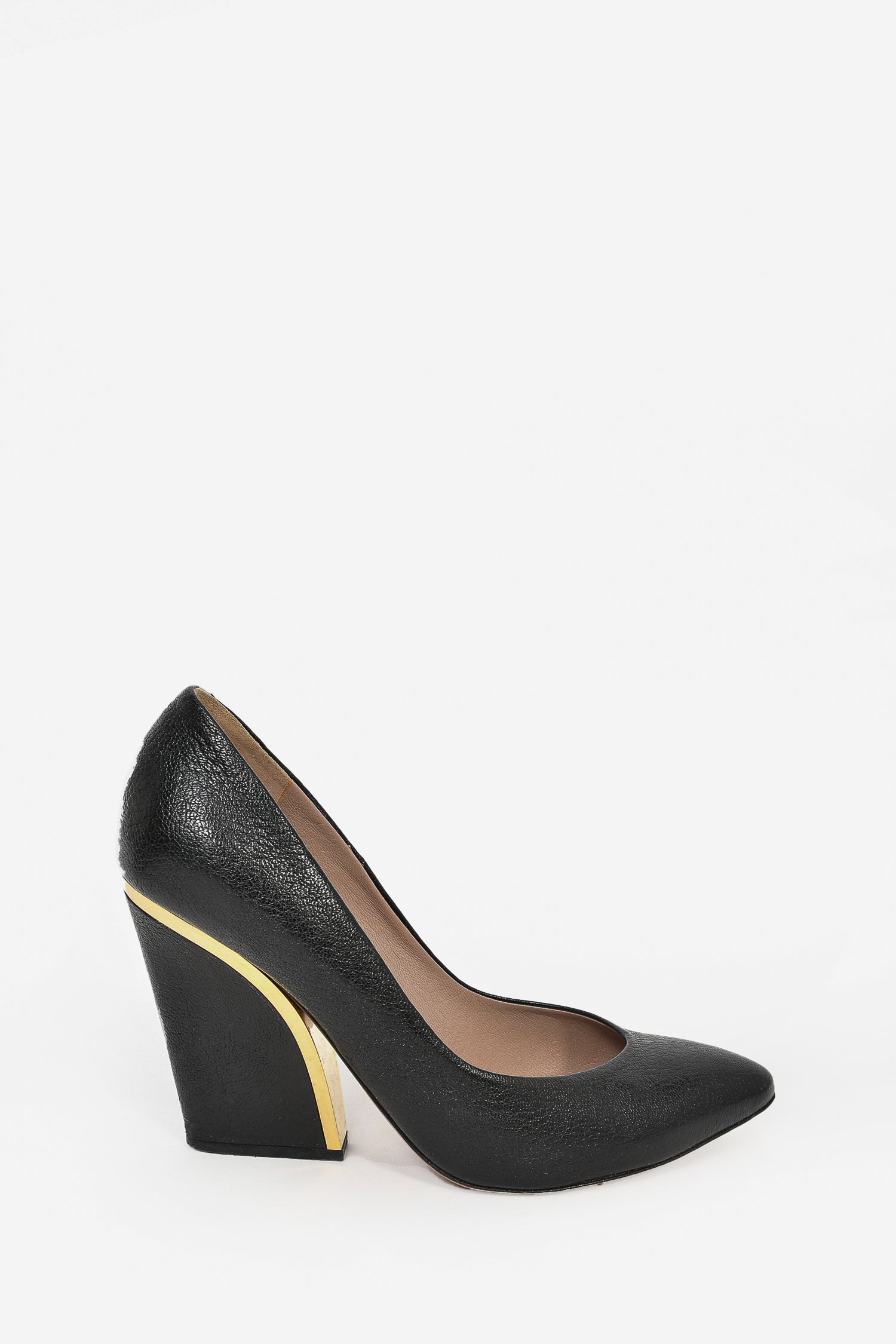 Refresh availabilityChloe Black Grained Leather Pointed Toe Heels. Slip-on. Gold-tone hardware accent on heel. Tonal stitching.