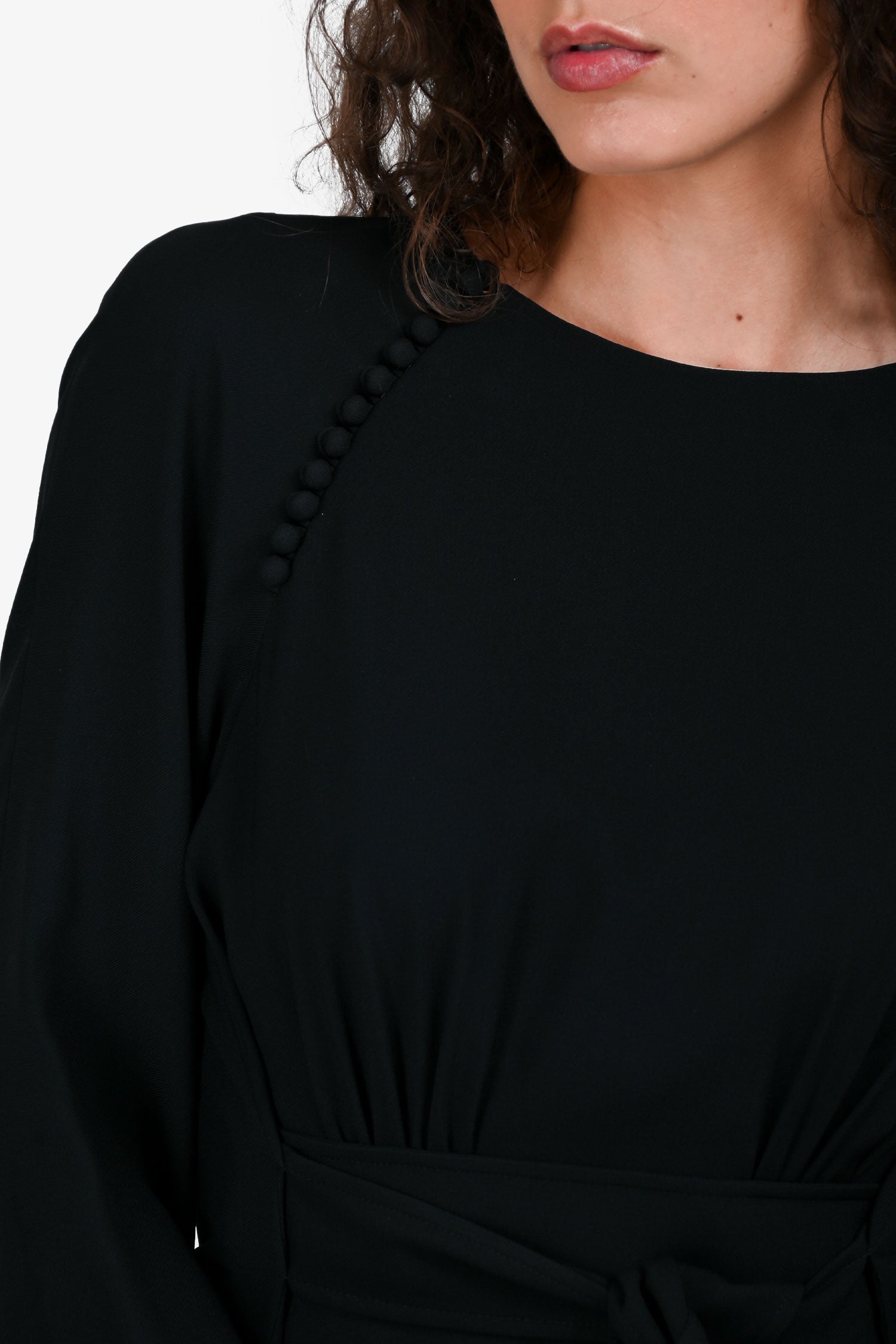 Refresh availabilityChloe Black Long Sleeves Mini Dress. Crew neckline. Long sleeves with button cuffs. Attached waist belt. Tonal stitching.