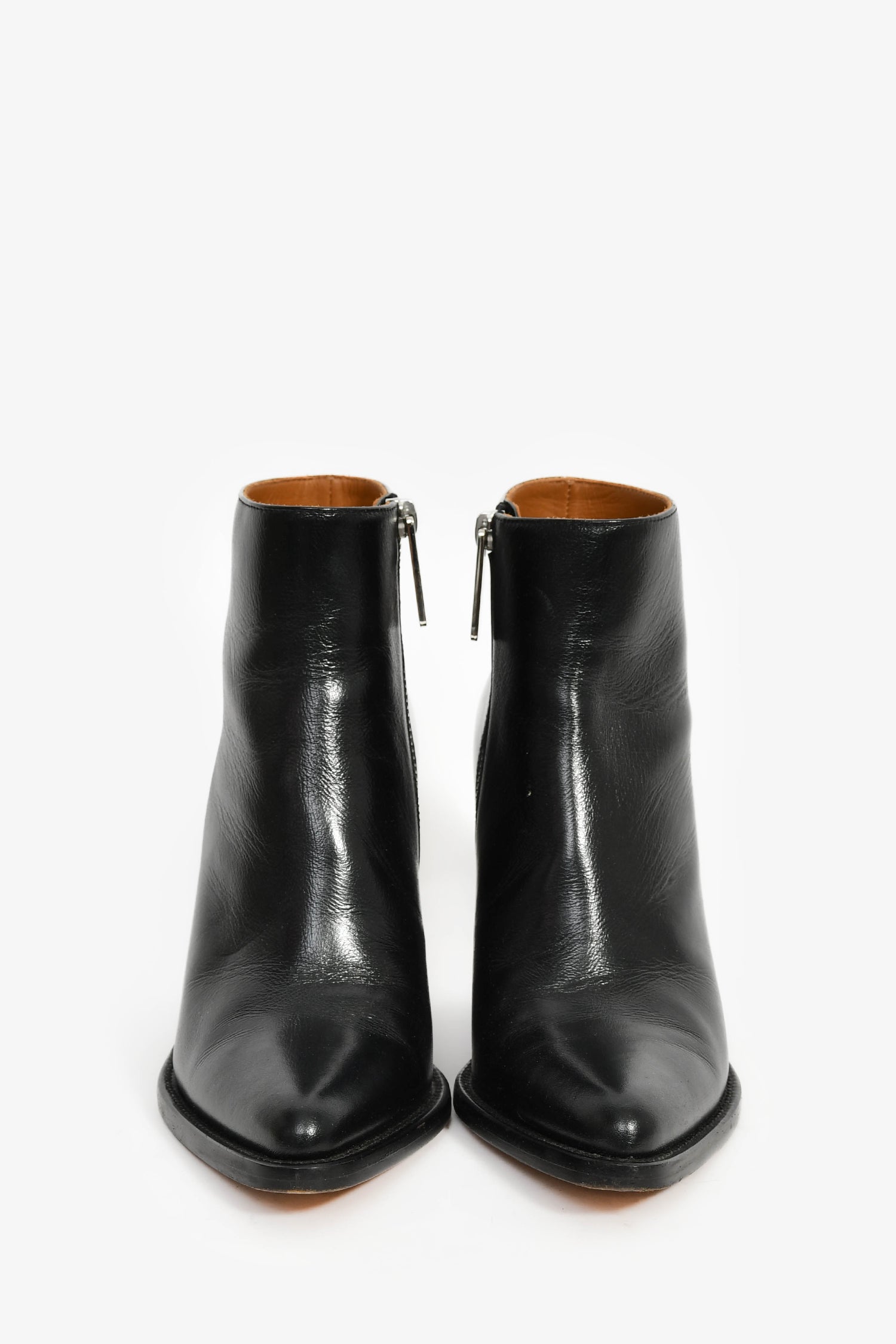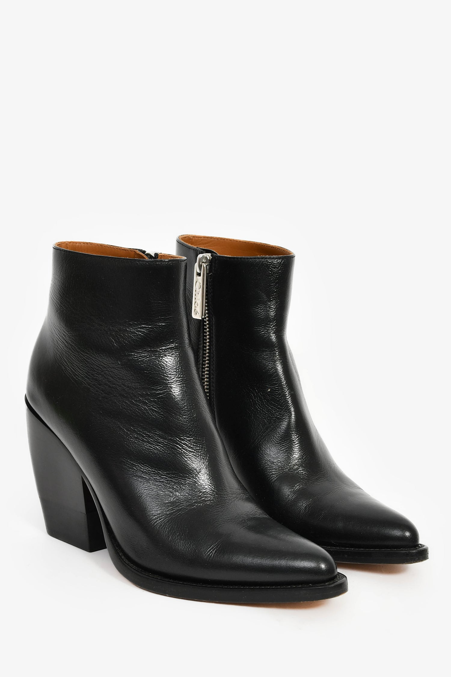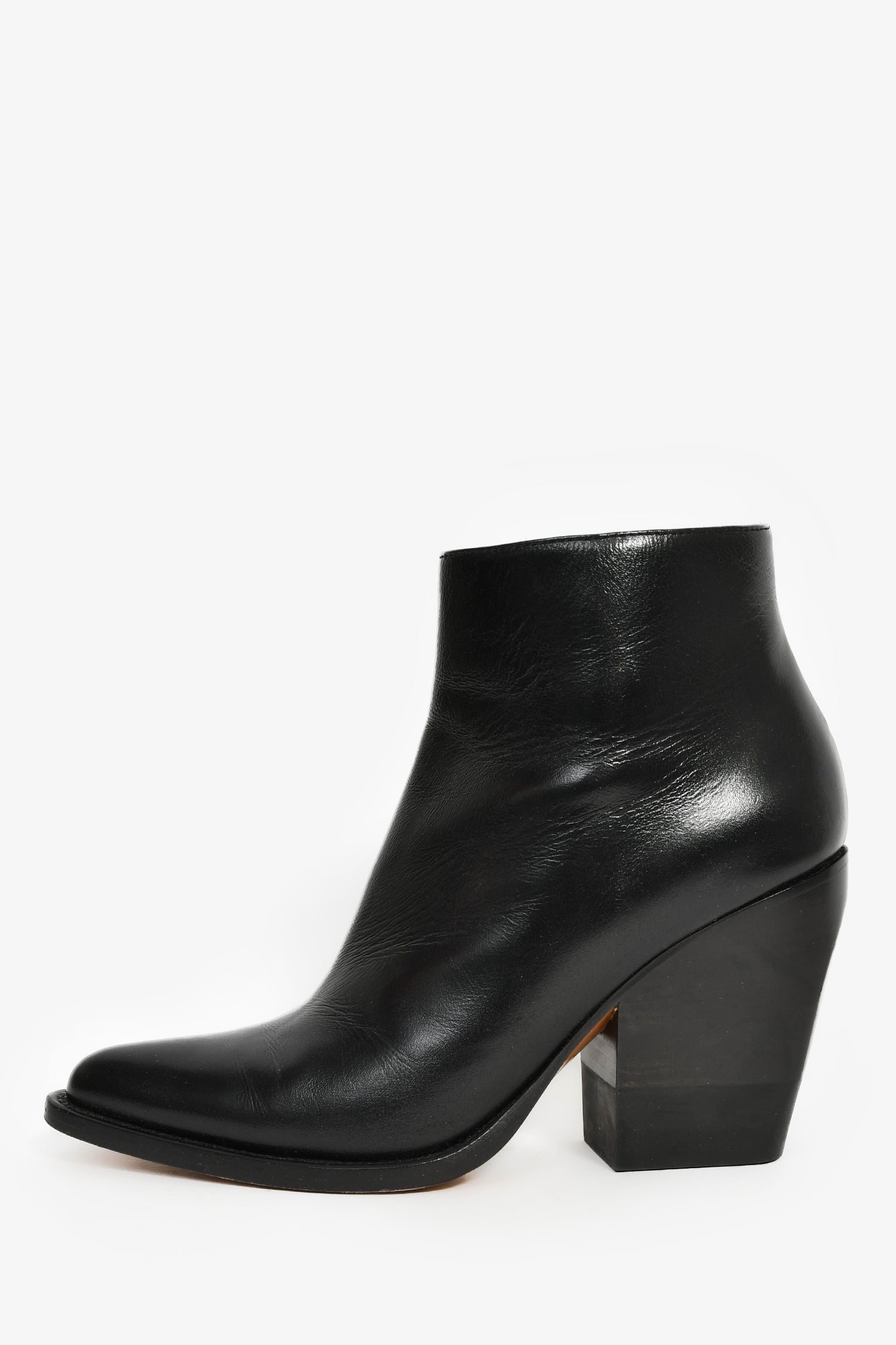 Refresh availabilityChloe Black Leather Pointed Heeled Booties. Slip-on. Pointed toe. Side zip closure. Silver-tone hardware. Tonal stitching.