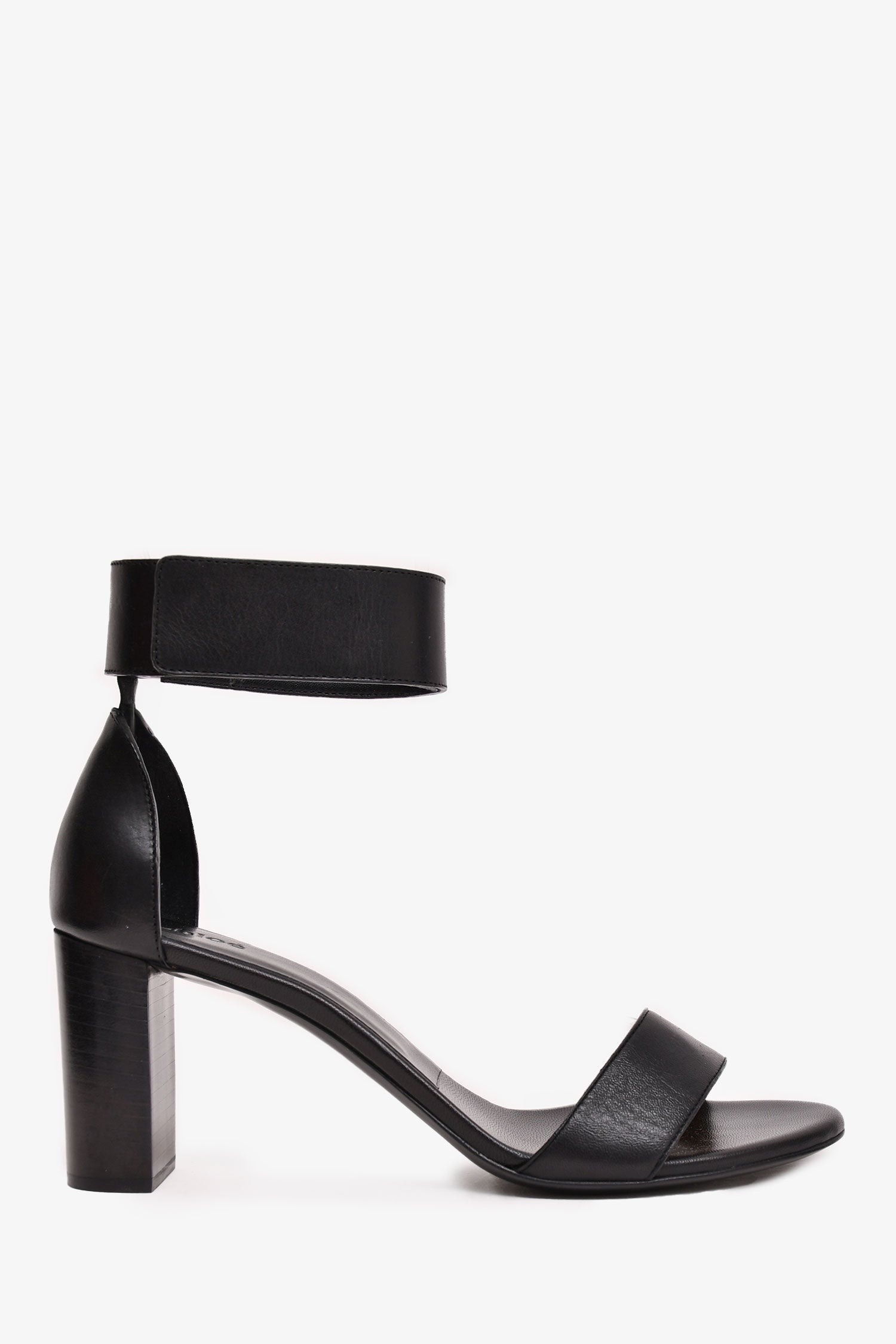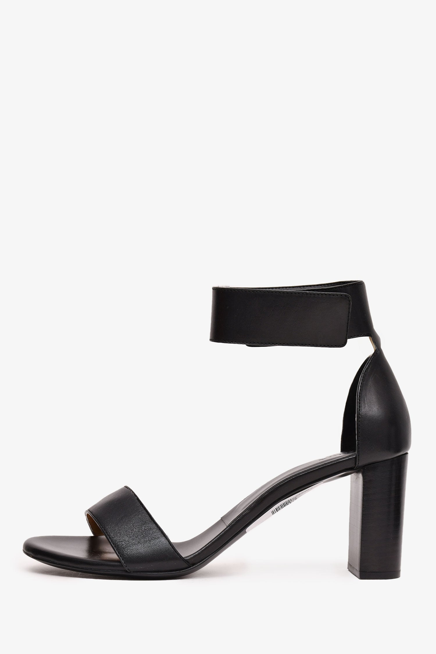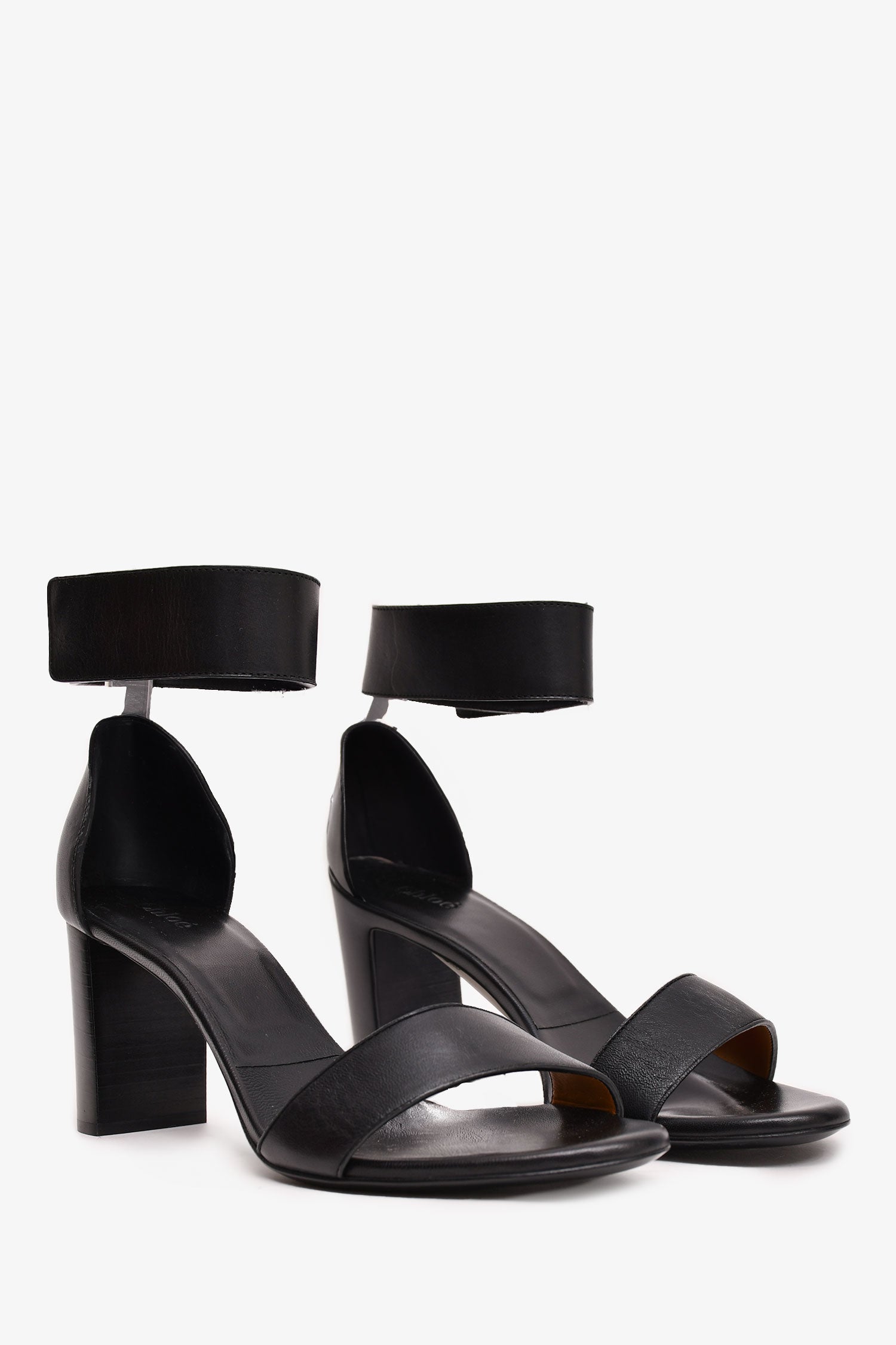 Refresh availabilityChloe Black Leather Strap Detail Block Heels. Almond toe front. Covered leather block heel. Leather ankle strap with a velcro fastening. Lined leather interior with a 'Chloe' stamp.