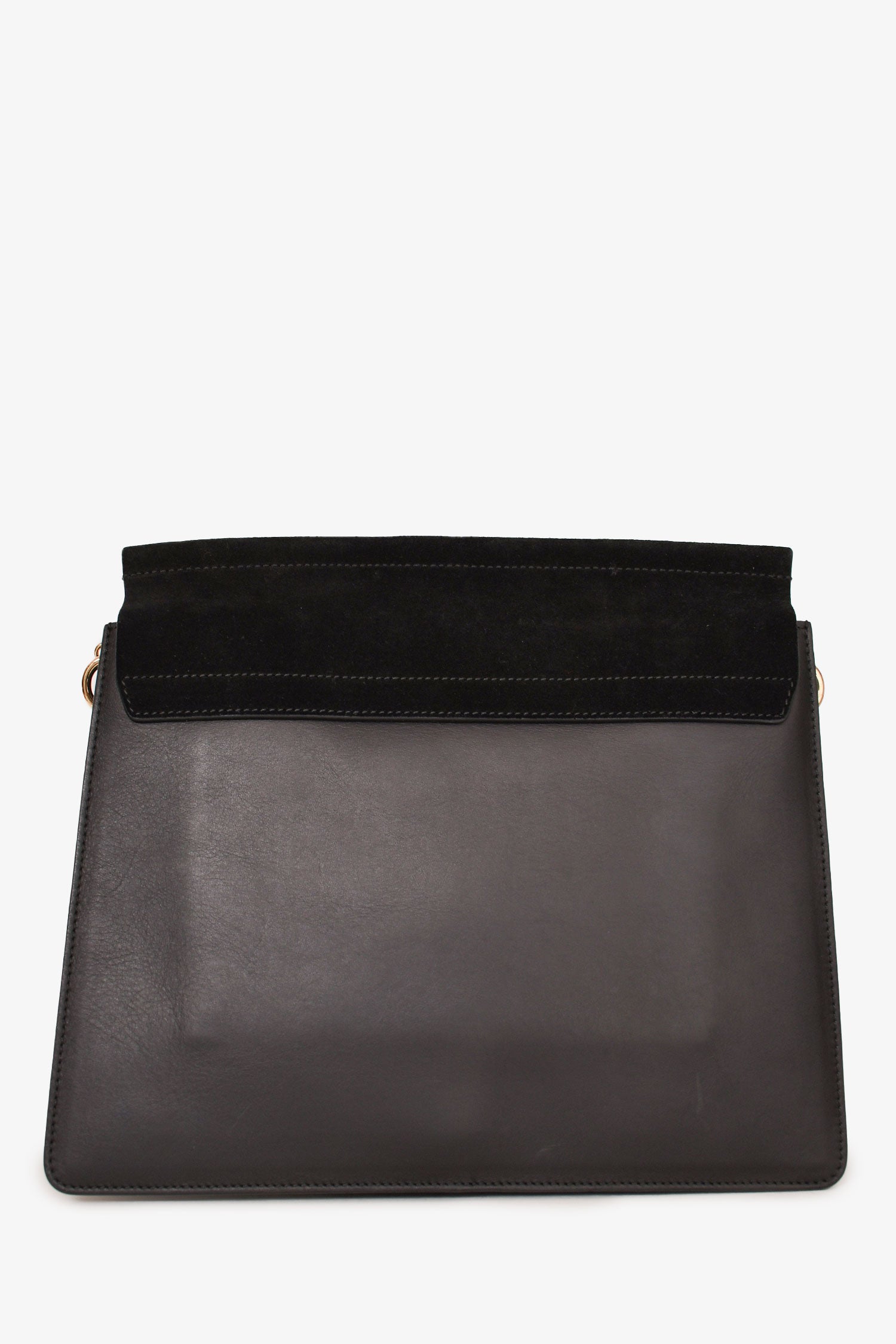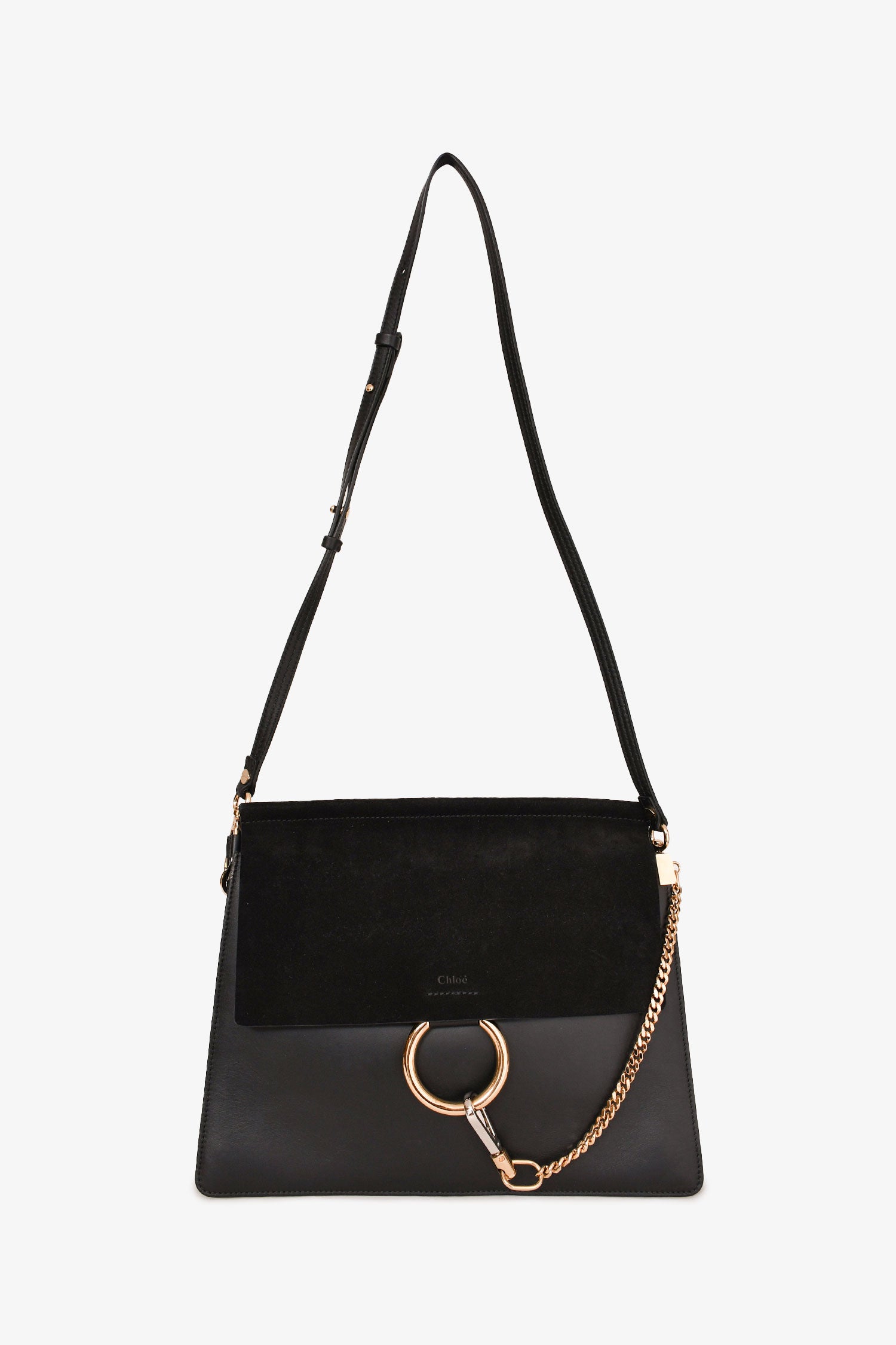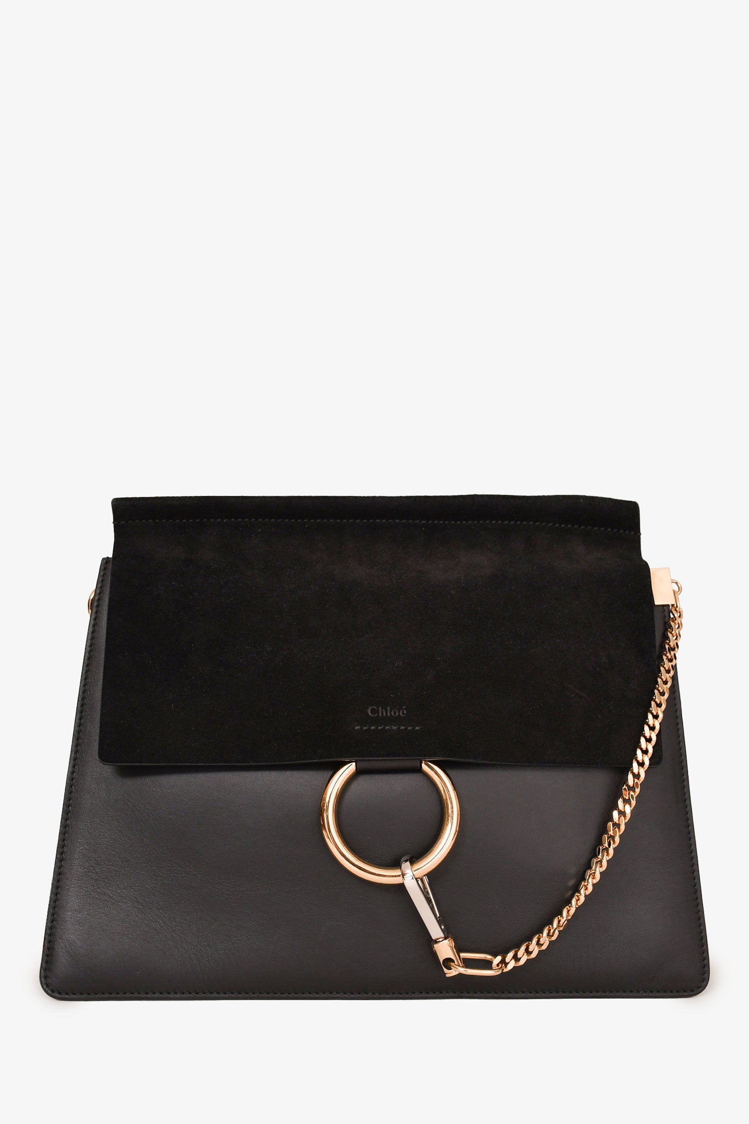 Refresh availabilityChloe Black Leather Suede Medium Faye Bag. Silver and gold-tone hardware. Snap closure. Suede trimming. 3 interior compartments. 1 zipped compartment. Suede-lined interior. Comes with a strap. Tonal stitching.