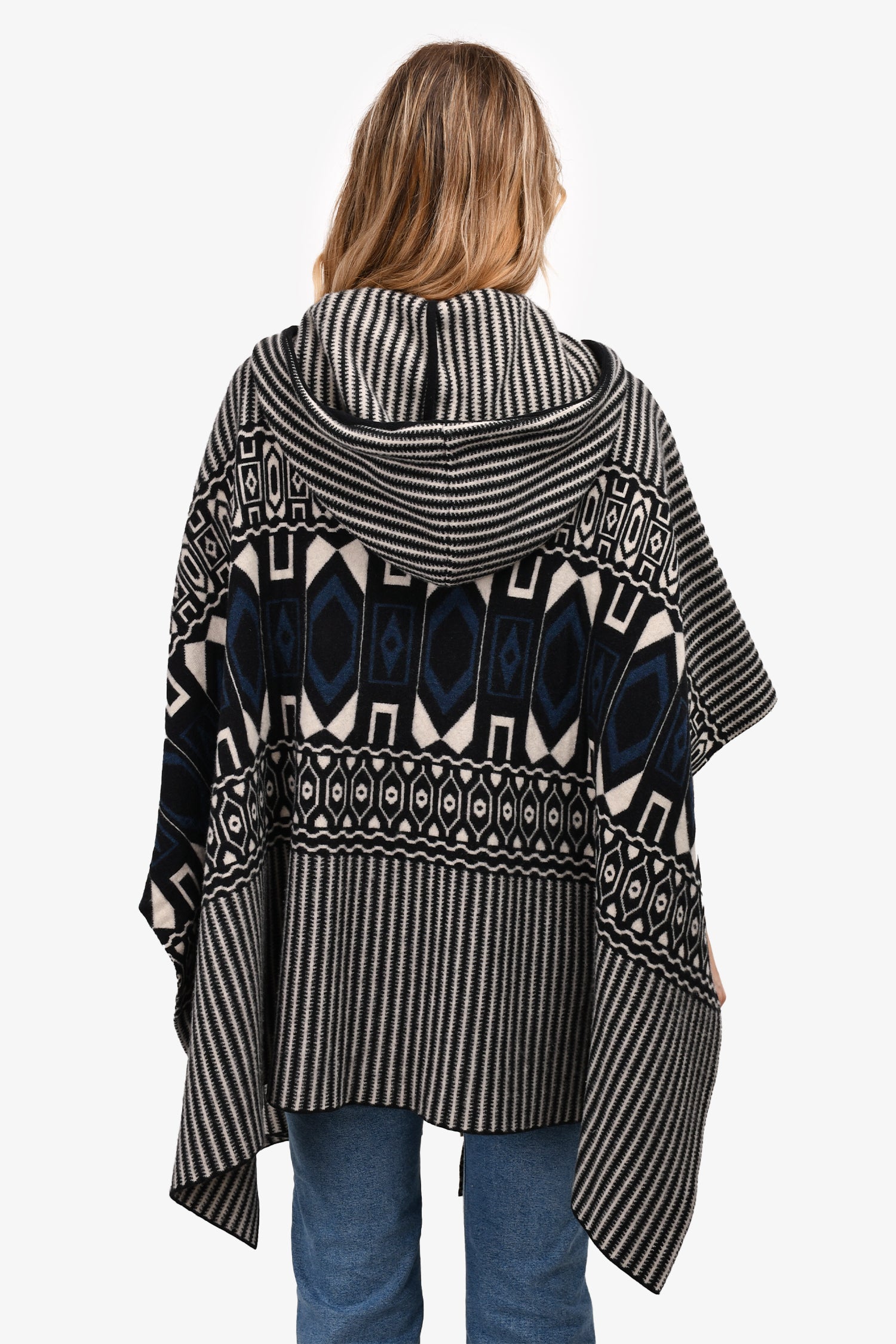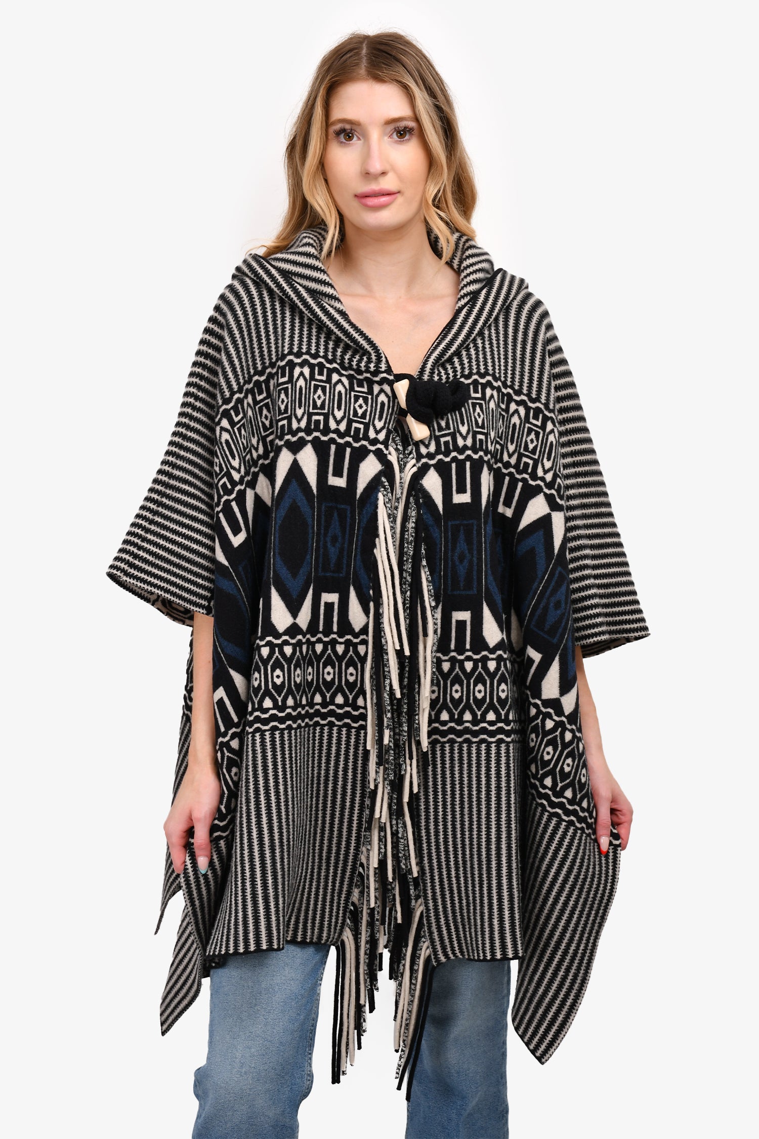 Refresh availabilityChloe Black/White Wool/Cashmere Hooded Poncho. Slip on with hook closure. Tonal stitching.