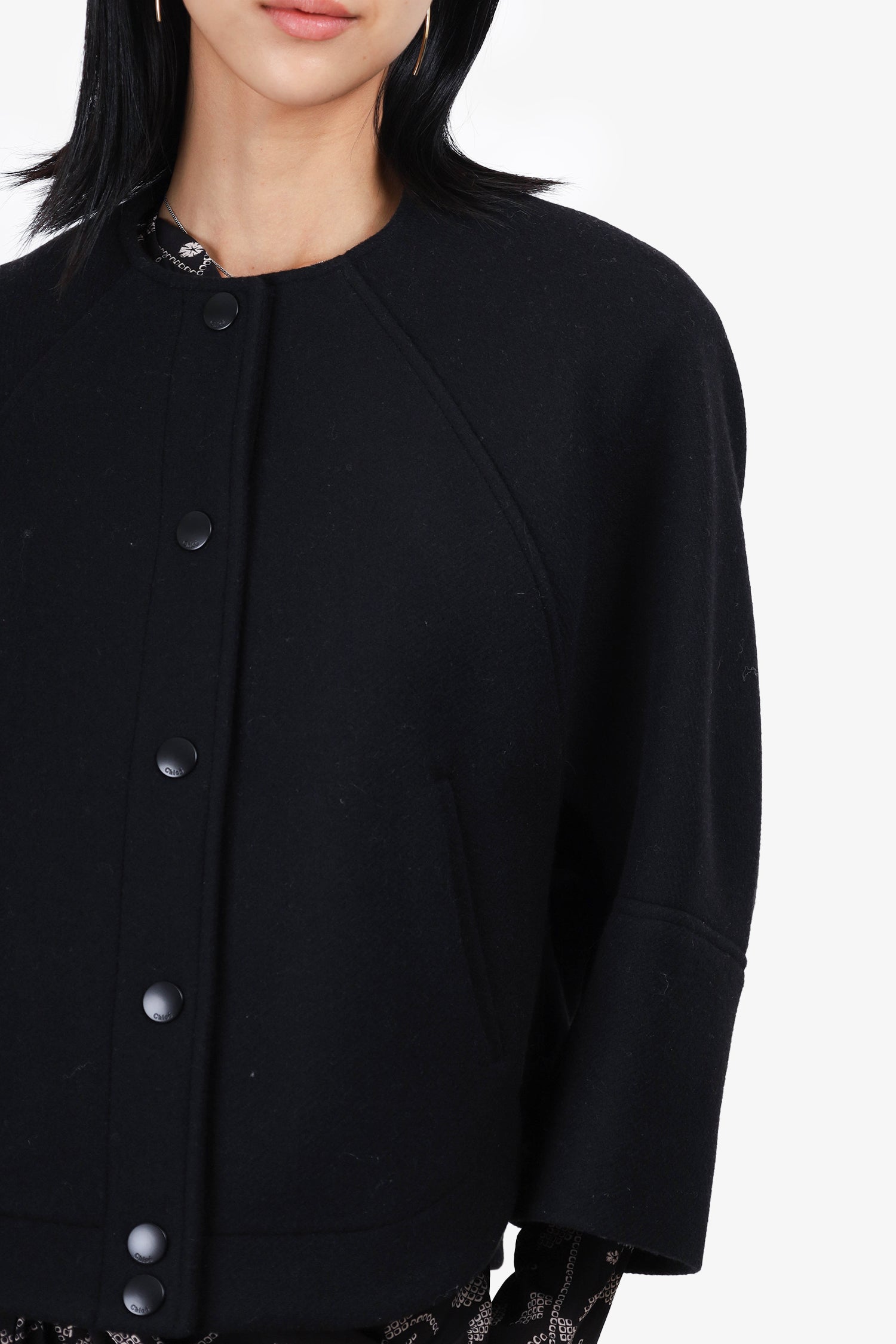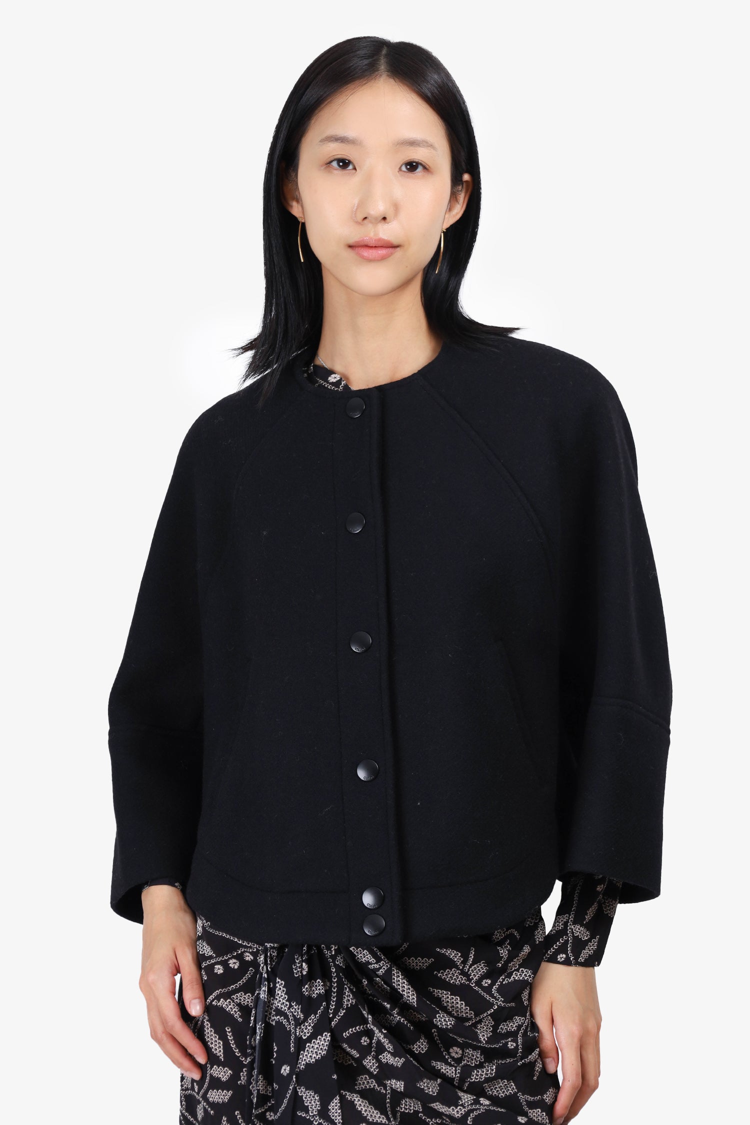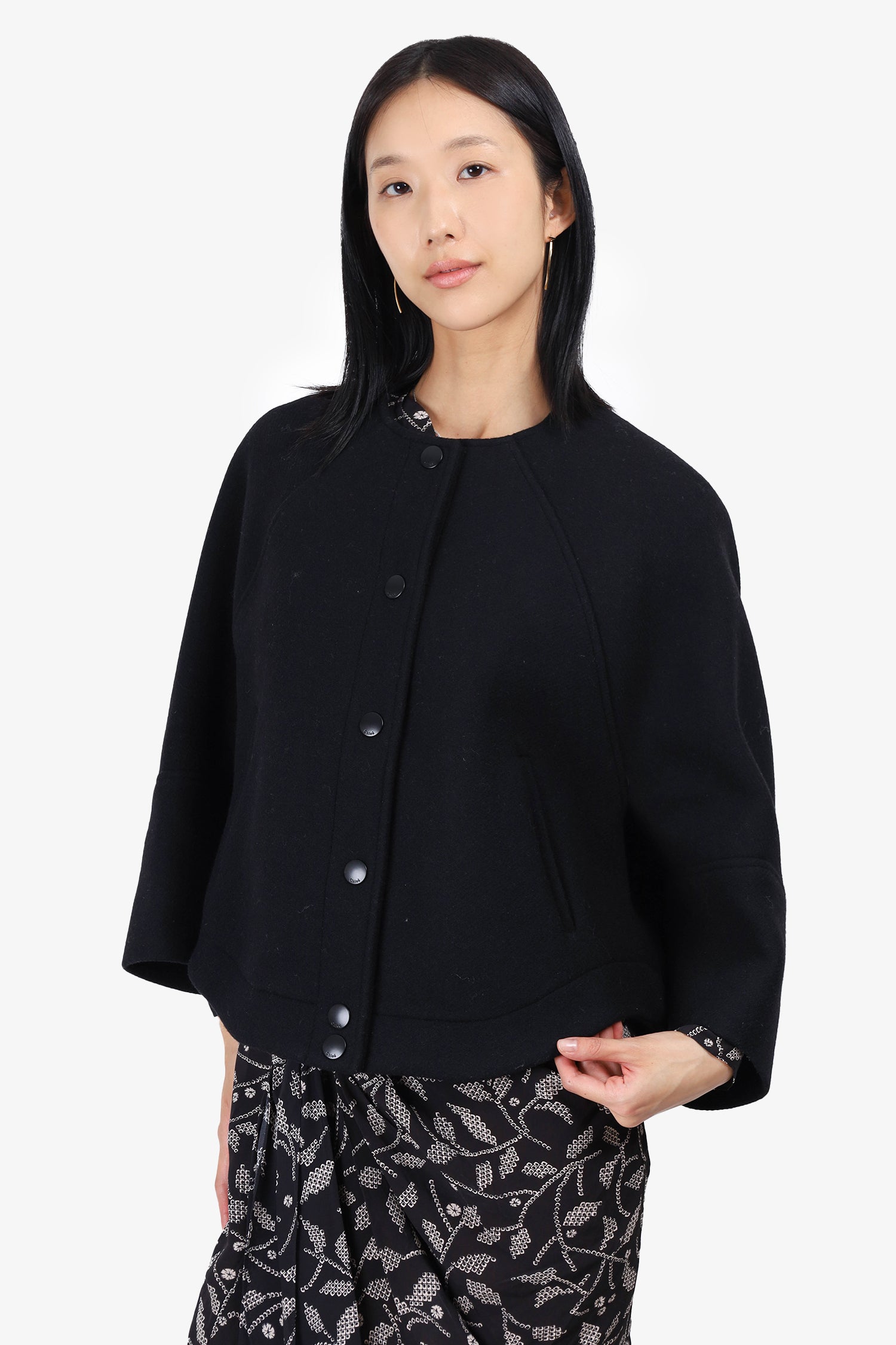 Refresh availabilityChloe Black Wool Button-Front Cropped Jacket. Two front slip pockets. Snap button front closure. Curved hem. Unlined. Tonal stitching.