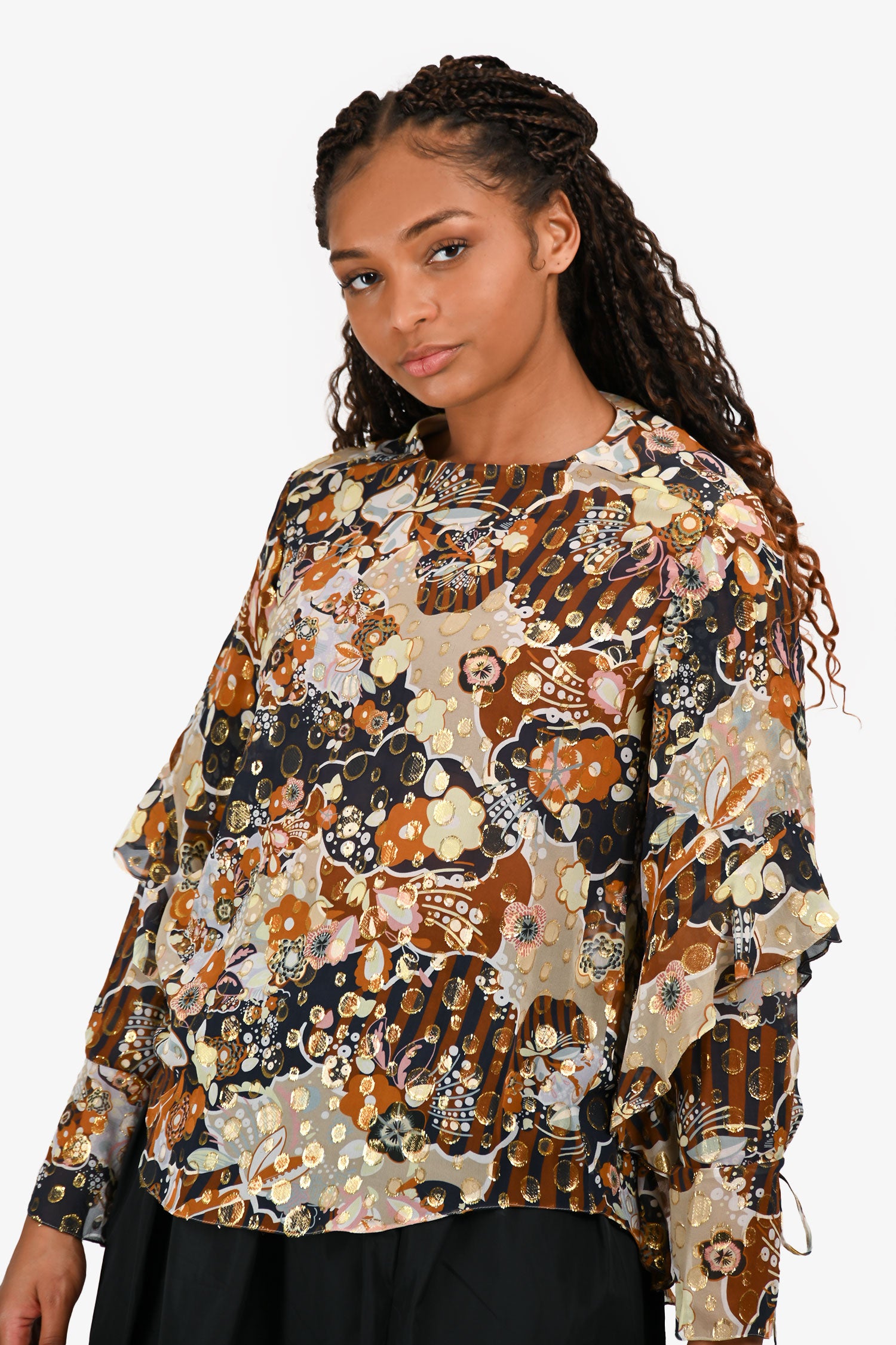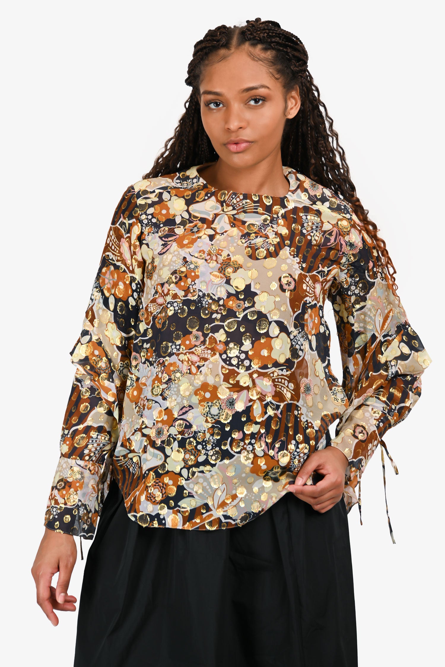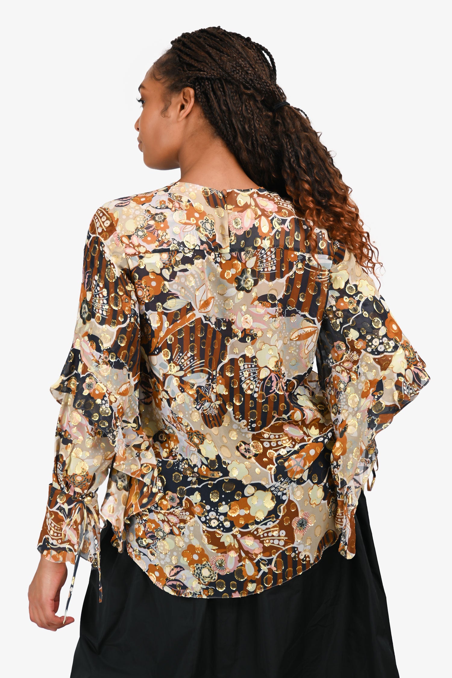 Refresh availabilityChloe Brown/Navy Printed Silk Blouse. Slip-on. Round neckline. Buttoned keyhole closure at the rear. Cuffs with a button and tie detail. Unlined. Tonal stitching.