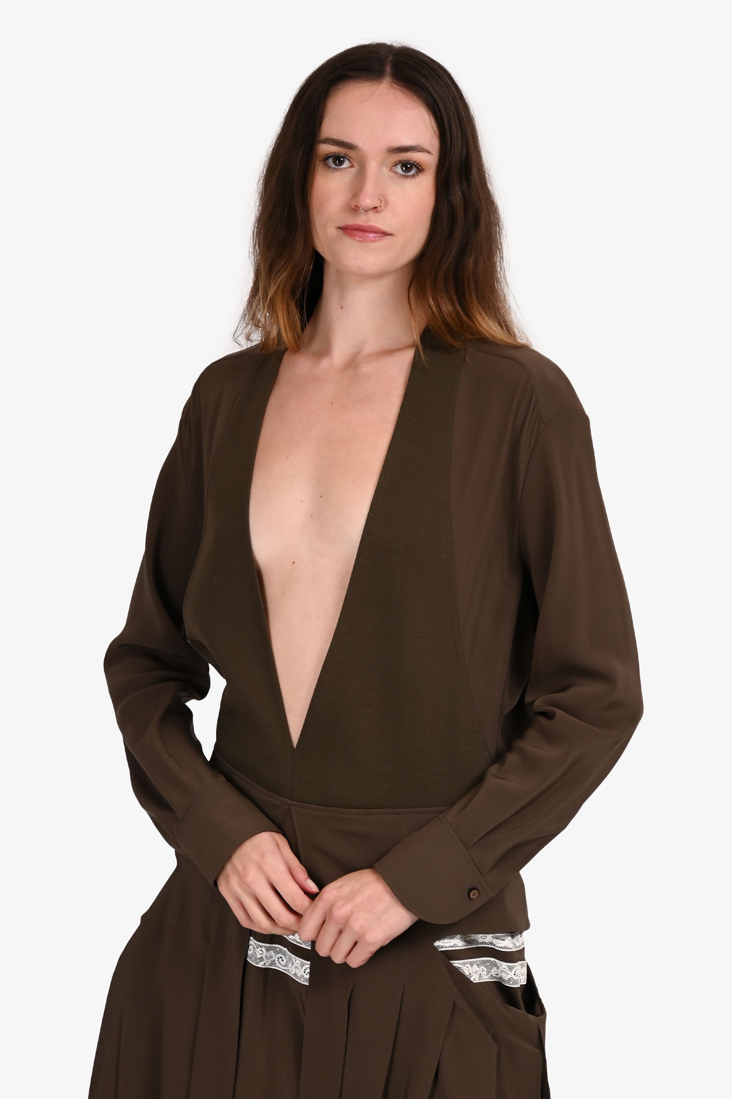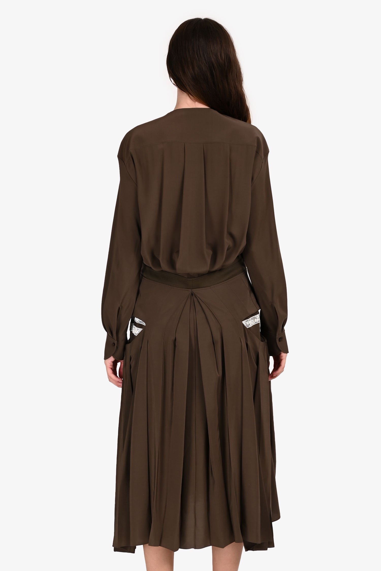 Refresh availabilityChloé Green Silk Deep V Pleated Lace Detail Dress. Pull-on. Deep V-neckline. Cuffs with button-up detailing. Lined skirt. Tonal stitching.