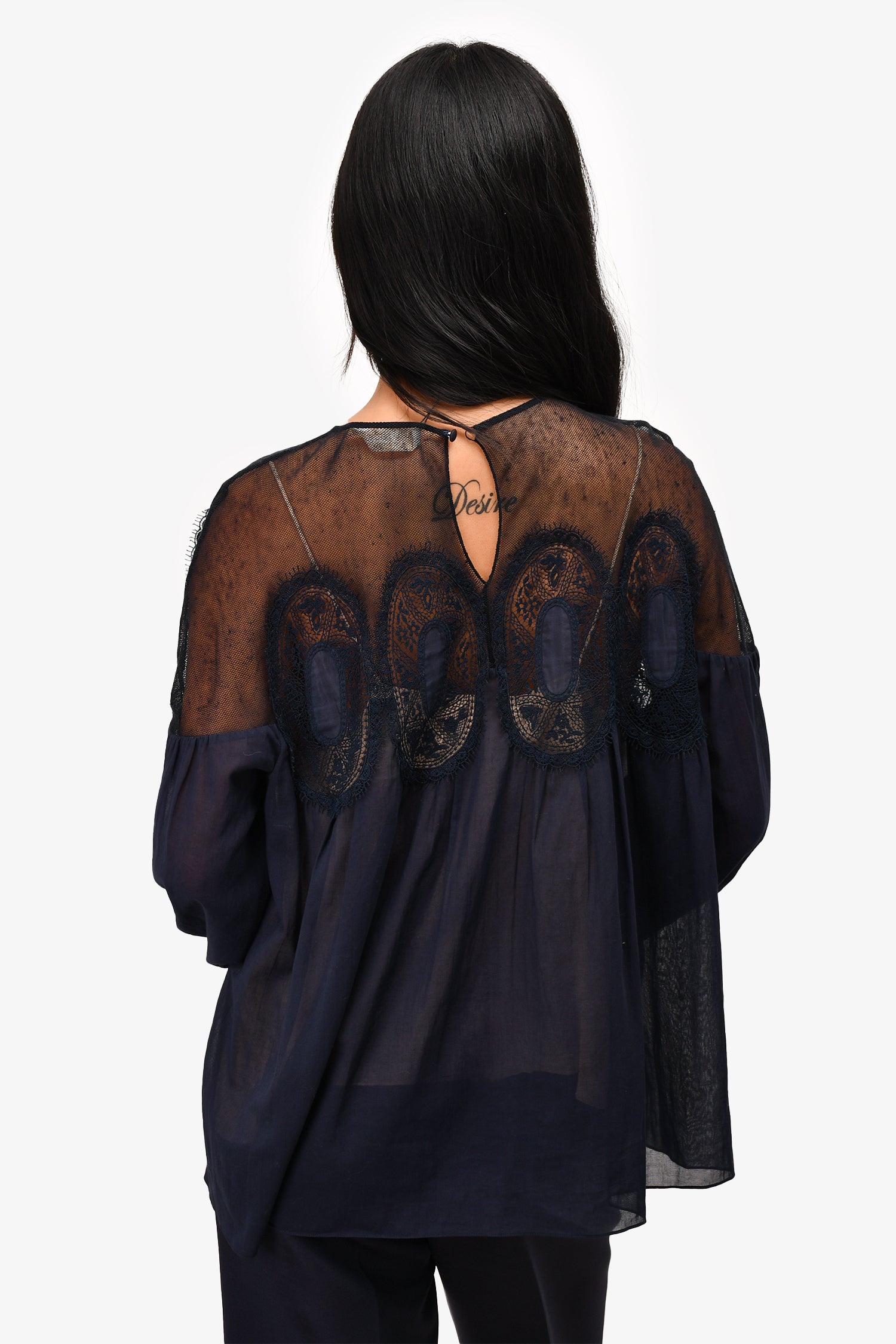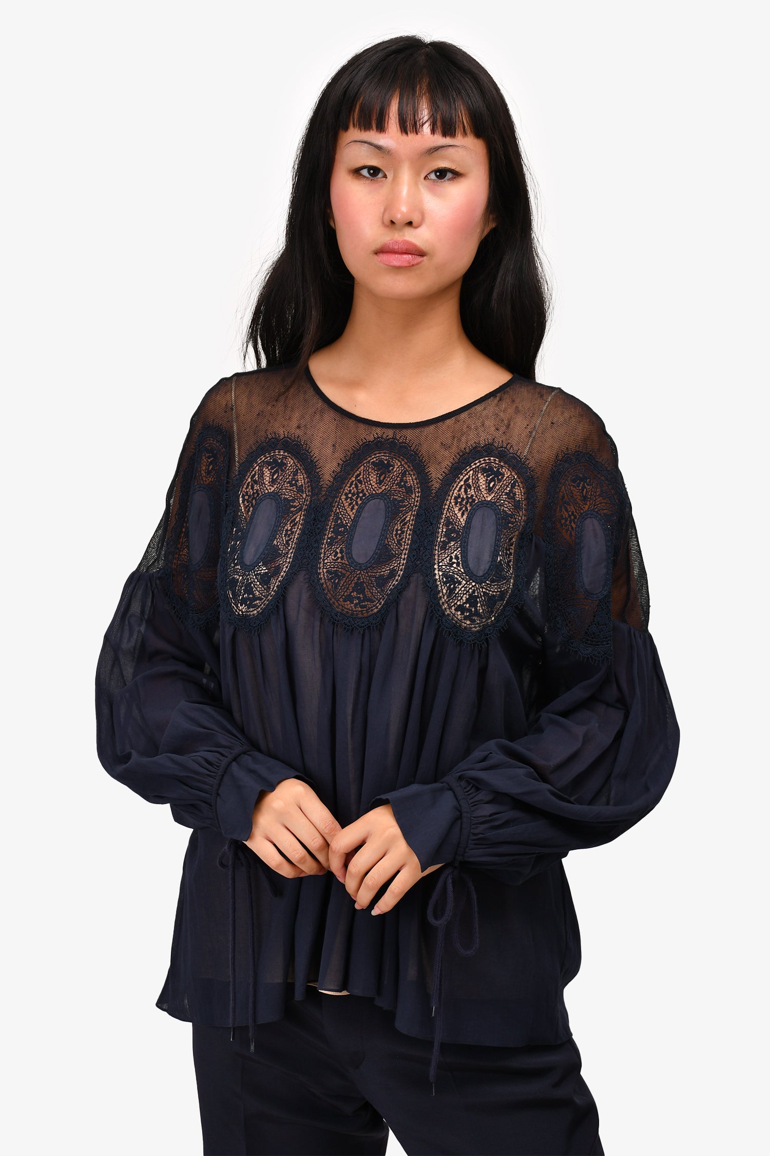Refresh availabilityChloe Navy Blue Cotton Eyelet Lace Blouse with Beige Slip. Pull-on. Back-of-neck button closure. Elasticized cuffs with tie-up closure.