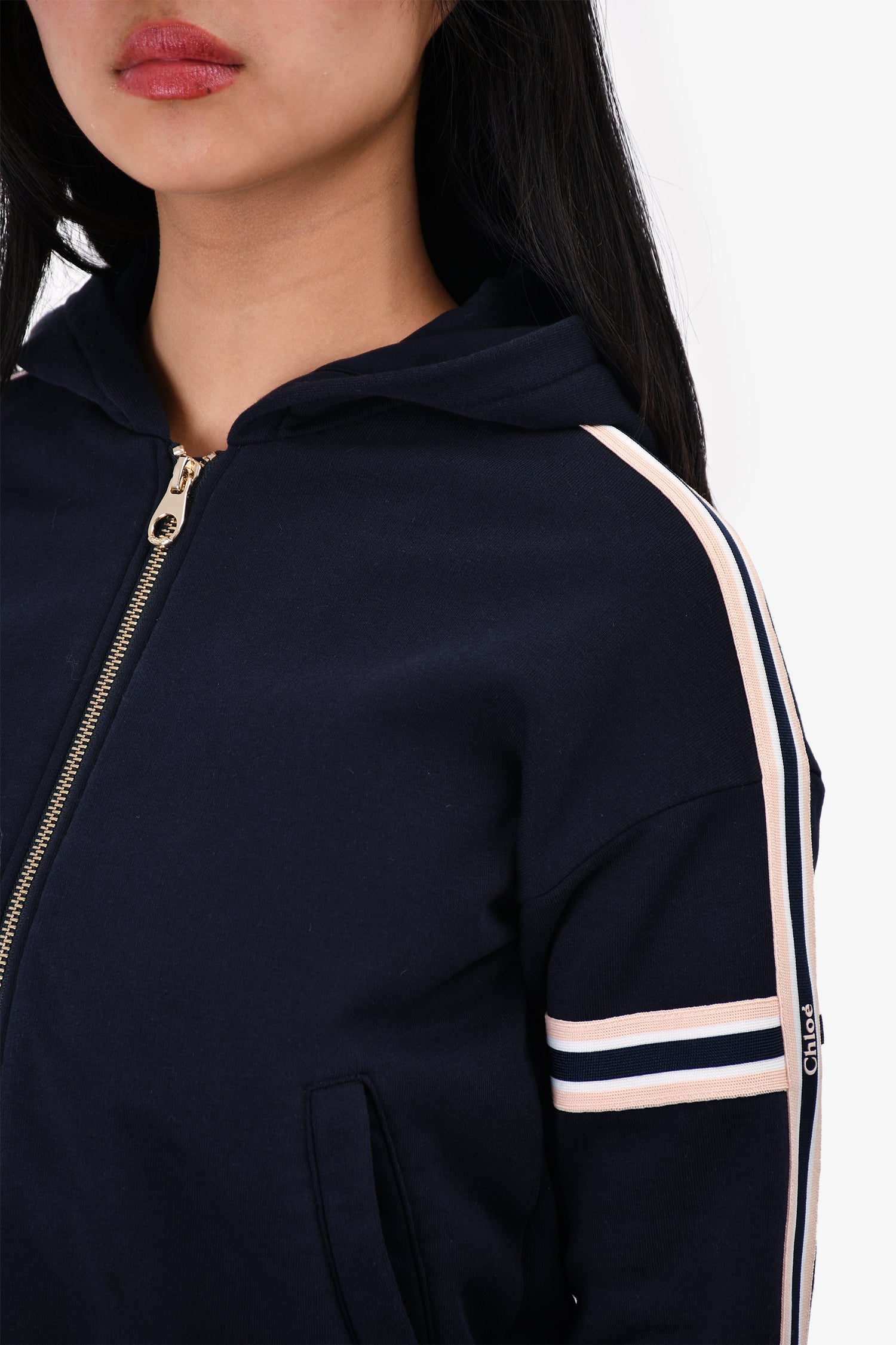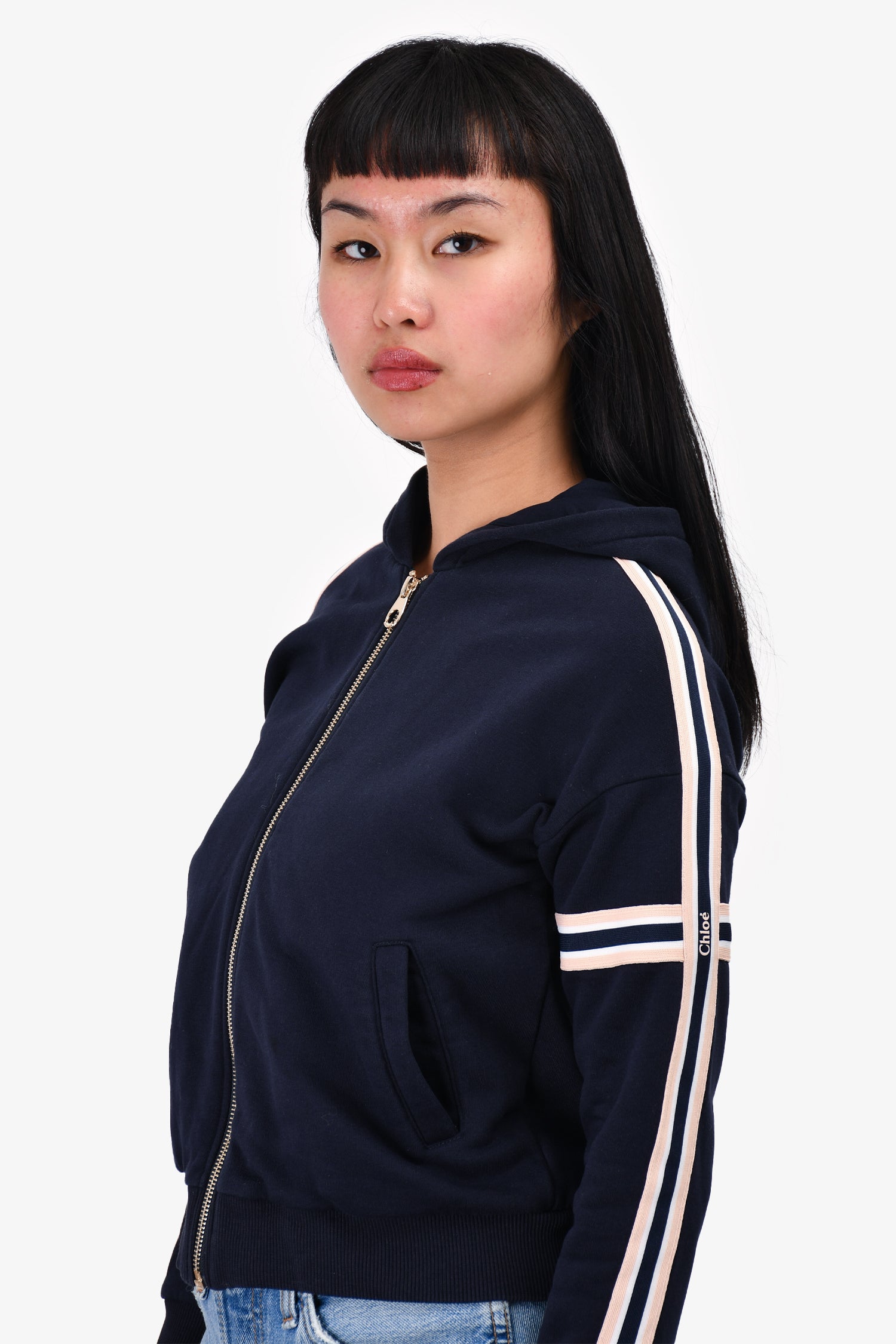 Refresh availabilityChloe Navy Trimmed Detailed Zip-Up Hooded Jacket. Front pockets. Ribbed cuffs and hem.