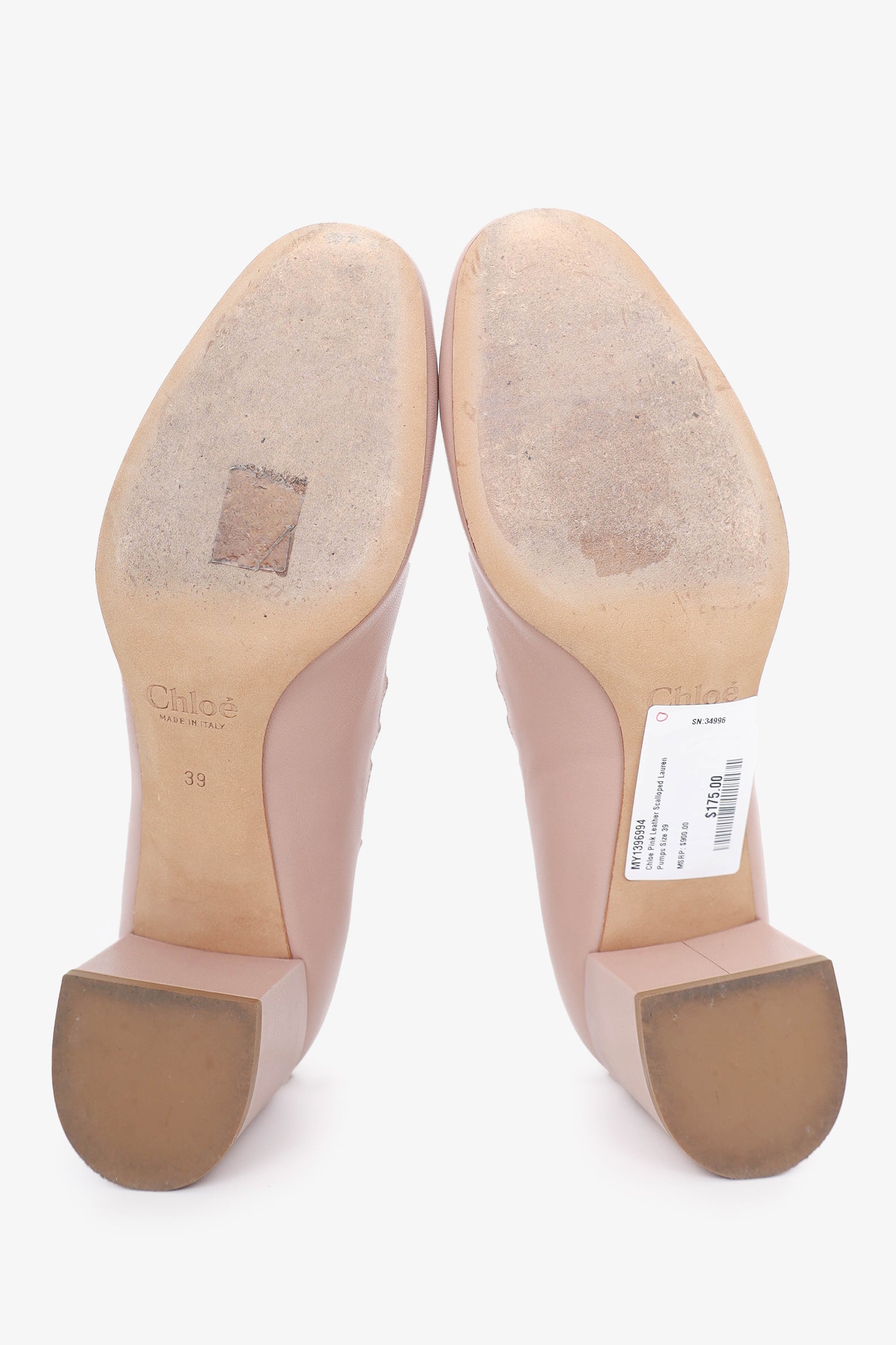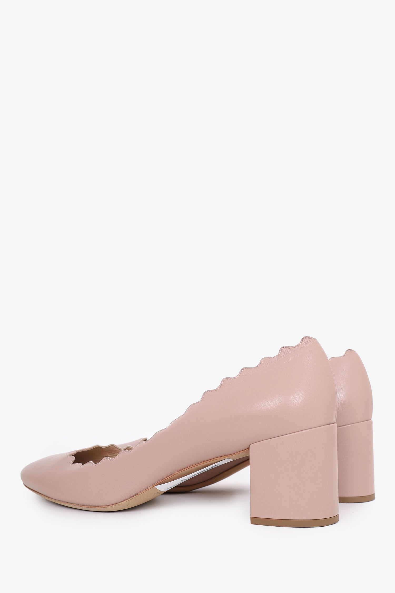 Refresh availabilityChloe Pink Leather Scalloped Lauren Pumps. Round toe. Scalloped details throughout. Block heel. Tonal stitching.
