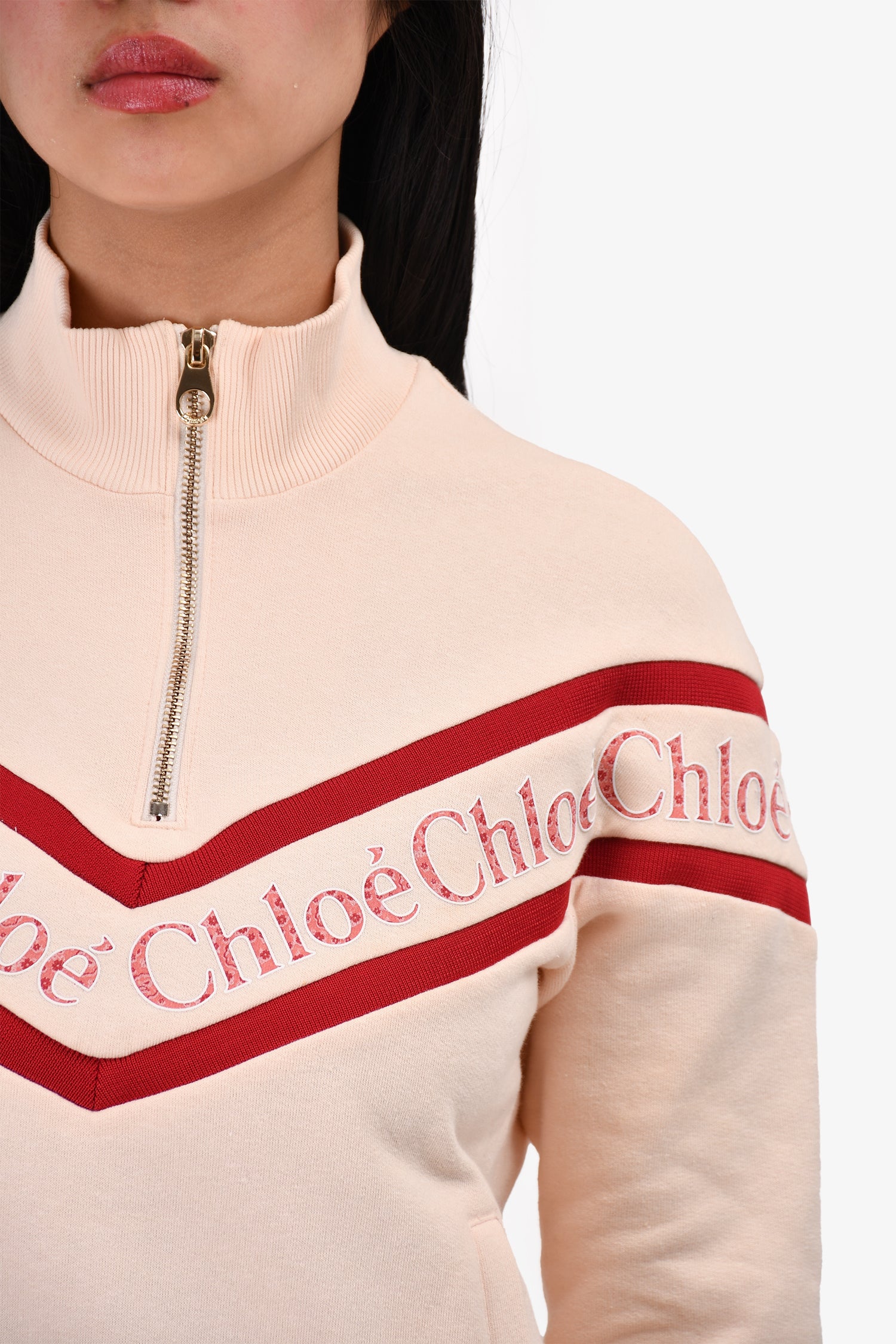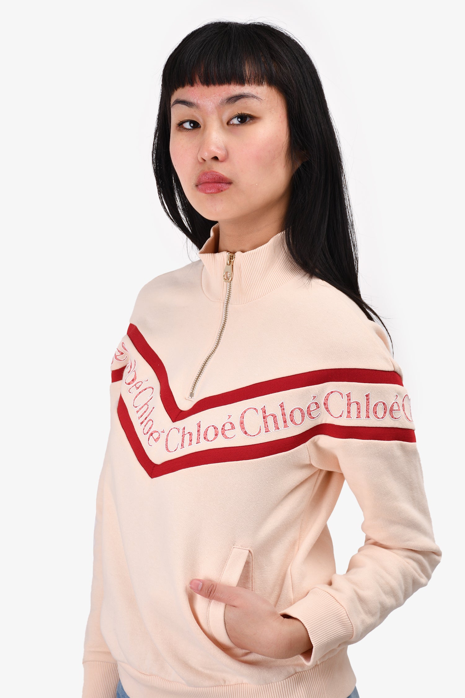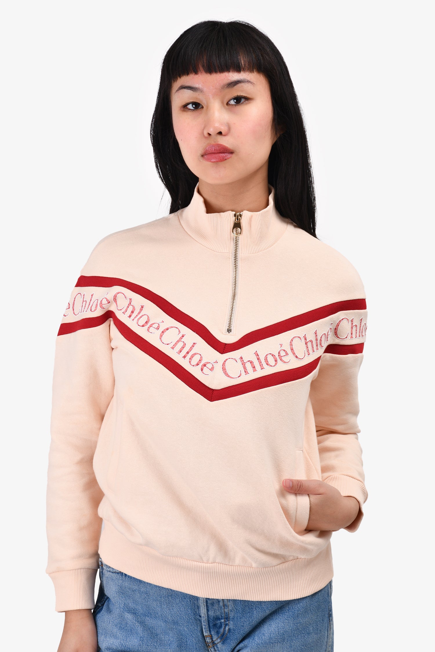 Refresh availabilityChloe Pink Logo Zip Detailed Sweater. Pull-on. Front zip pockets. Ribbed cuffs and hem.