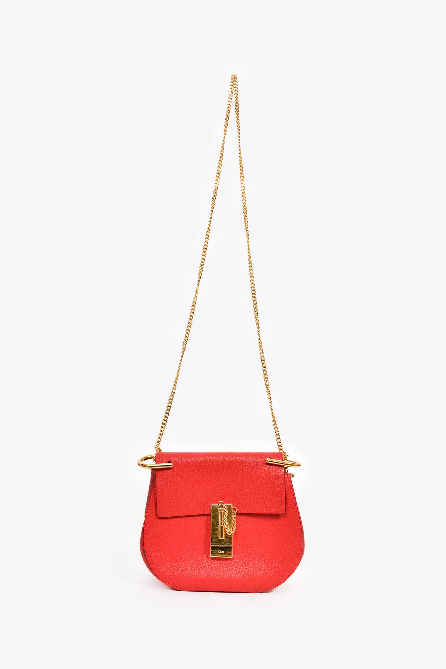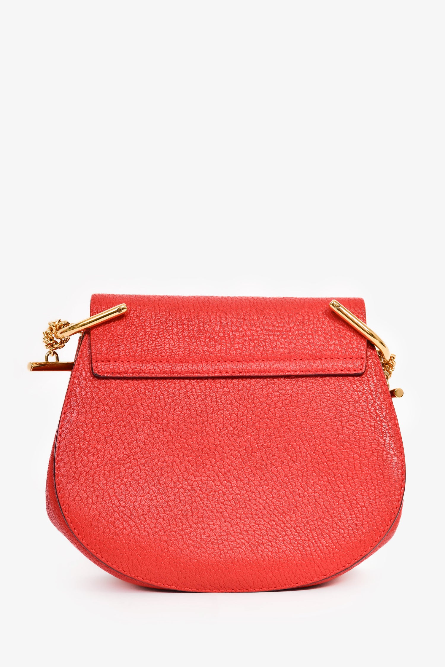 Refresh availabilityChloe Red Leather 'Drew' Crossbody Bag. Front fold-over flap with turn-lock closure. Beige suede interior lining. Single interior wall flap with slip pocket. Gold-tone hardware.