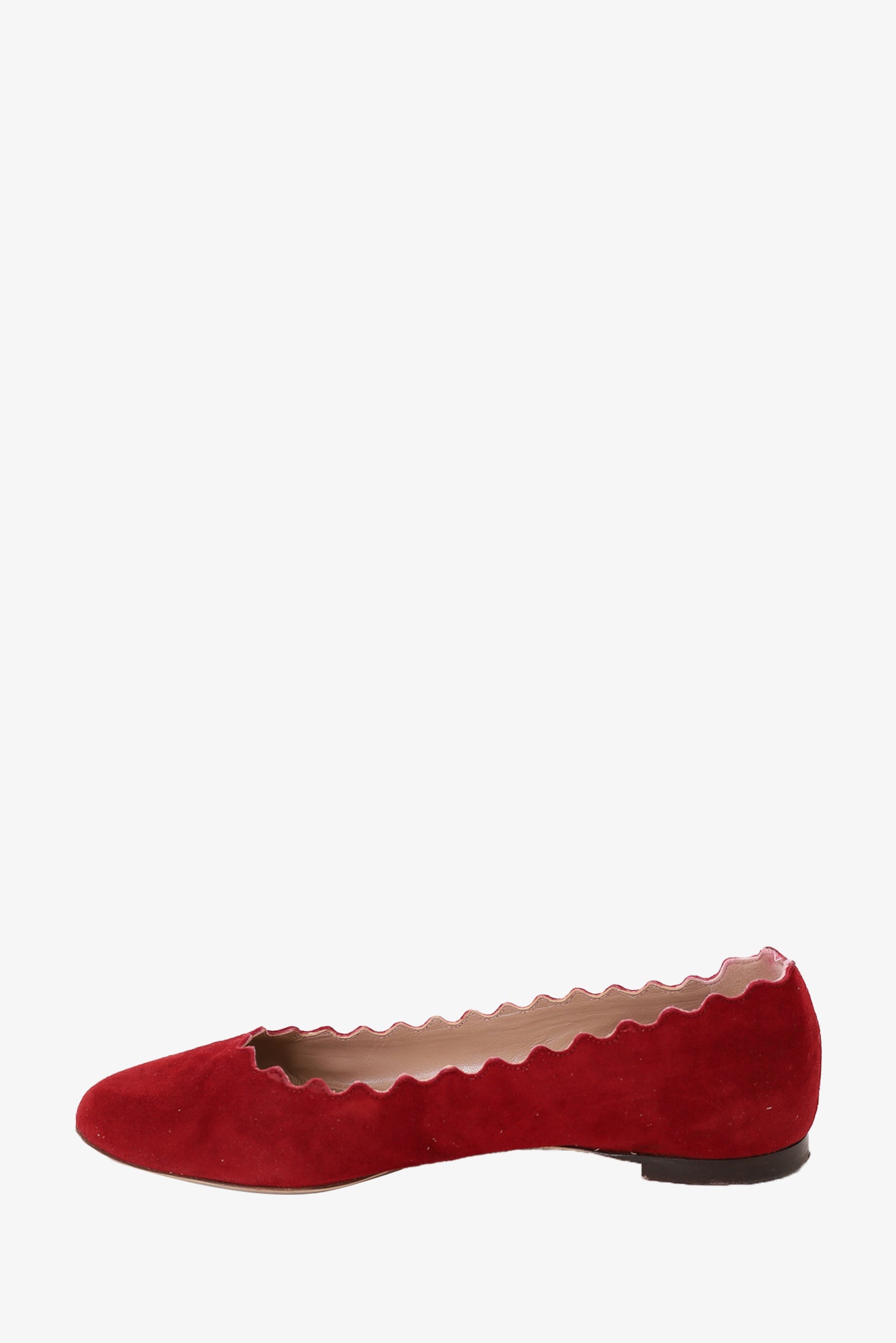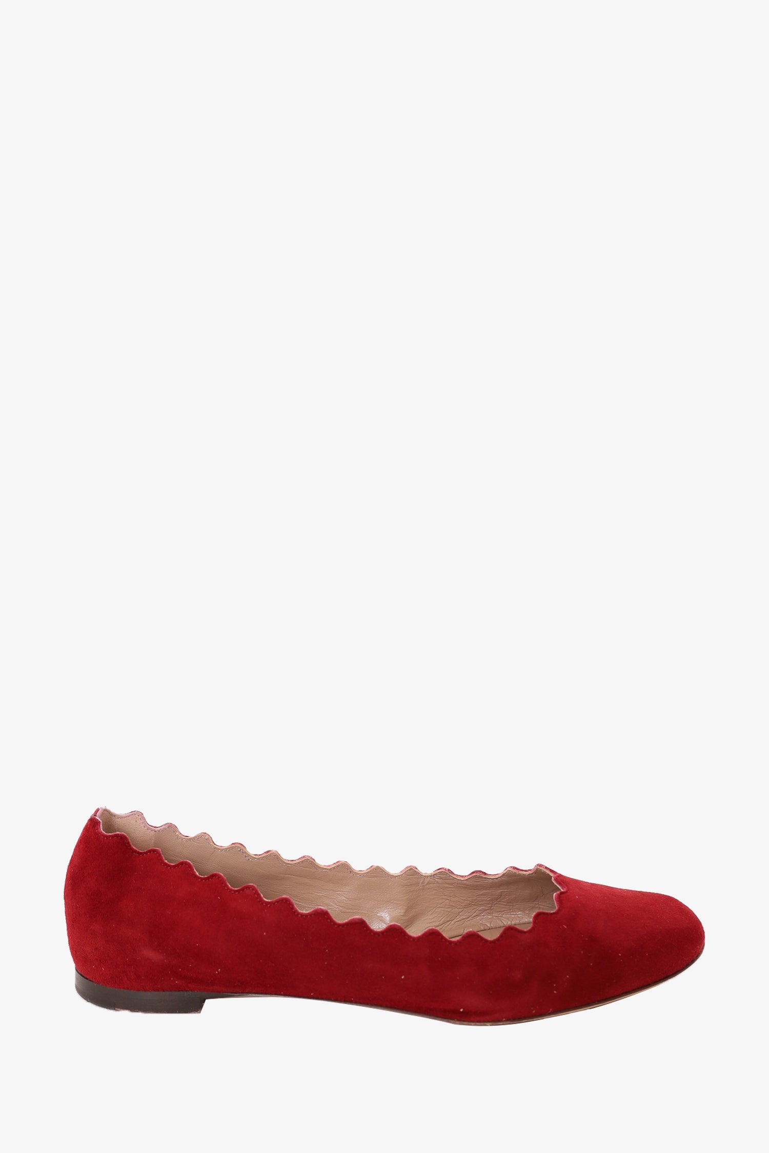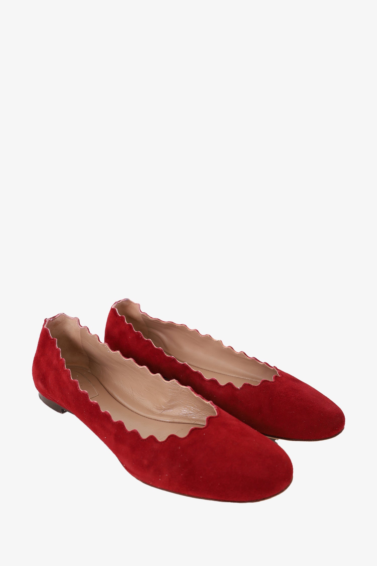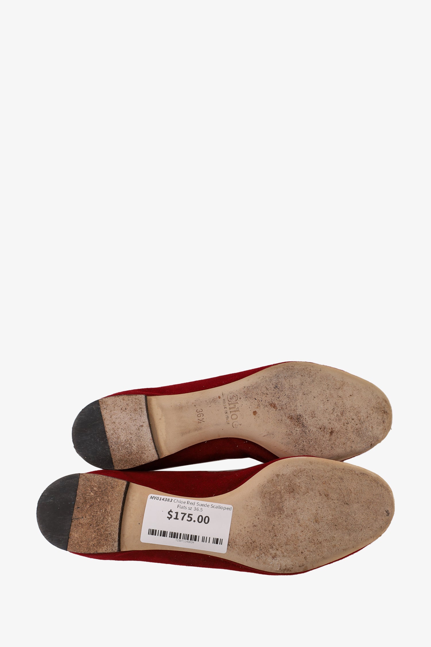 Refresh availabilityChloe Red Suede Scalloped Flats. Round toe. Slip-on. Tonal stitching.