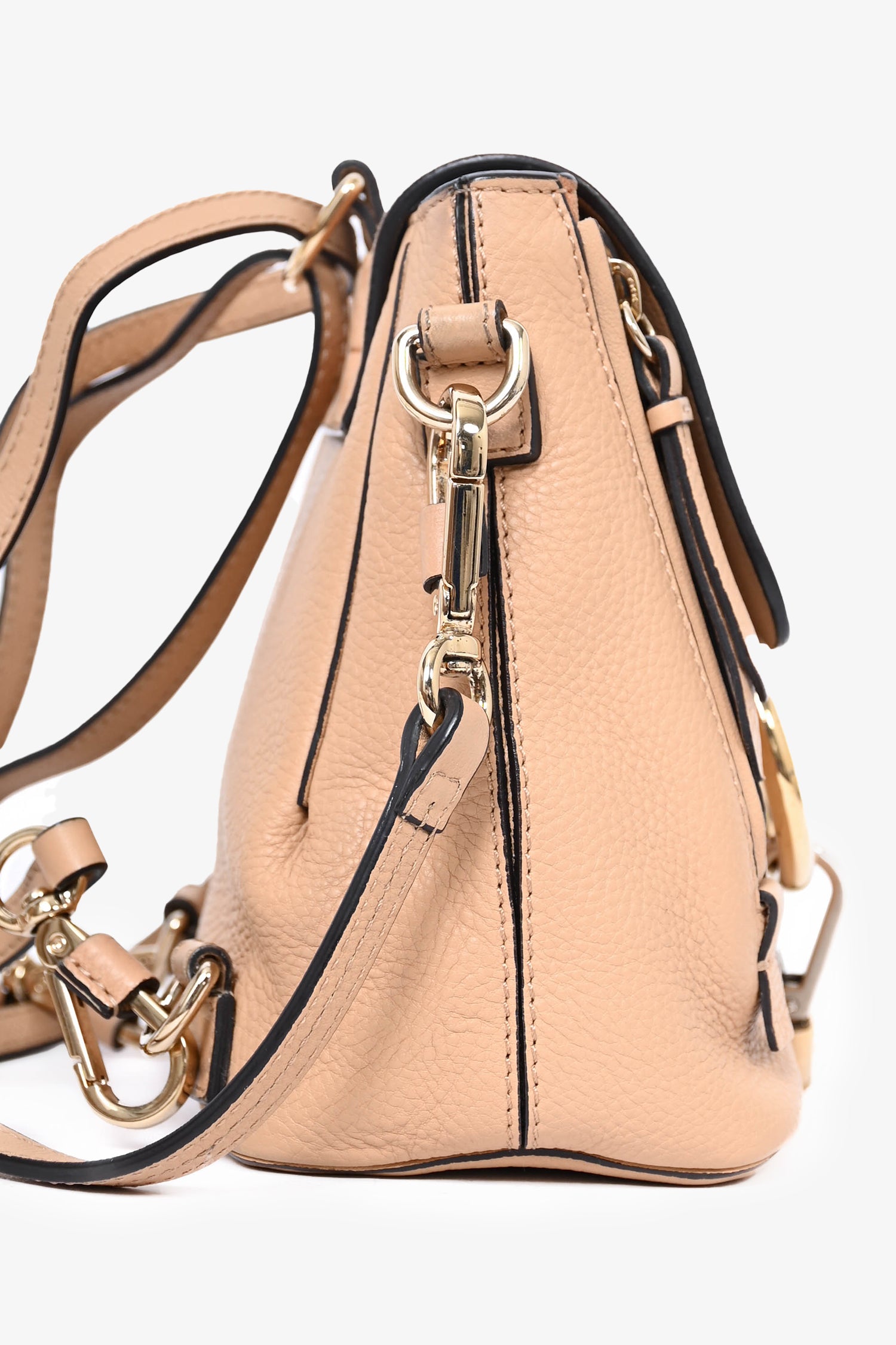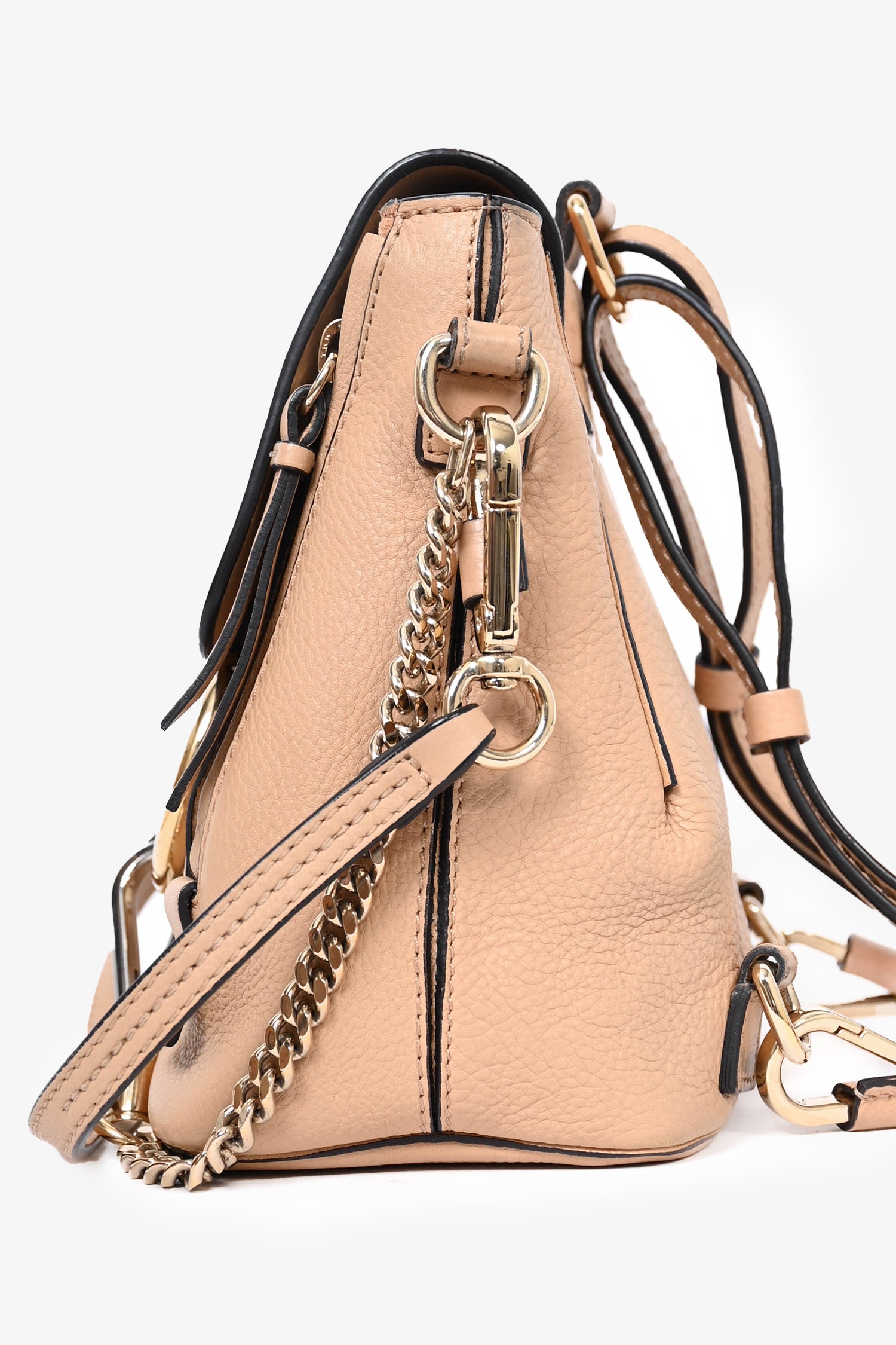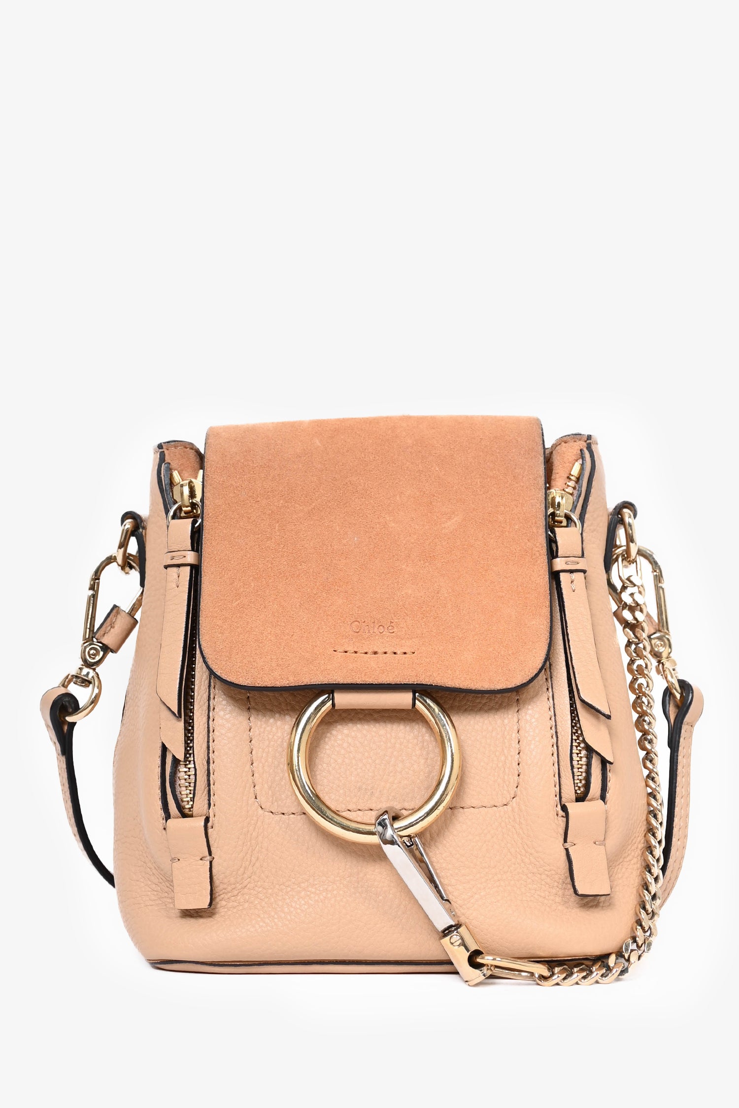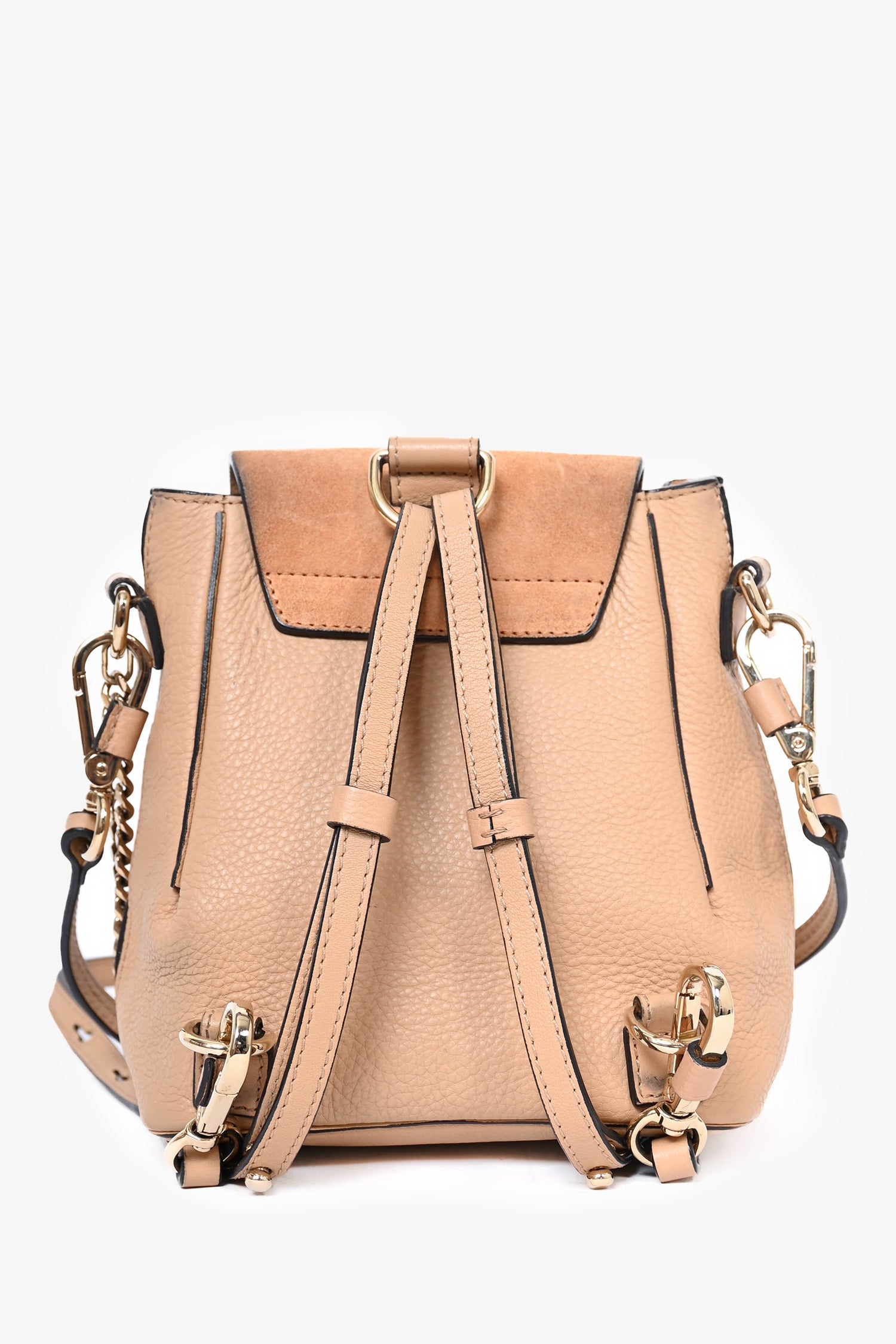 Refresh availabilityChloe Tan Leather/Suede Mini Faye Backpack. Front fold-over flap with magnetic button closure. Front double zip detail. Adjustable and removable straps. Tonal textile interior lining. Single interior wall slip pocket. Gold-tone hardware. Tonal stitching.