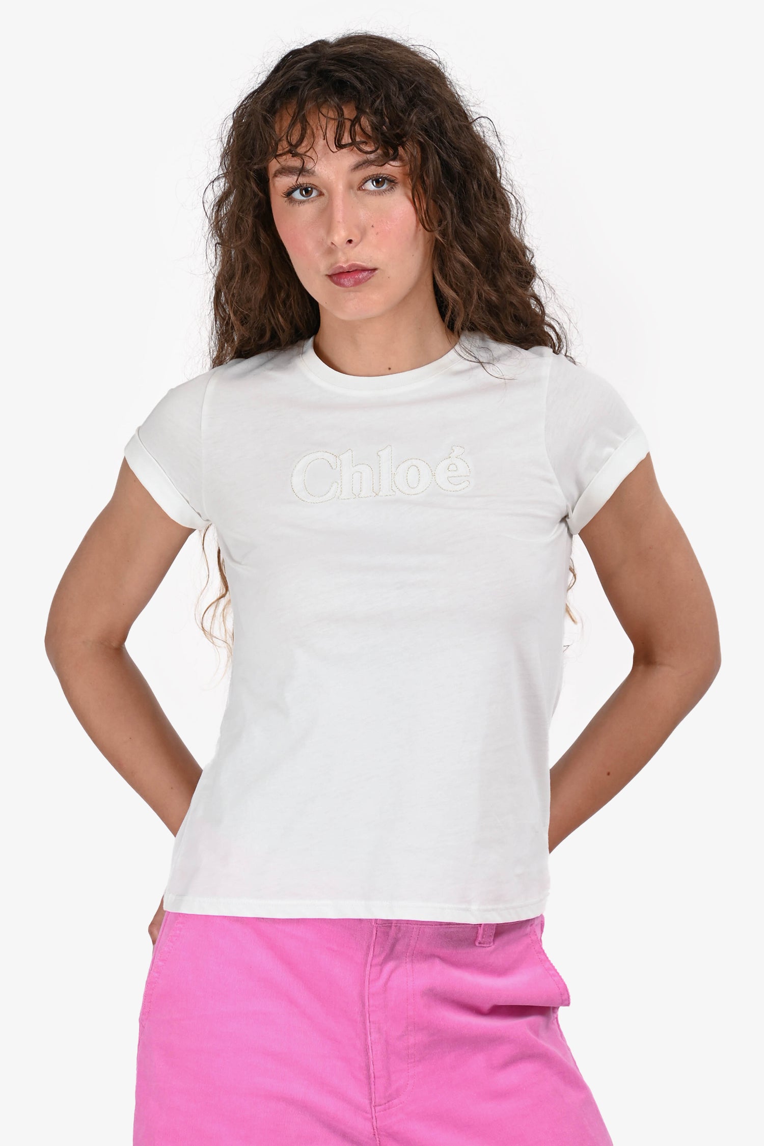 Refresh availabilityChloe White/Gold Embroidered Logo T-Shirt. Crew neckline. Short sleeves. Pull-on style. Tonal stitching.