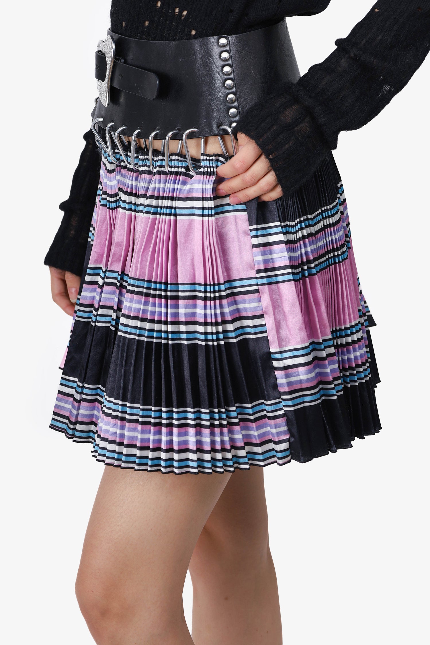 Refresh availabilityChopova Lowena Black/Pink Striped Pleated Mini Skirt. Adjustable buckle belt closure. Push lock clasp detailing along waist. Silver-tone hardware. Unlined. Tonal stitching.