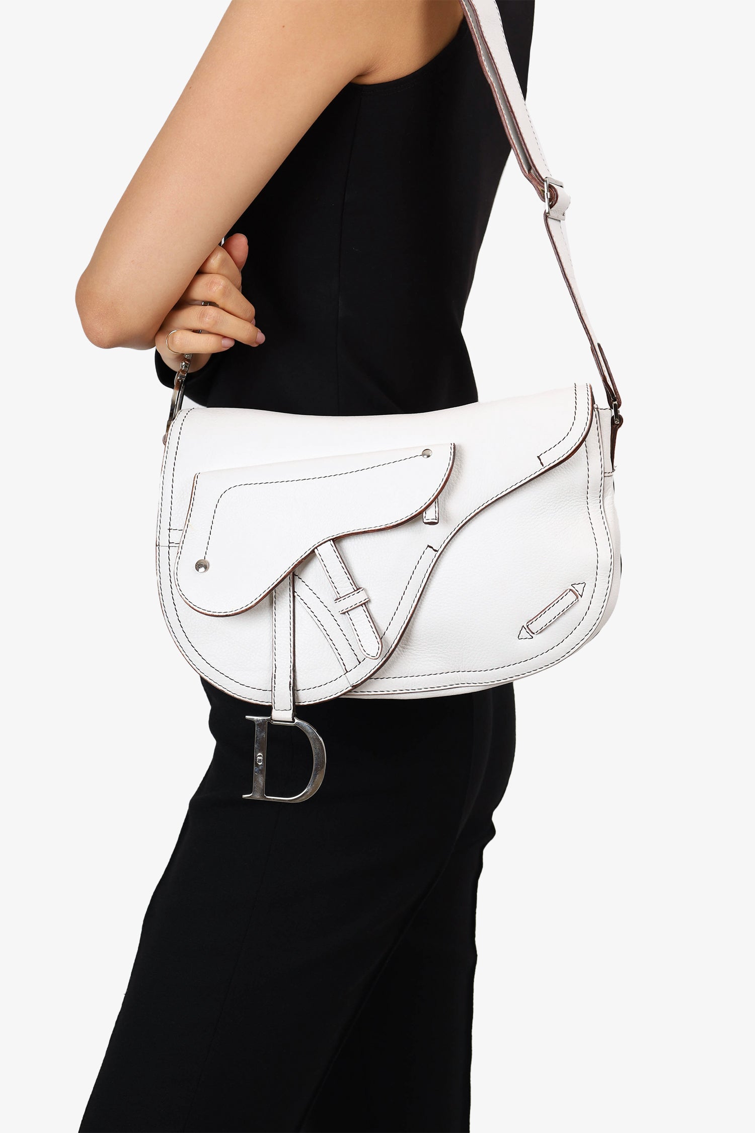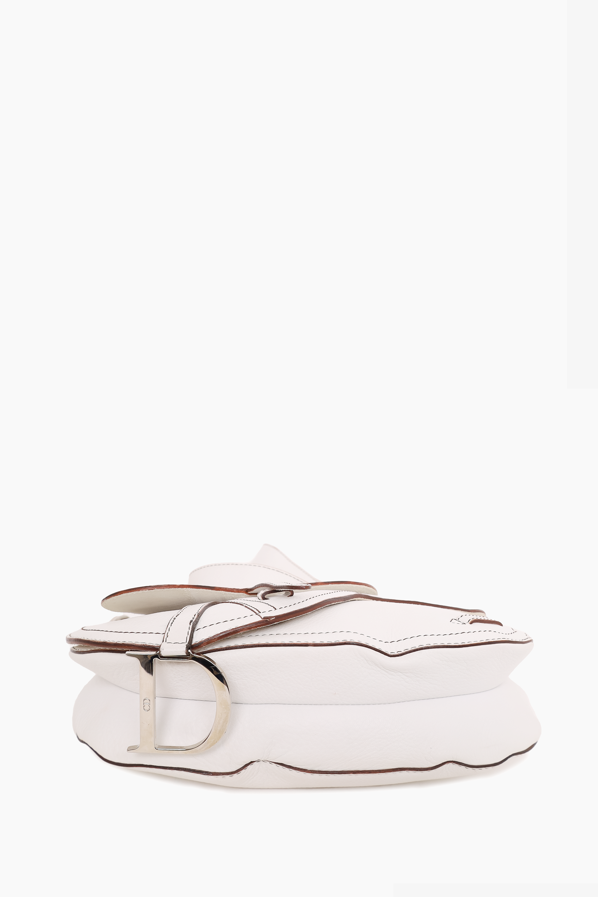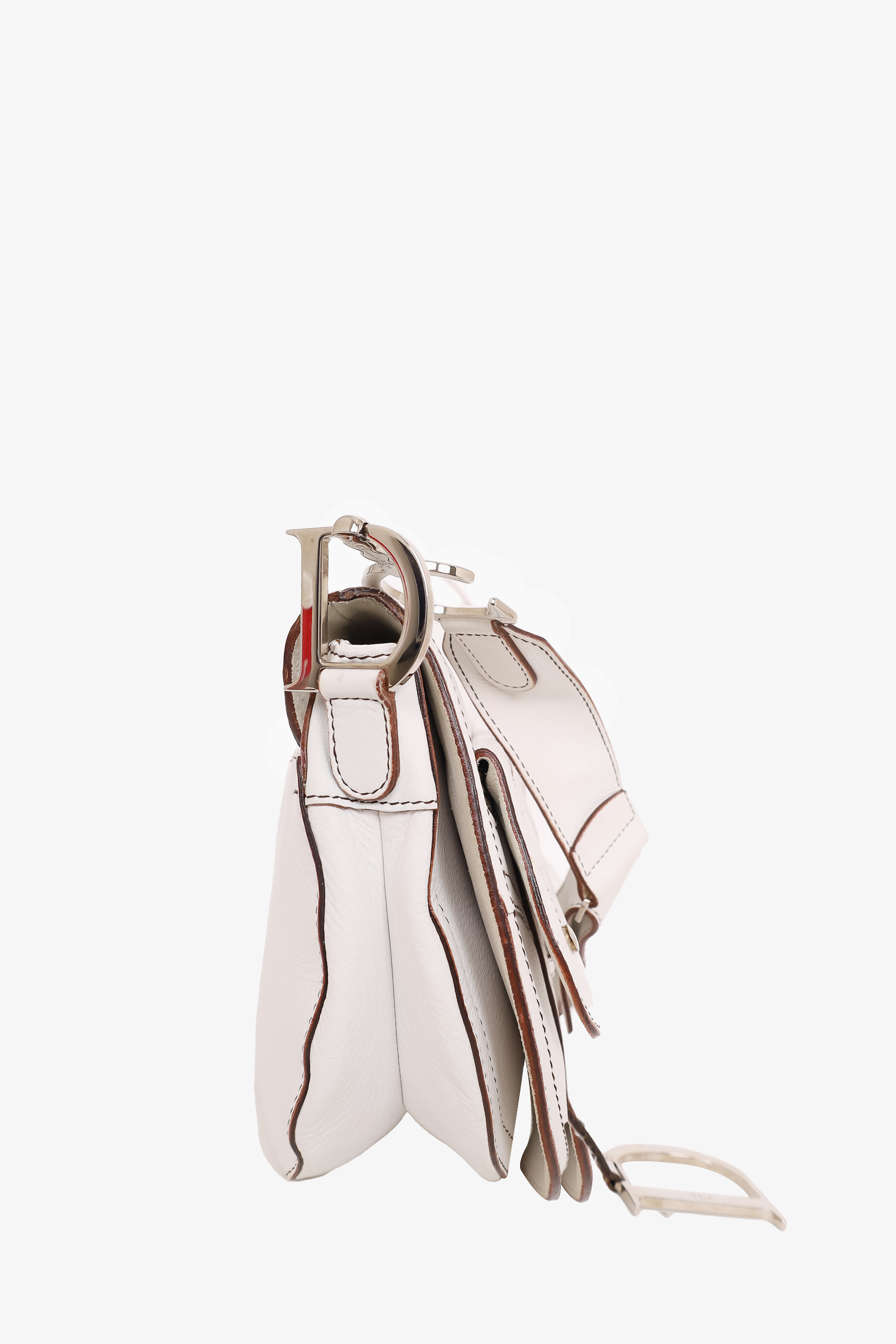 Refresh availabilityChristian Dior 2002 White Grained Calfskin Baudrier Saddle Messenger Bag. Magnetic button closure. 1 interior pocket with zip closure. Front exterior pocket with magnetic and zip closure. Rear exterior pocket with magnetic button closure. Adjustable crossbody strap. Silver-tone hardware. Tonal stitching.