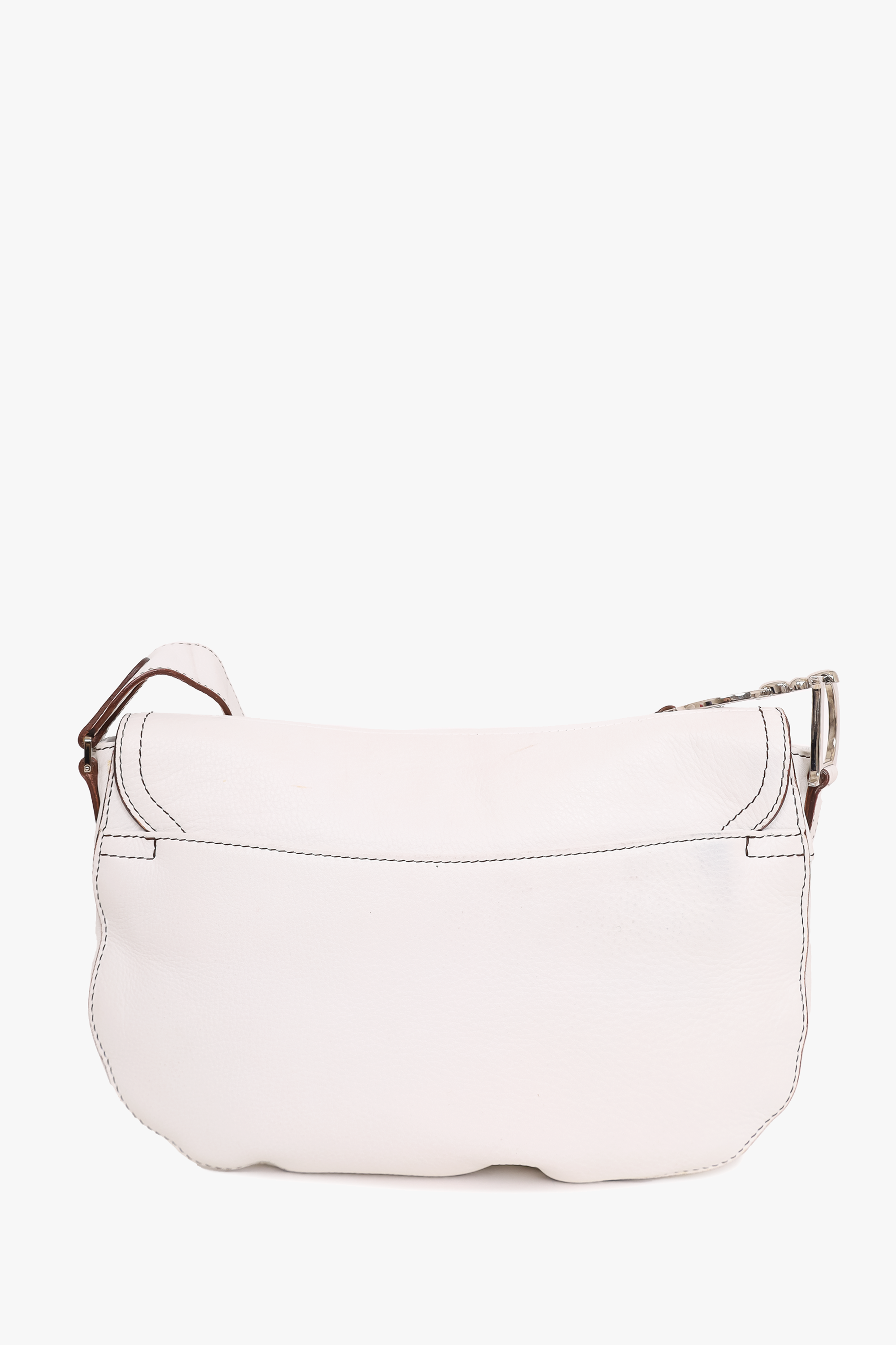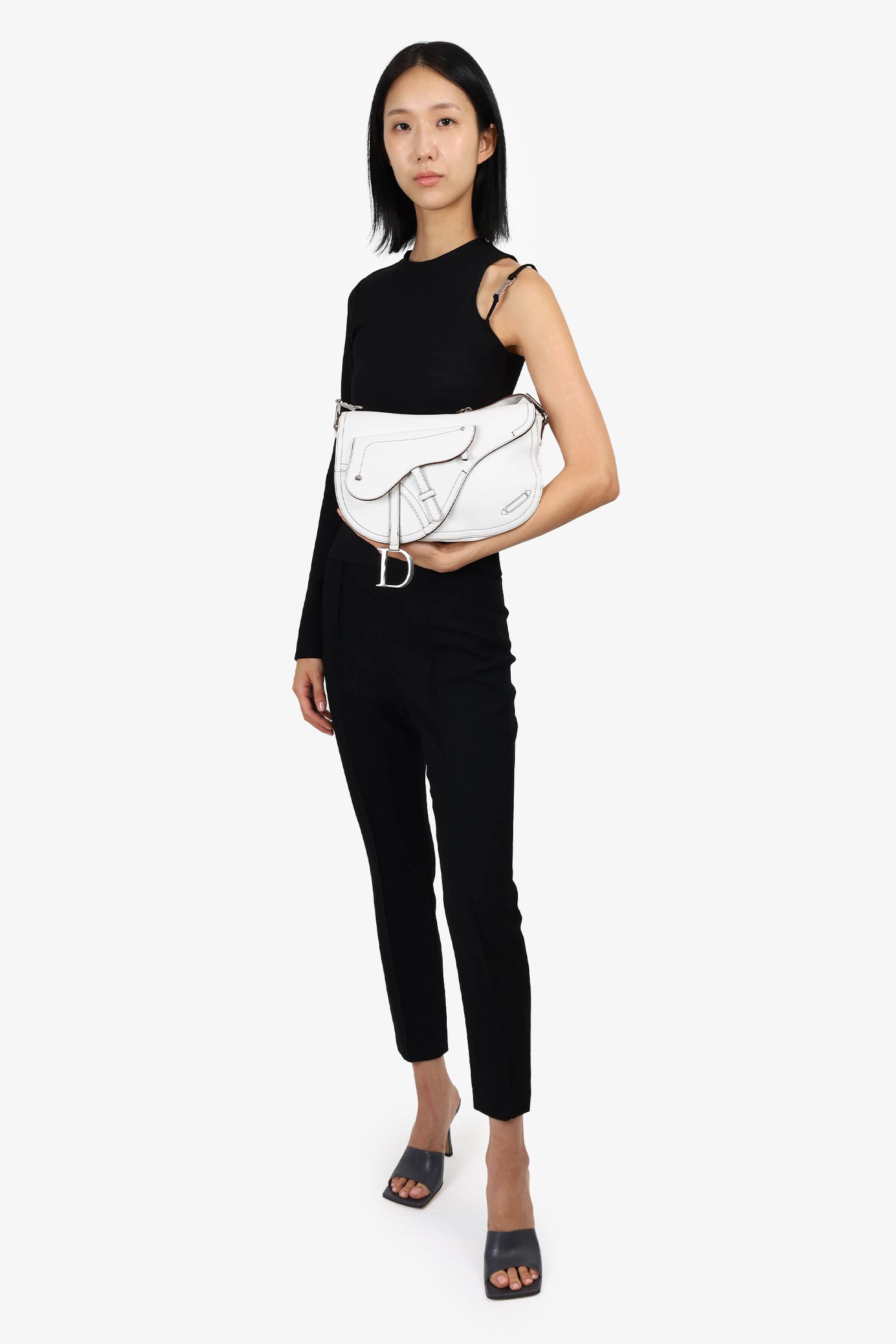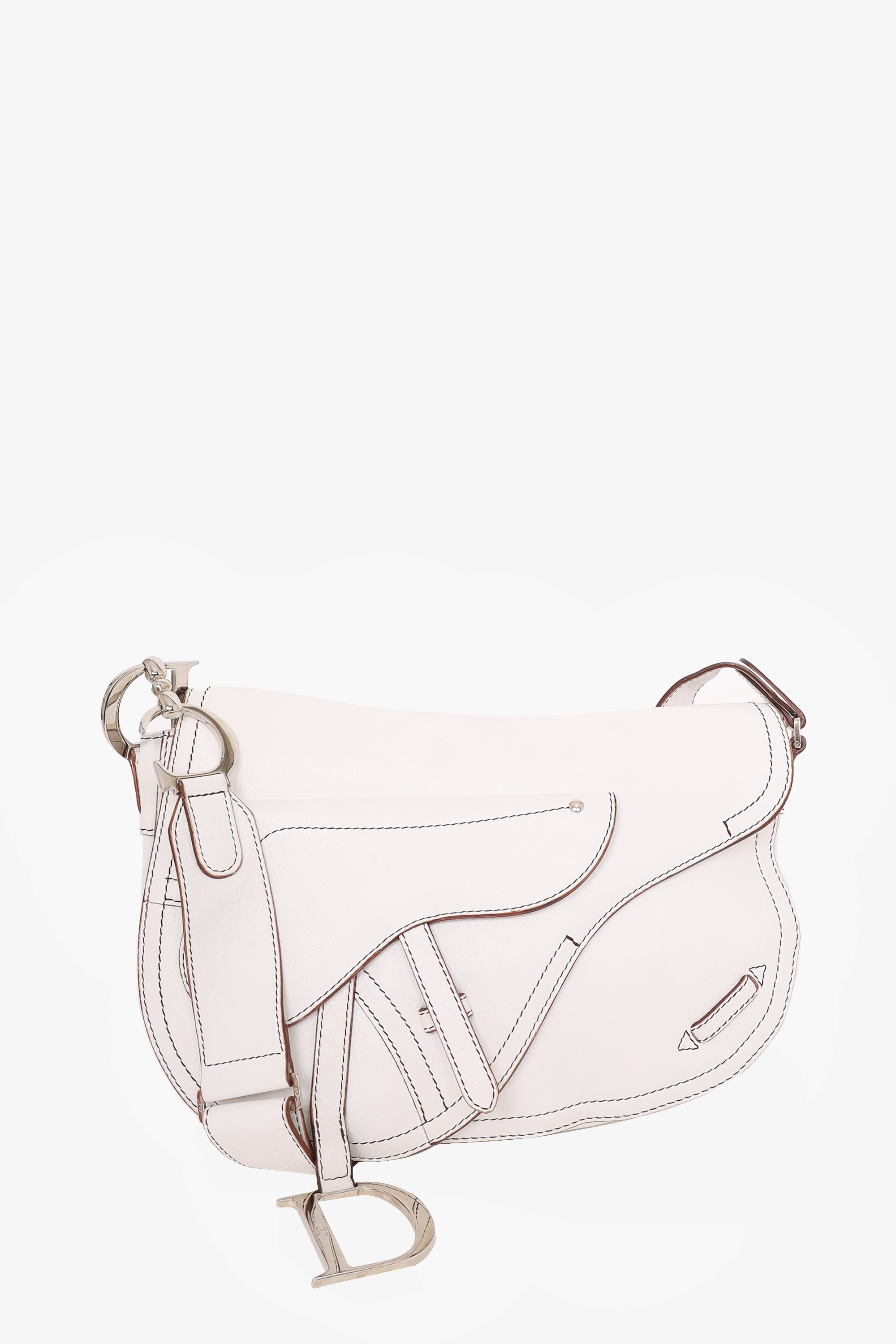 Refresh availabilityChristian Dior 2002 White Grained Calfskin Baudrier Saddle Messenger Bag. Magnetic button closure. 1 interior pocket with zip closure. Front exterior pocket with magnetic and zip closure. Rear exterior pocket with magnetic button closure. Adjustable crossbody strap. Silver-tone hardware. Tonal stitching.