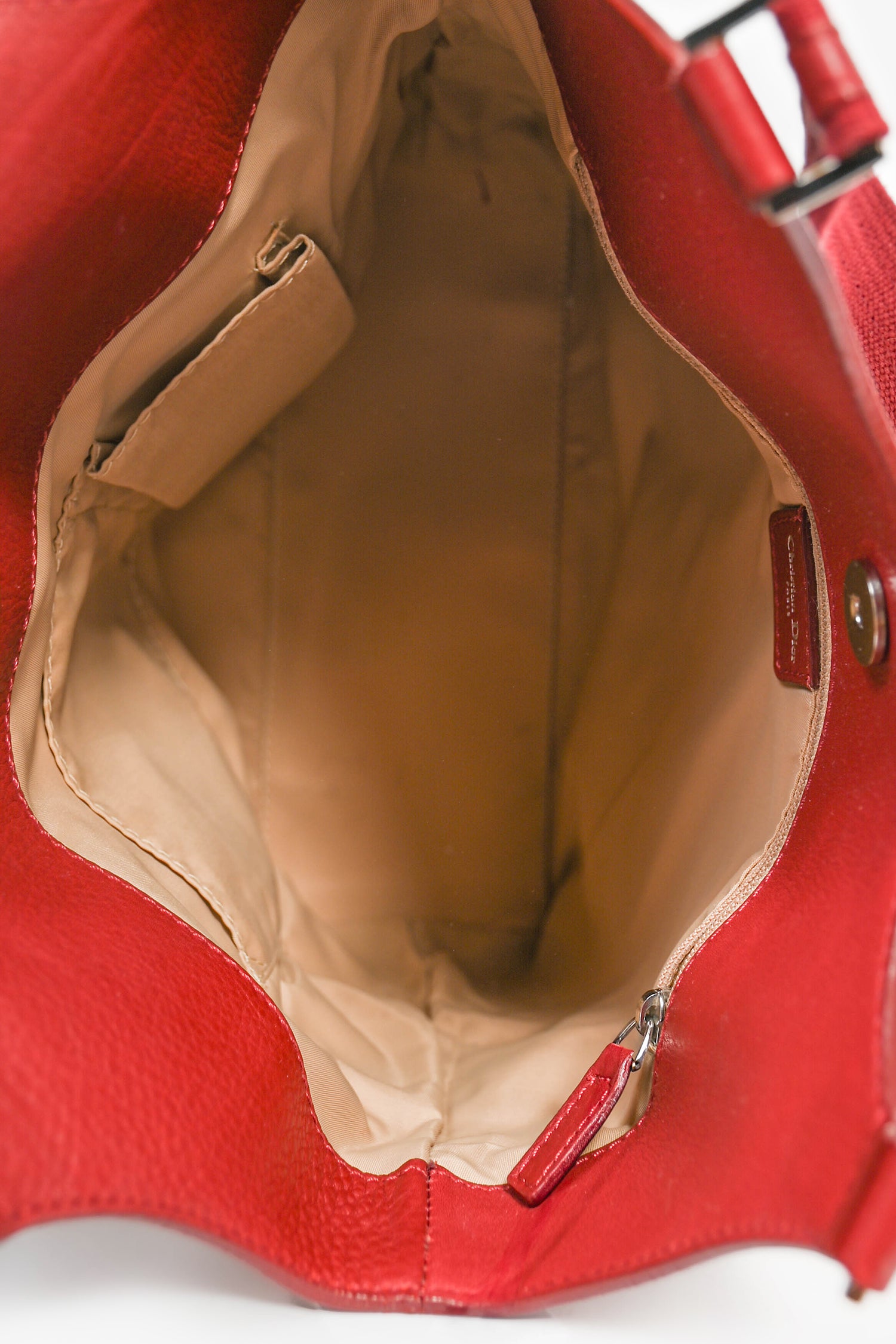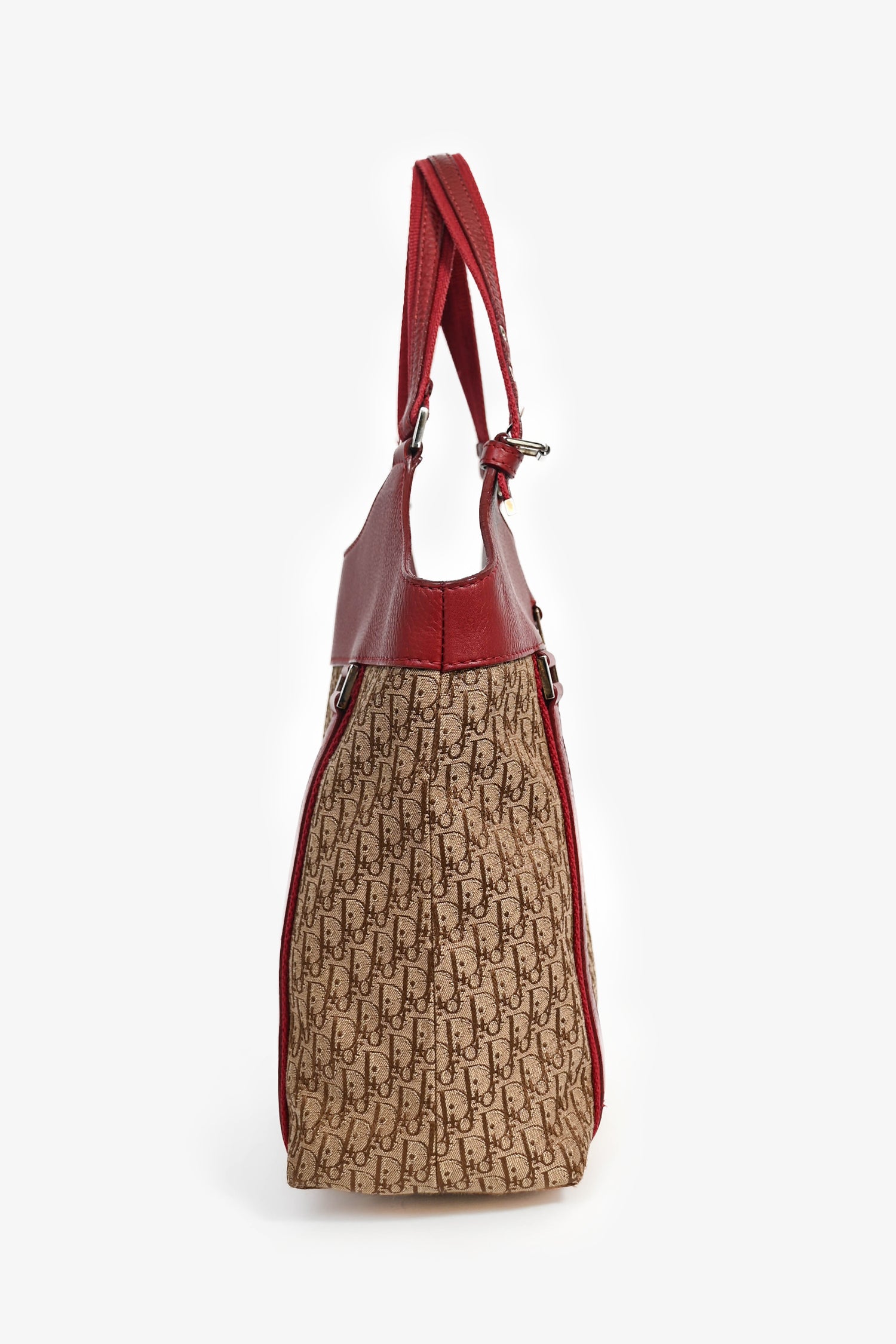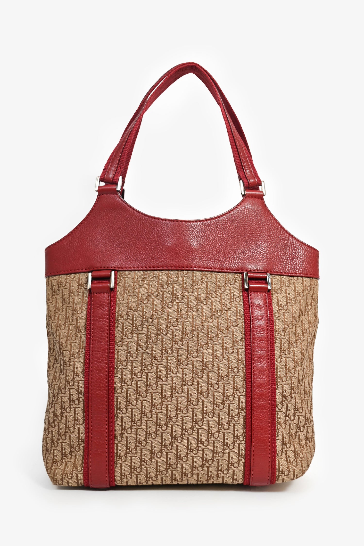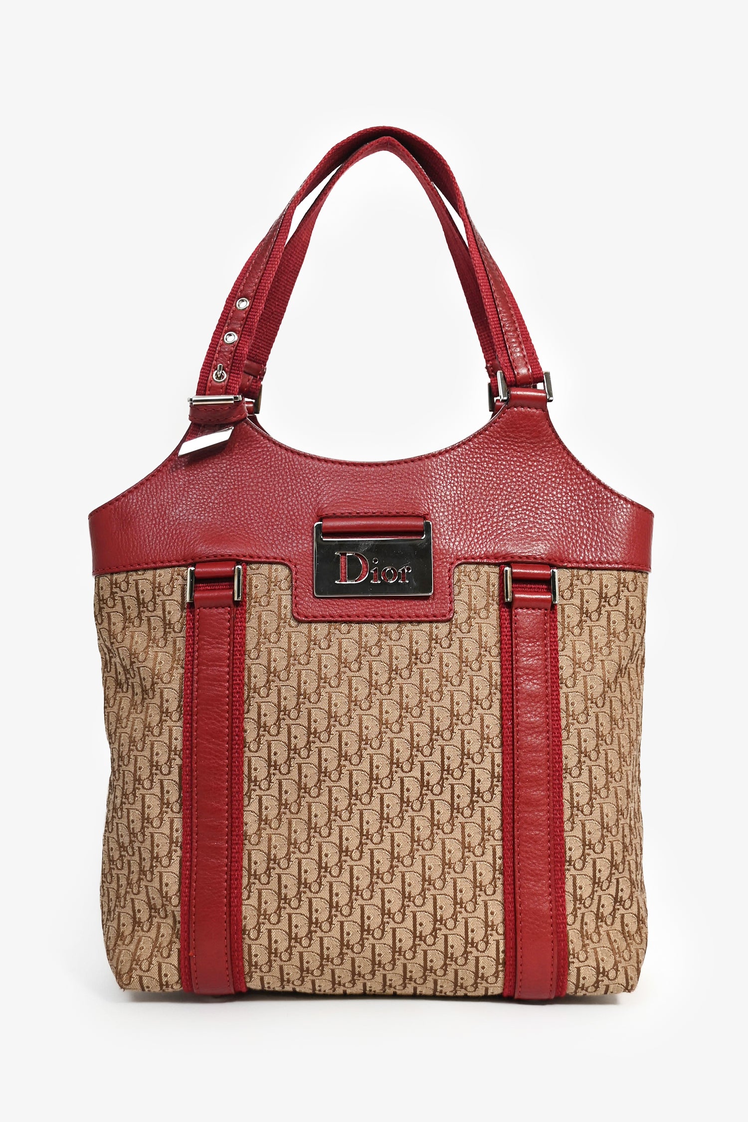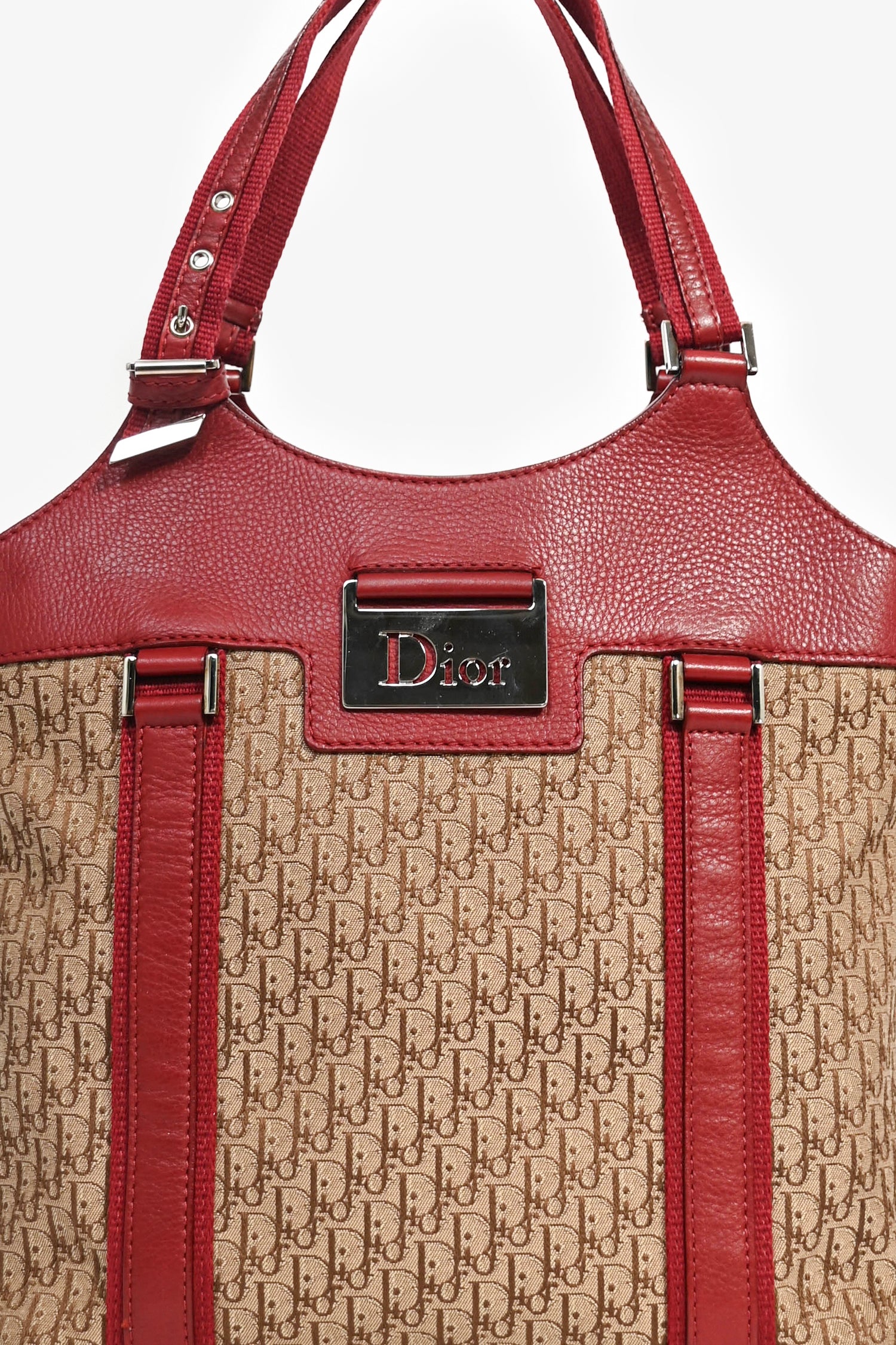 Refresh availabilityChristian Dior 2005 Vintage Brown Diorissimo Canvas/Red Leather Trim Tote Bag. Leather trimming. Silver-tone hardware. Webbed handles. Canvas exterior. Lined interior with a zipped compartment and 2 pockets. Tonal stitching.