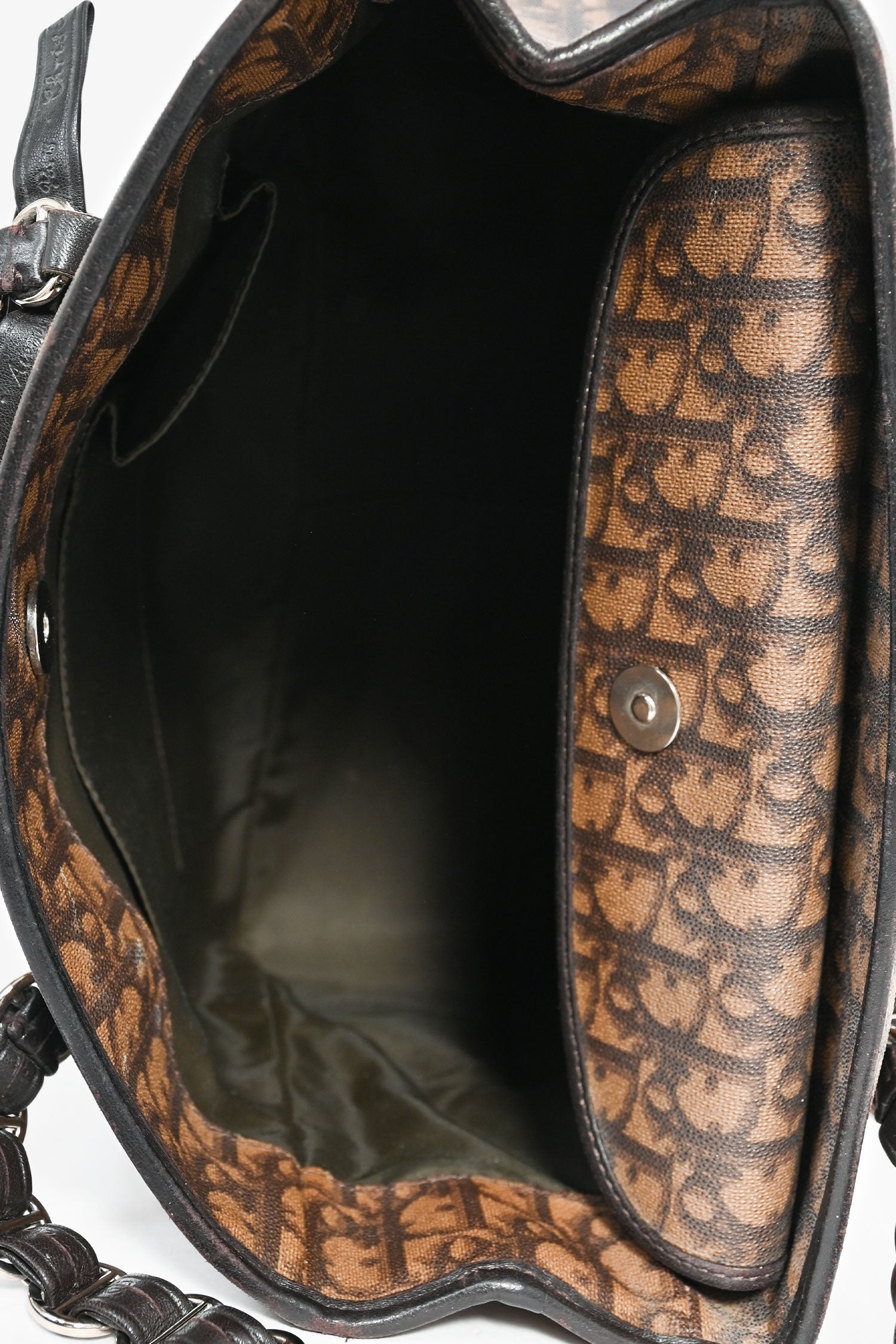Refresh availabilityChristian Dior 2006 Brown Coated Canvas/Leather Trim Oblique Shoulder Bag. Silver-tone hardware. Leather trimming. Coated canvas. Fold-over interior flap. Concealed magnetic closure. Lined interior. Zipped interior with 2 pockets. Tonal stitching.