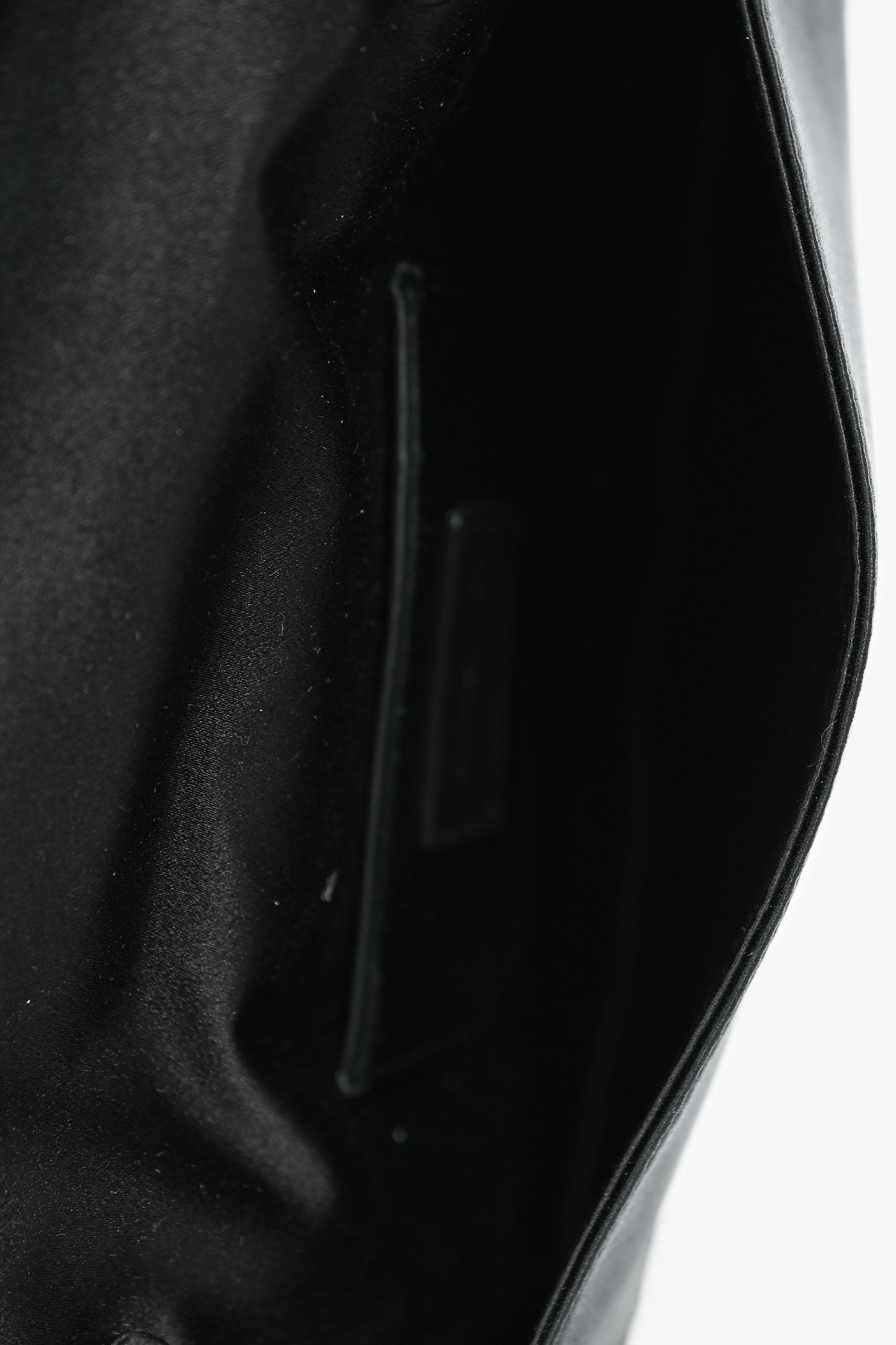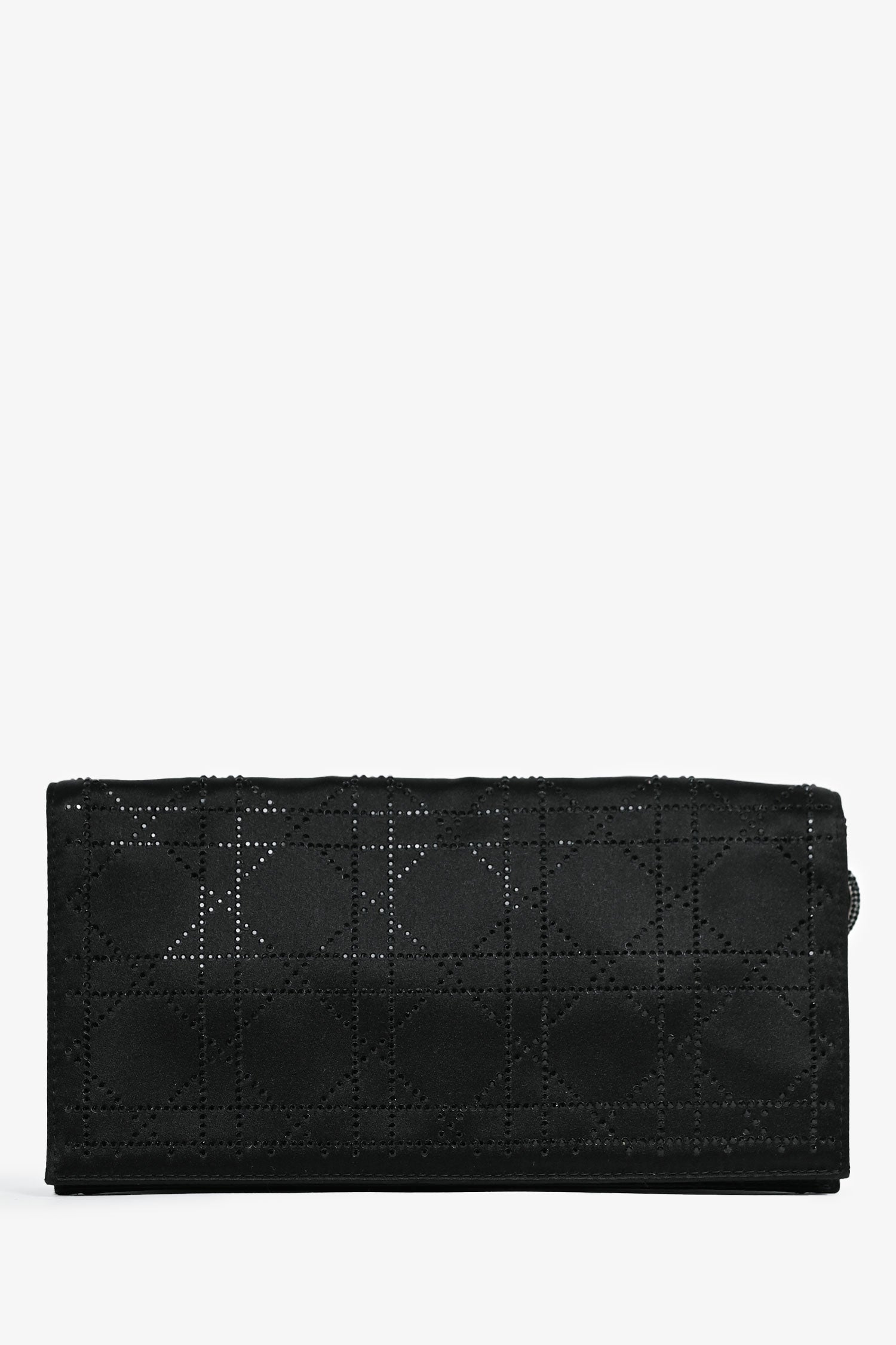 Refresh availabilityChristian Dior 2008 Black Satin Crystal Cannage Clutch On Chain. Fold-over flap with a snap closure. Crystal embellishment. Chain-link strap. Single slip card pocket. Tonal stitching.