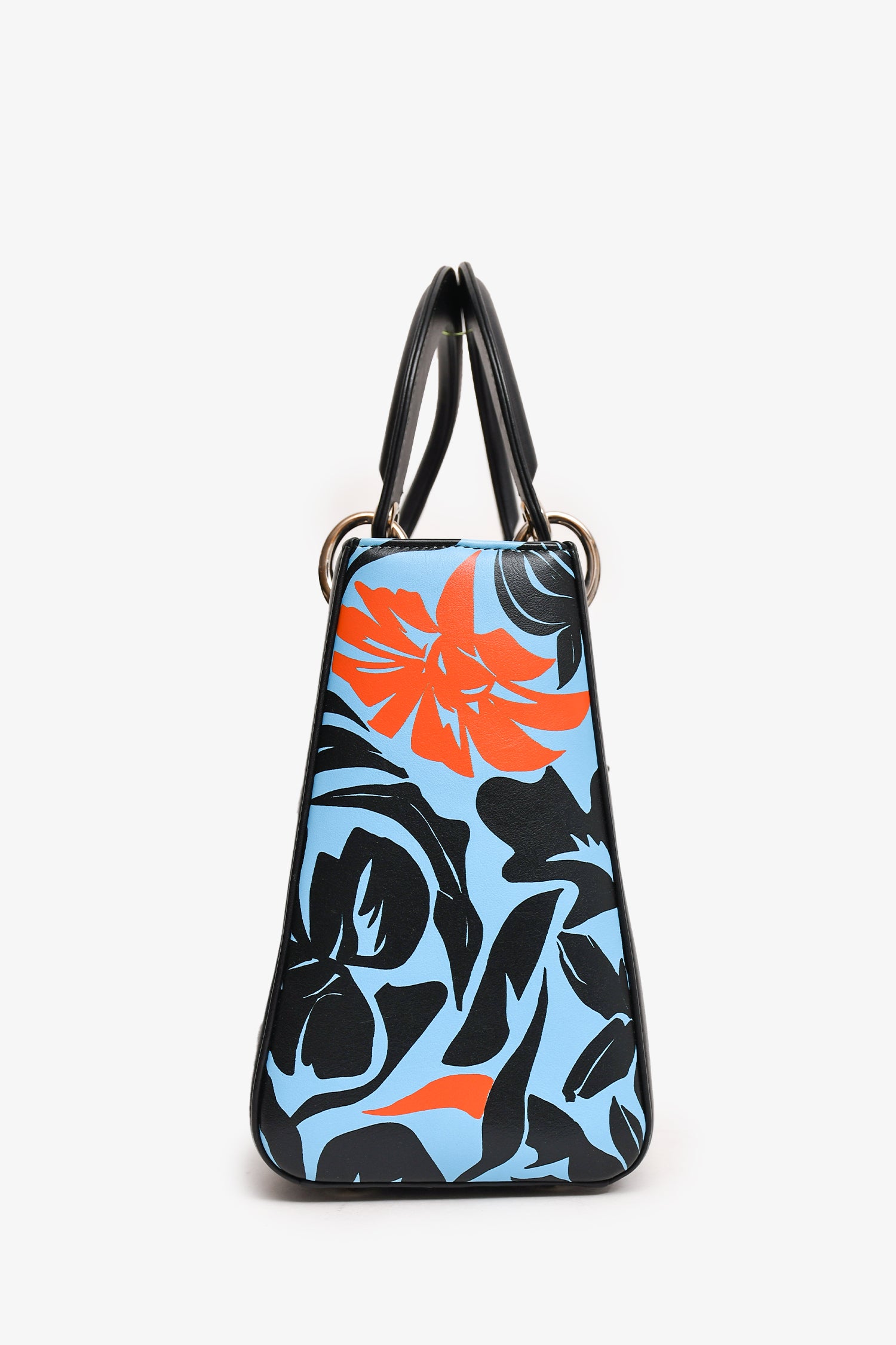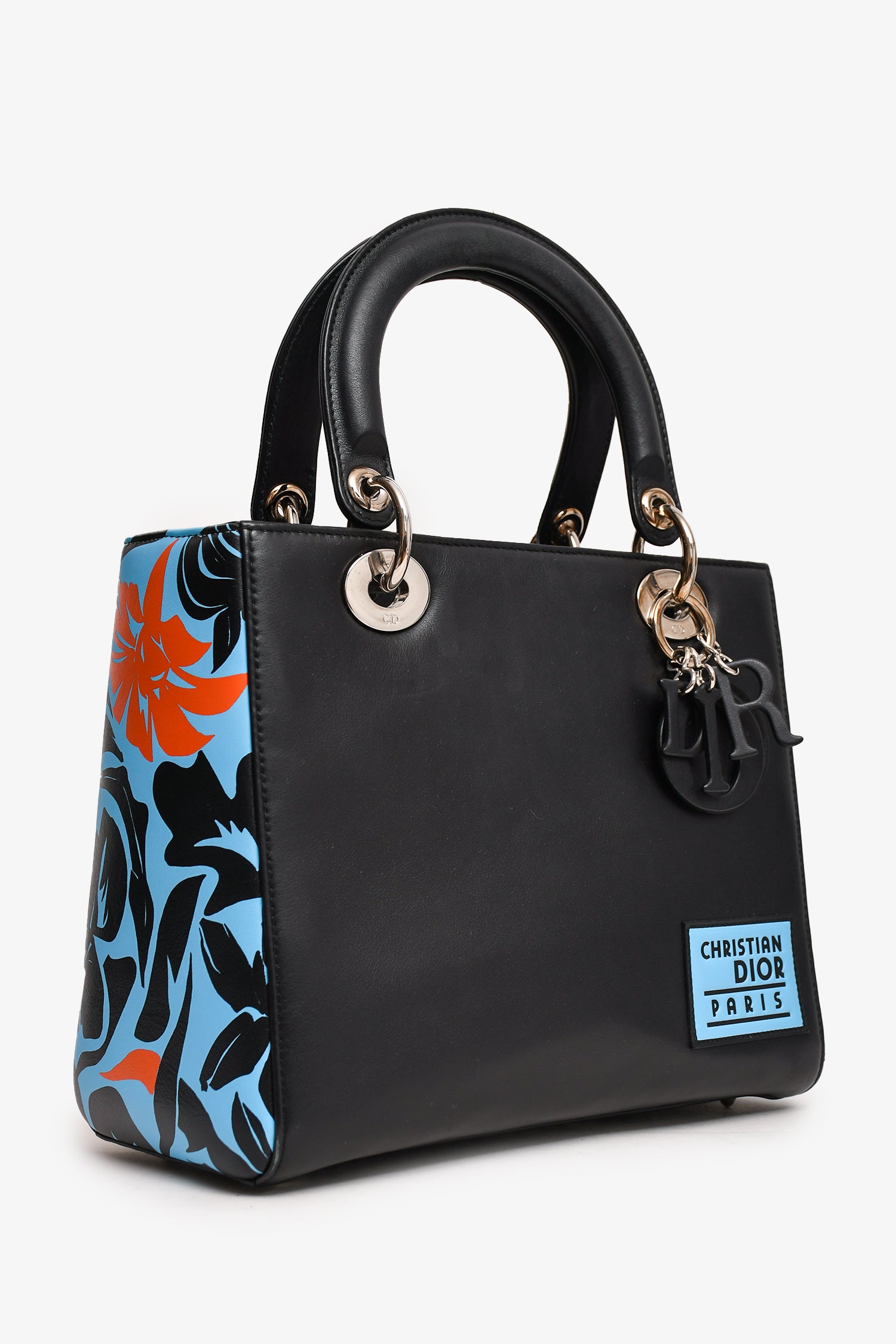 Refresh availabilityChristian Dior 2016 Black/Blue Leather Floral Printed Lady Dior. Silver-tone hardware. Flat top handles with a chain-link attachment. Leather 'DIOR' charms. Blue/orange floral motif at the sides. Bag feet at the base. Upper zipped fastening. Interior zipped compartment. Comes with a strap.
