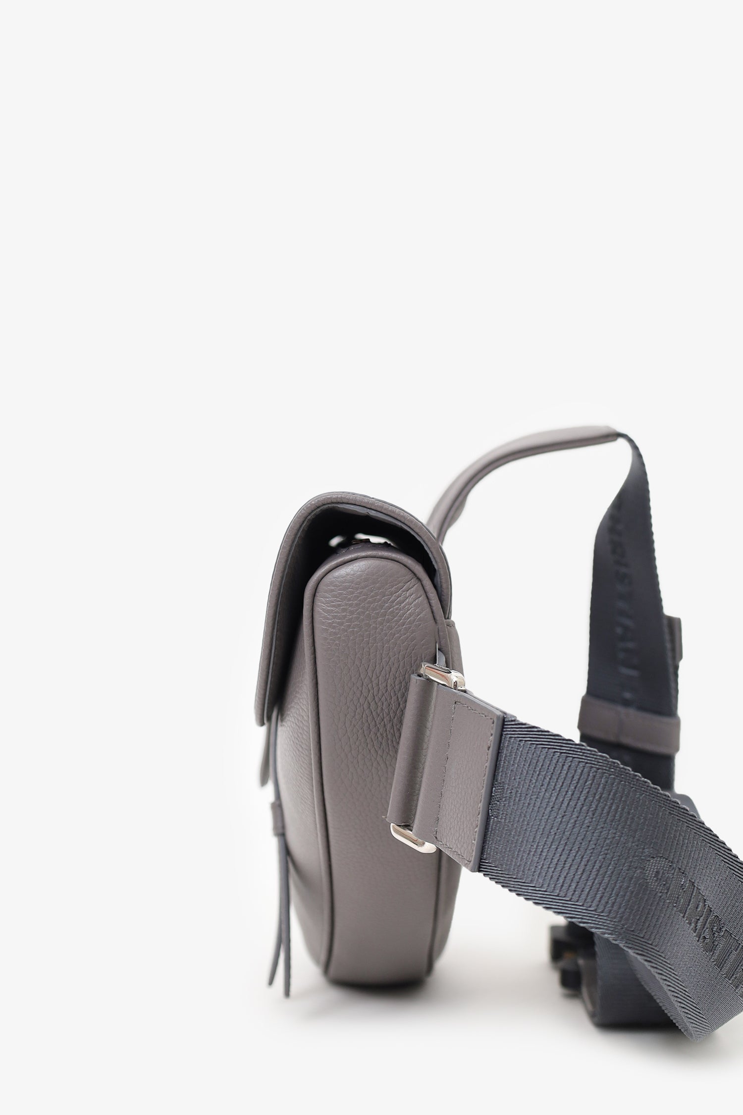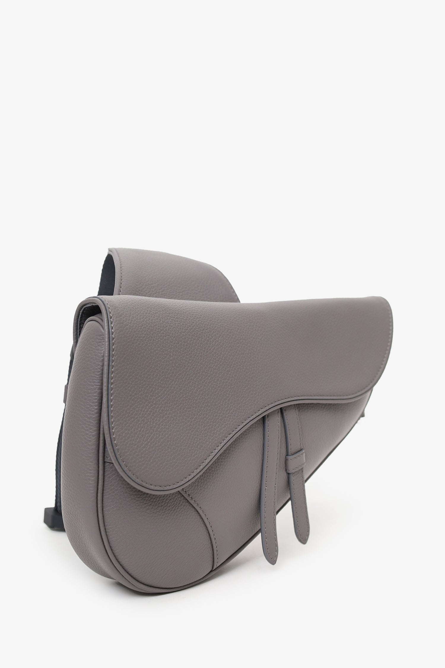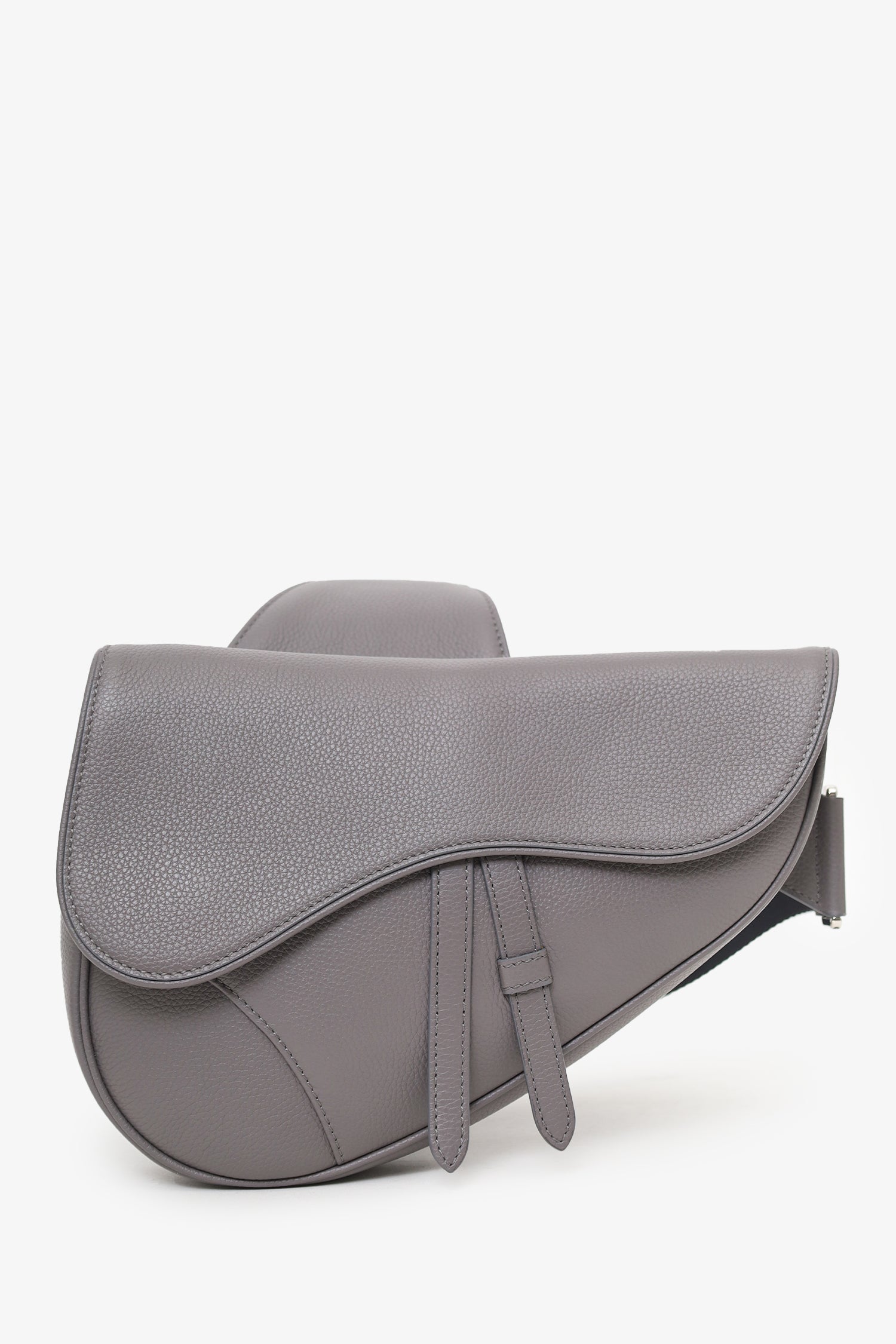 Refresh availabilityChristian Dior 2019 Grey Grained Calfskin Saddle Bag. Front fold-over flap with magnetic closure. Top zip closure underneath fold-over flap. Crossbody adjustable strap with magnetic closure. Open fabric-lined interior. Silver-toned hardware. Tonal stitching.
