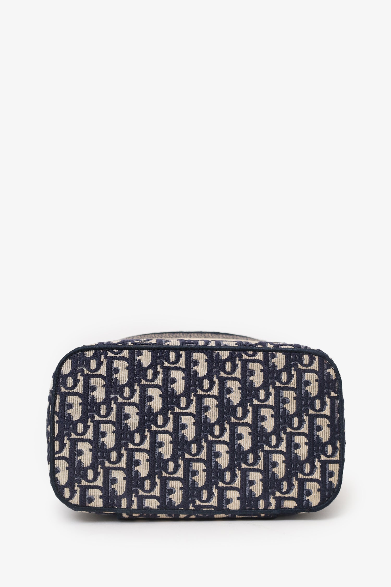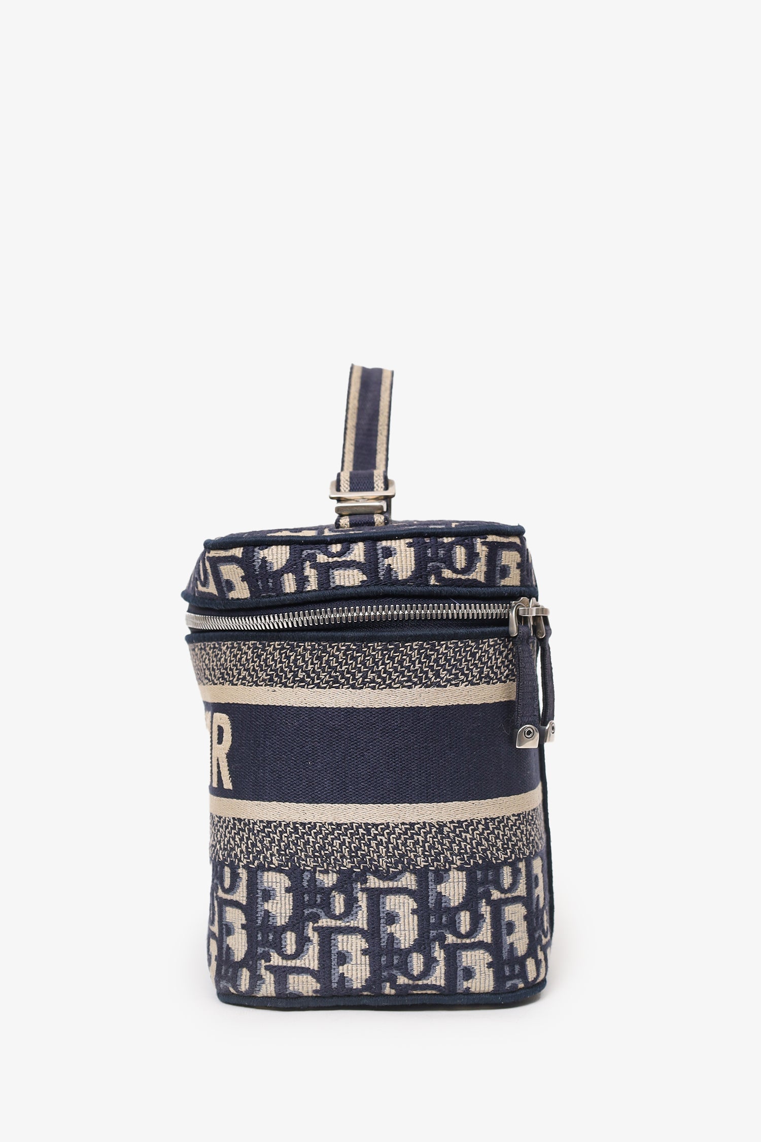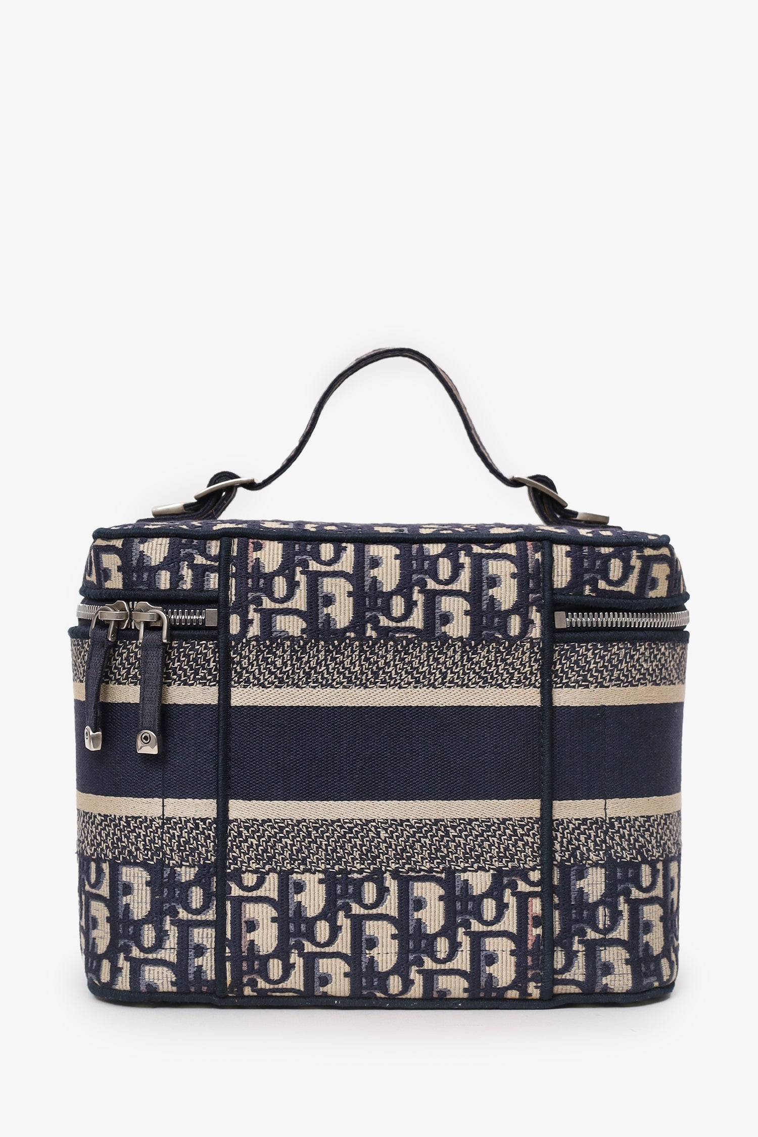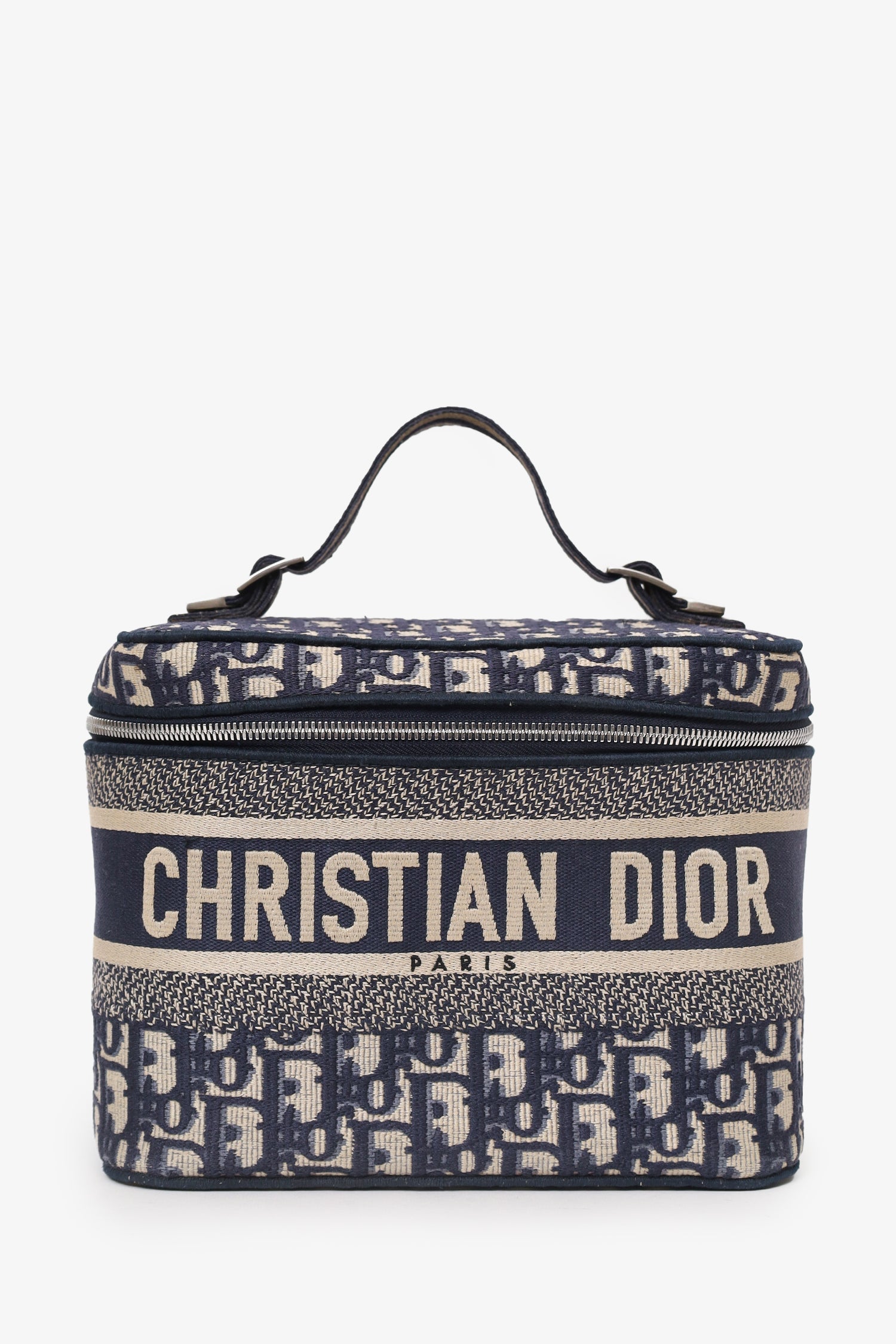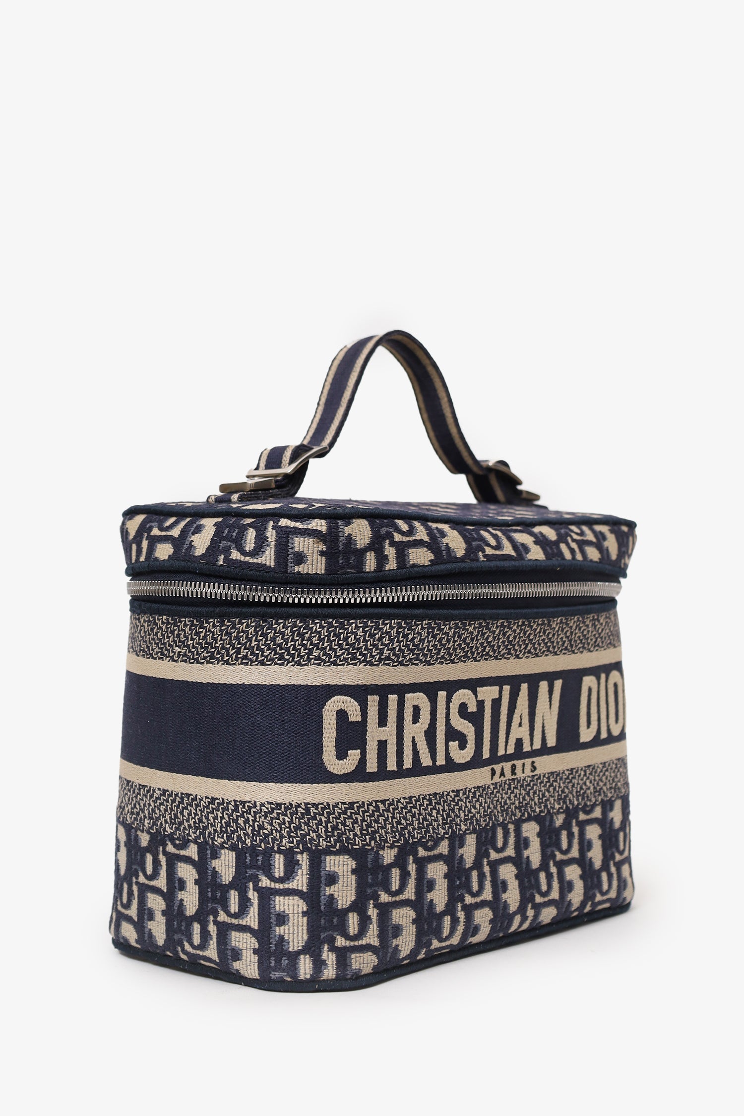 Refresh availabilityChristian Dior 2019 Navy Oblique Monogram Dior travel Vanity Case. Front double zip closure. Top handle with buckle details. 3 interior slip pockets. Single interior zip pocket on top wall. Tonal stitching. Silver-tone hardware.