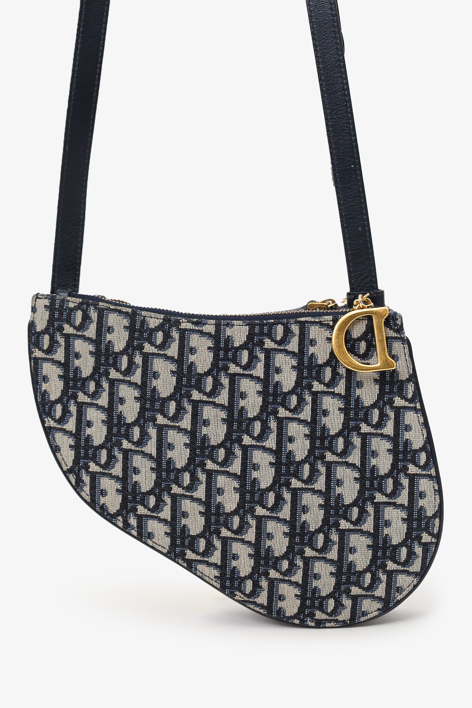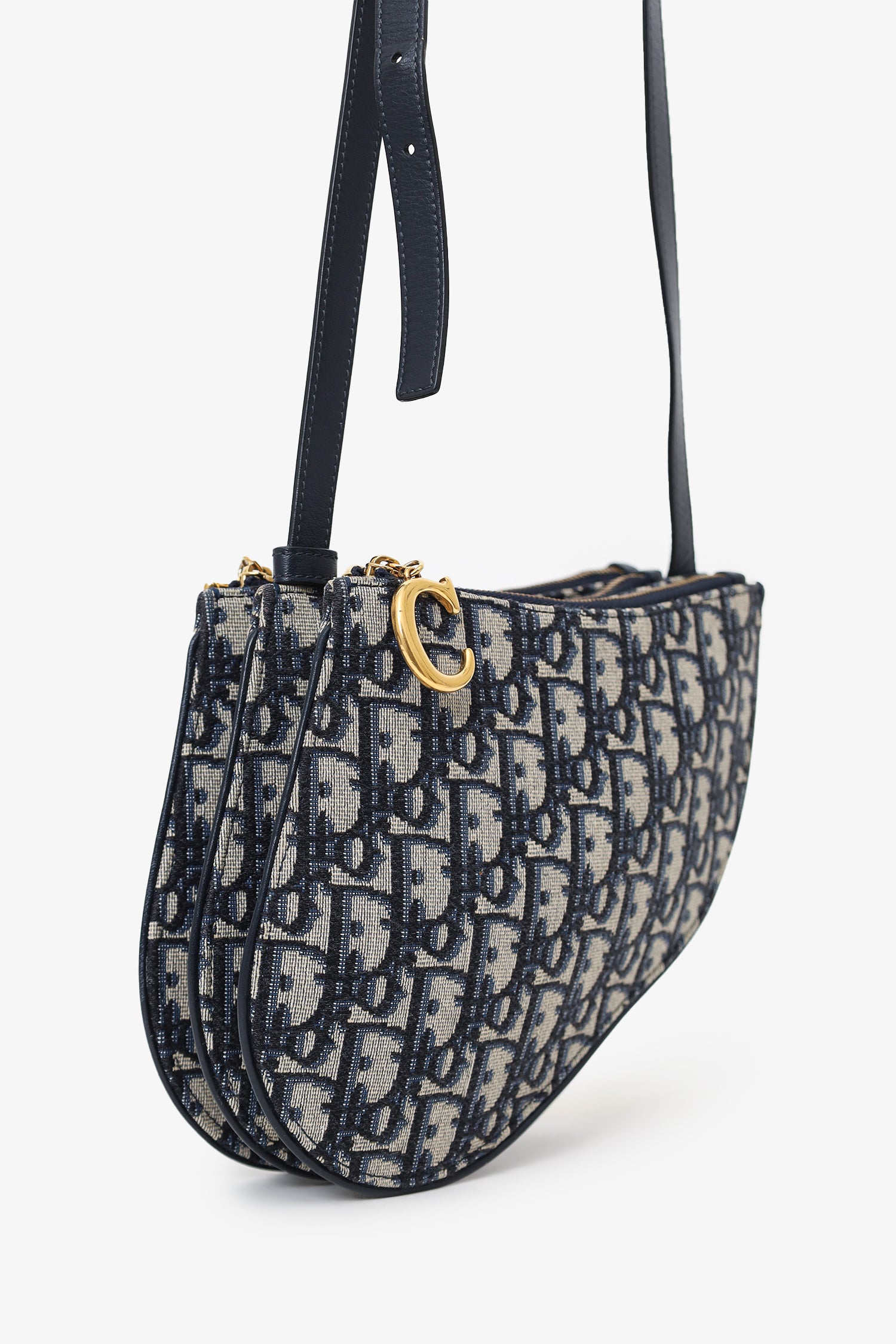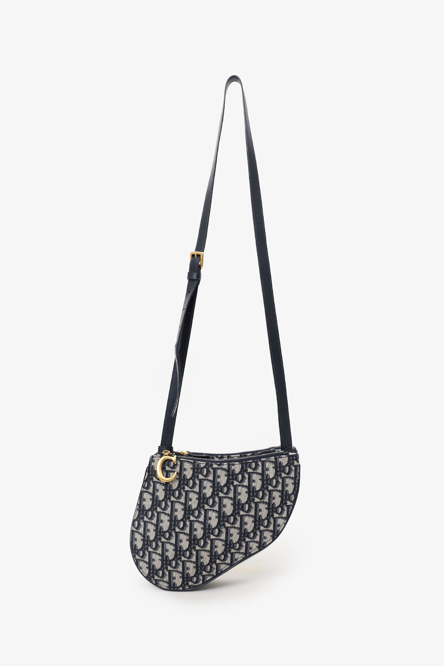 Refresh availabilityChristian Dior 2019 Oblique Canvas Saddle Triple Zip Crossbody bag. Top zip closure. 3 zip compartments. Crossbody strap with adjustable buckle closure. Canvas lined interior. Gold-tone hardware. Tonal stitching.