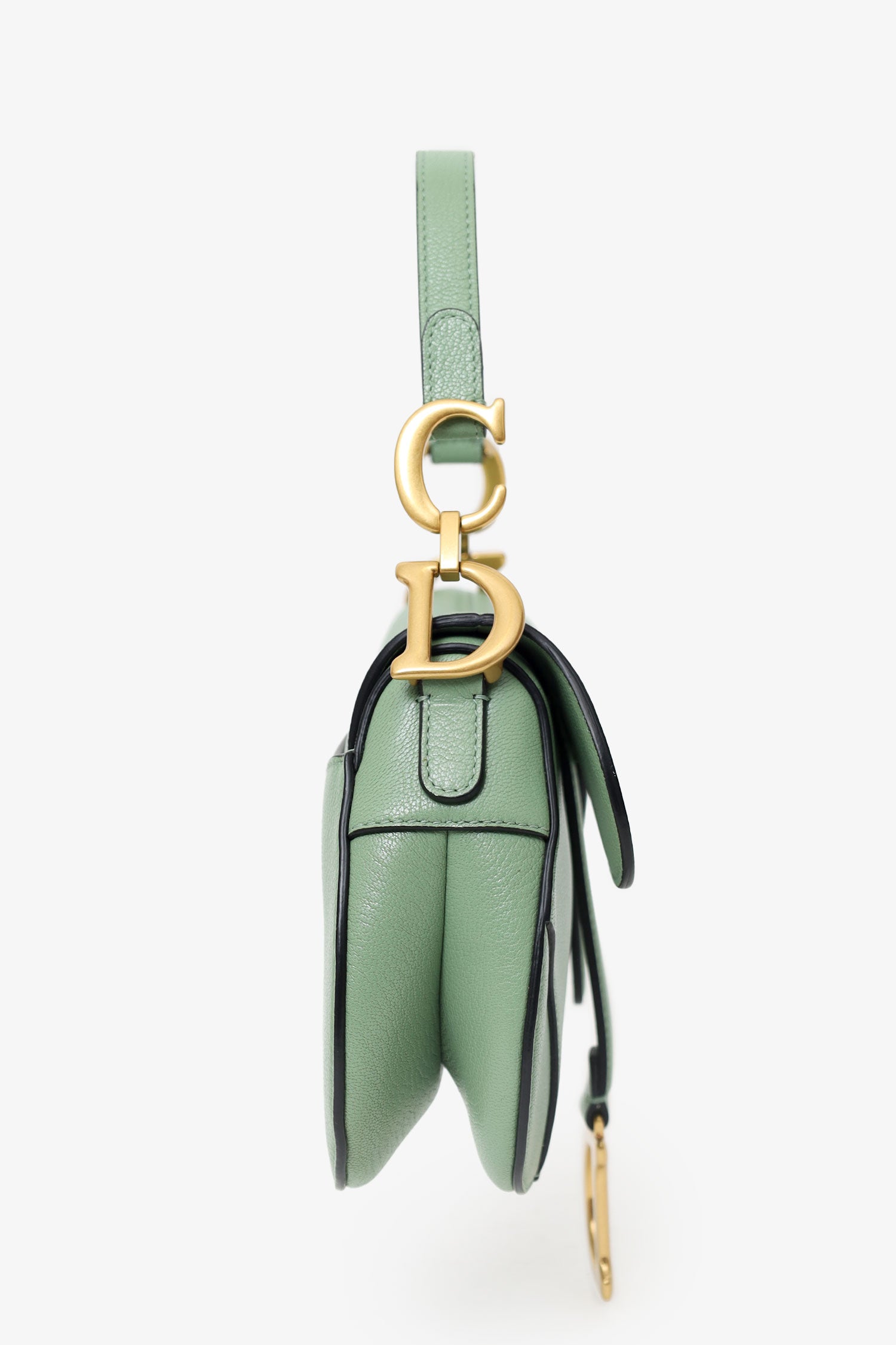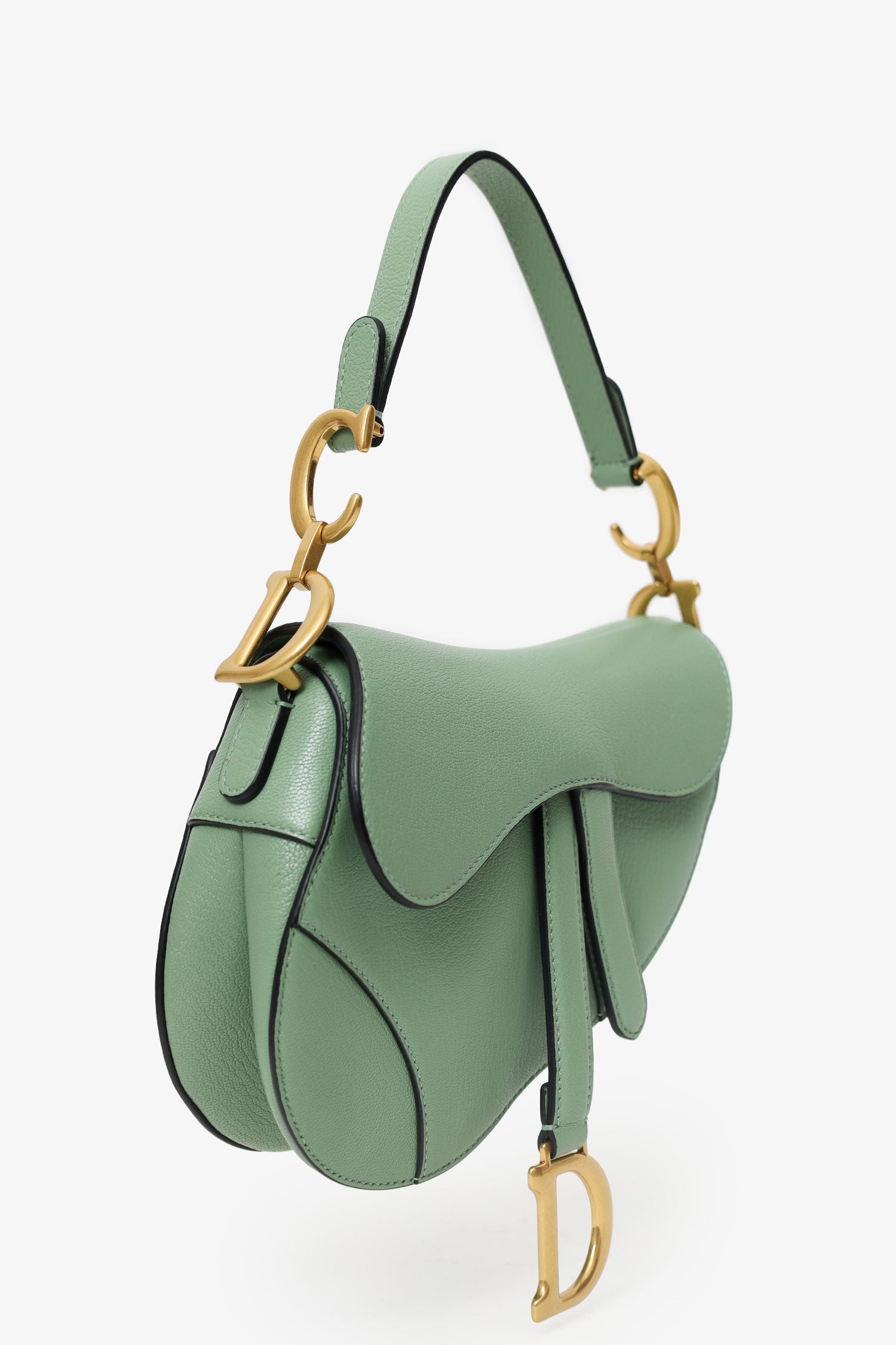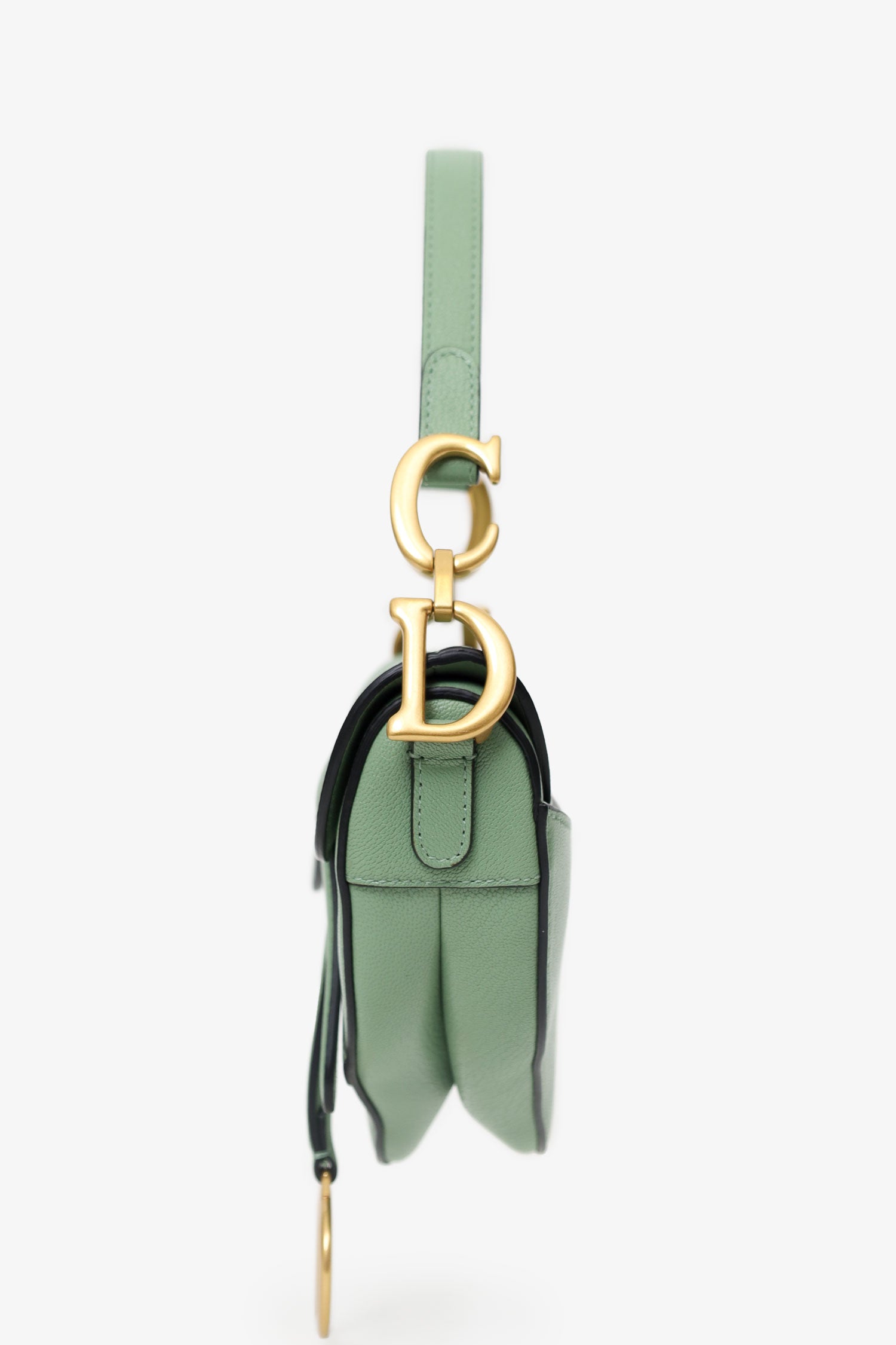 Refresh availabilityChristian Dior 2020 Green Leather Mini Saddle Bag. Front fold-over flap with magnetic closure. Top handle. Lined interior. Gold-tone hardware. Tonal stitching.