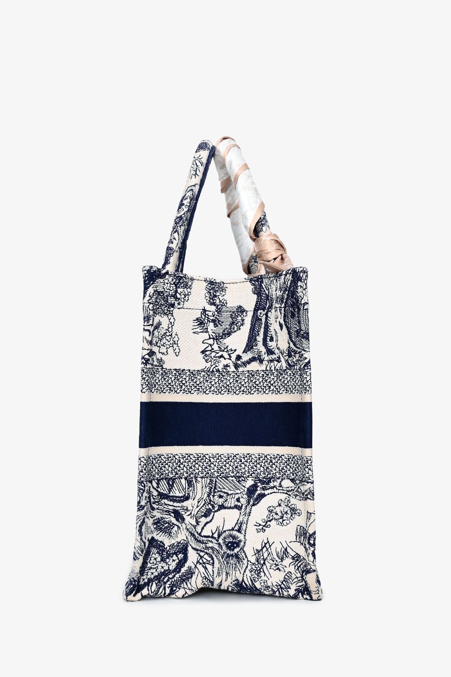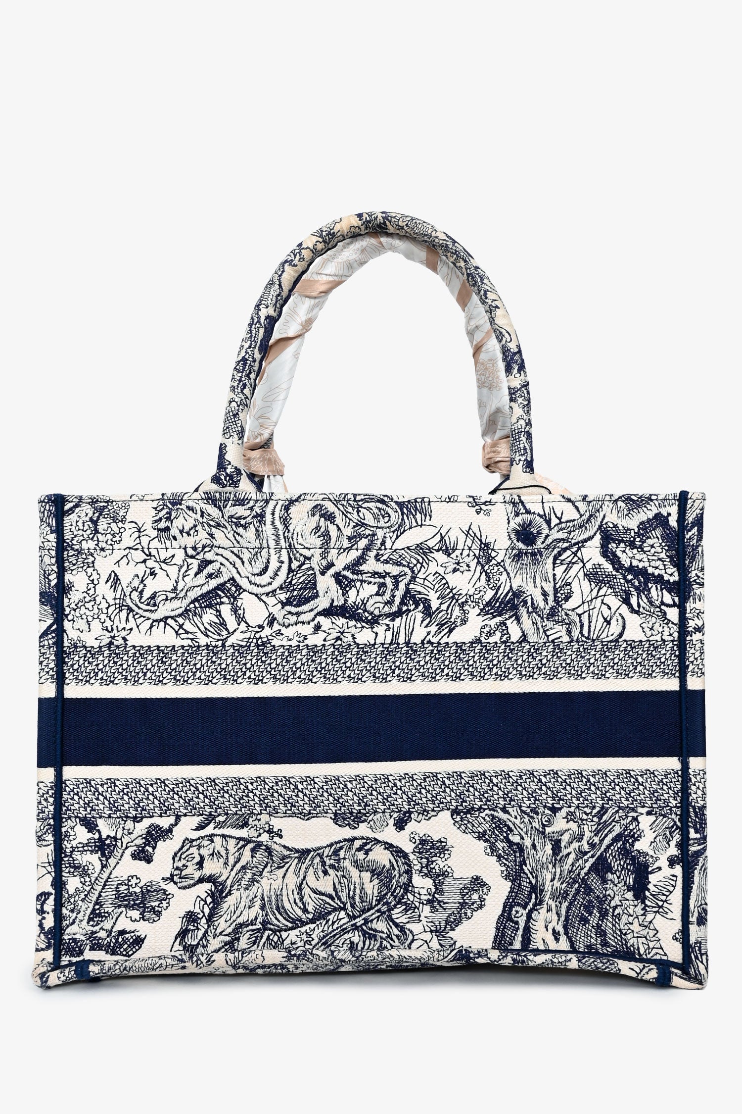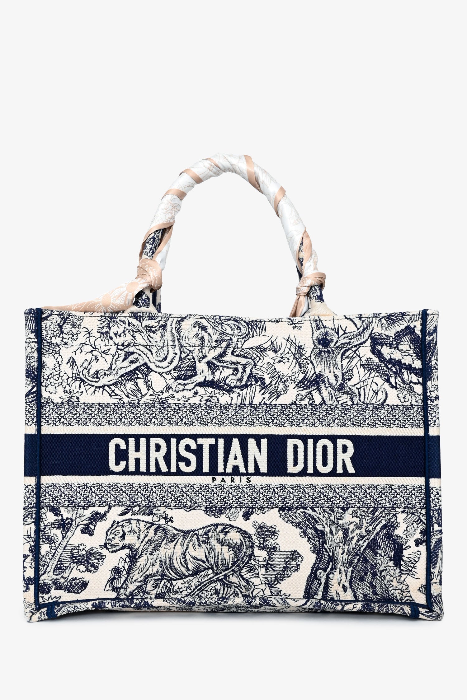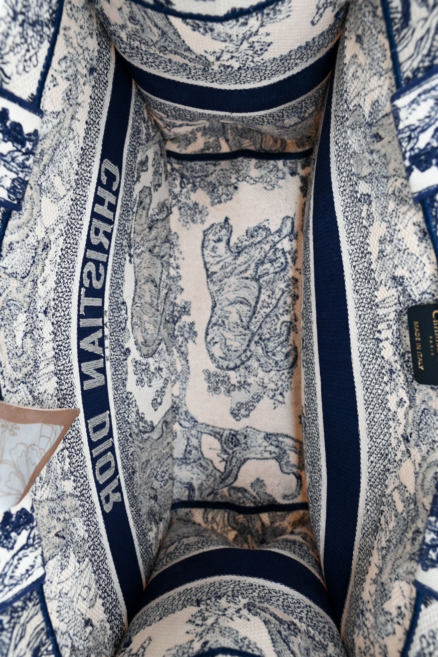 Refresh availabilityChristian Dior 2021 Navy/White Toile de Jouy Embroidered Medium Book Tote. Open top. Dual embroidered top handles. Non branded Twilly. Unlined interior. Tonal stitching.