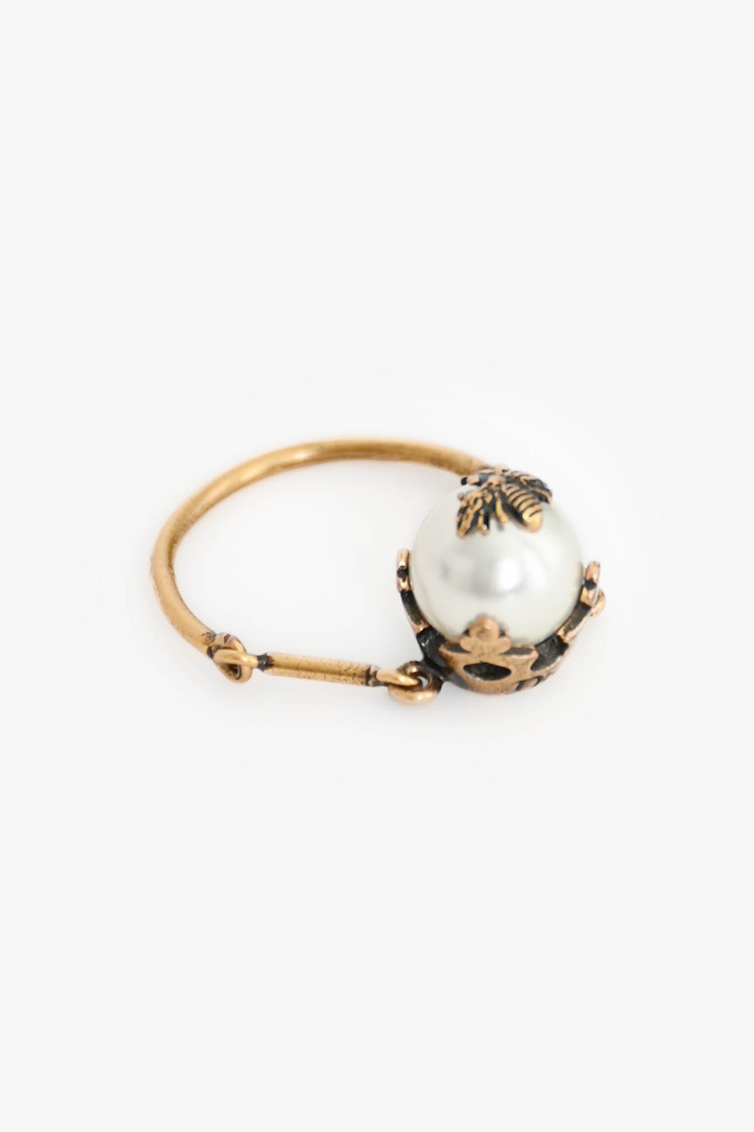 Christian Dior Antique Gold Toned Metal Faux Pearl Ring Size M