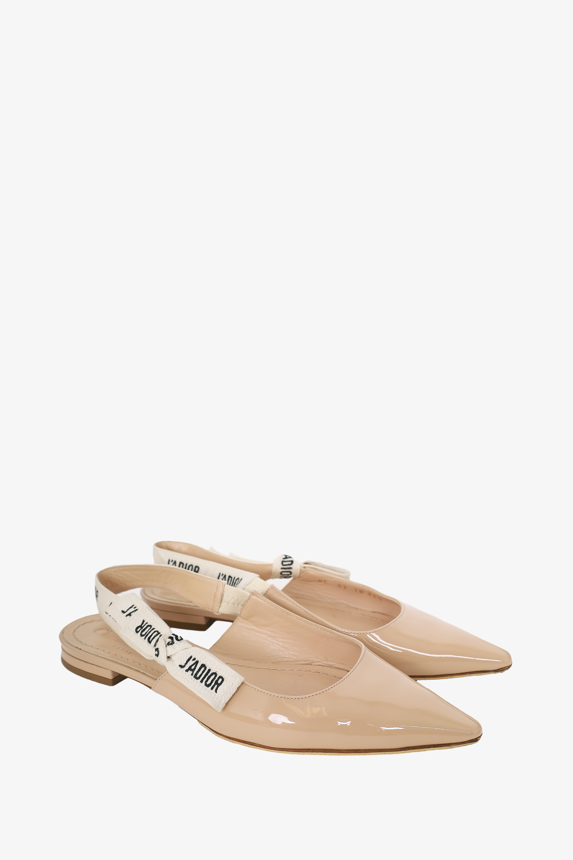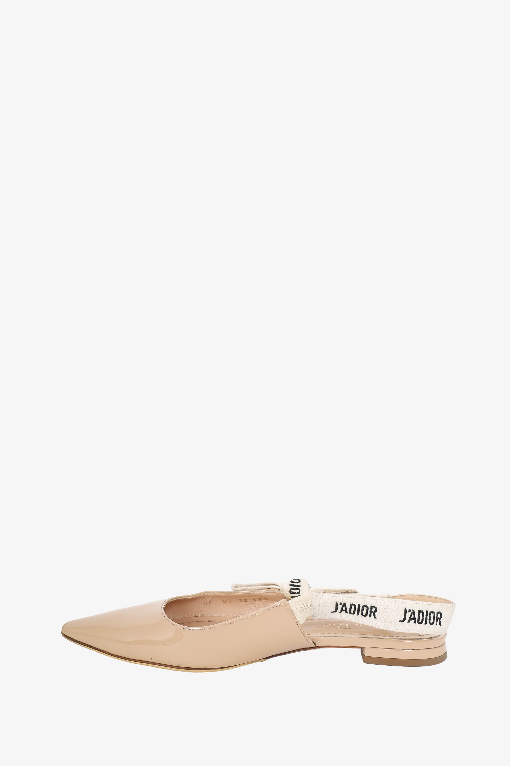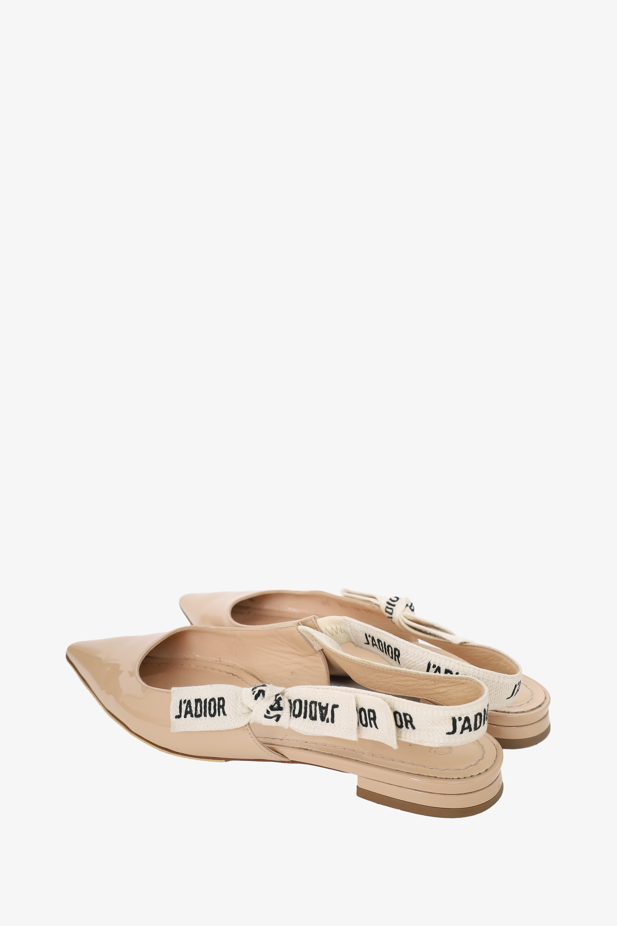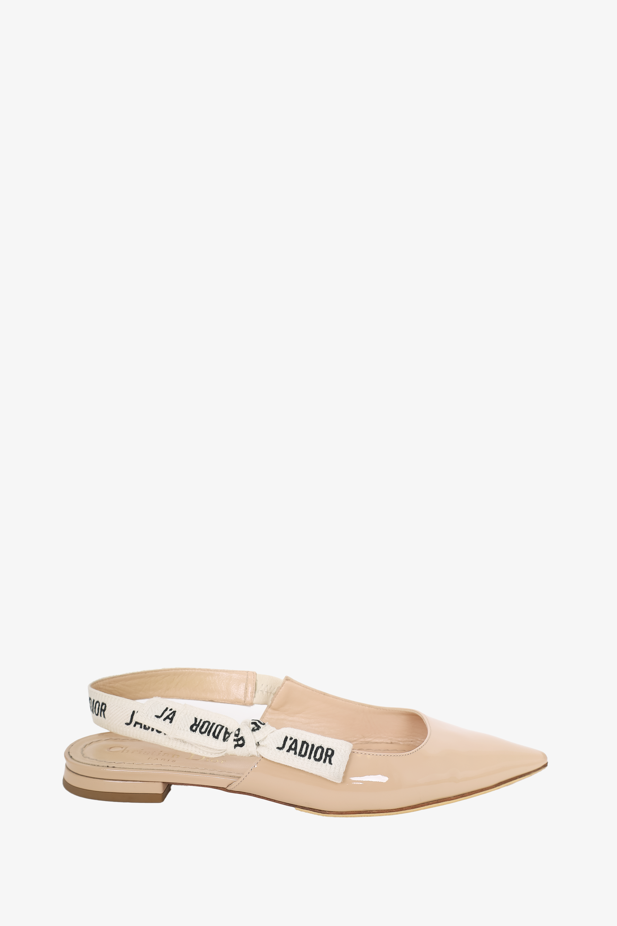 Refresh availabilityChristian Dior Beige Patent J'Adior Slingback Flats. Slip-on. Pointed toe. Glossy finish. Tonal stitching.
