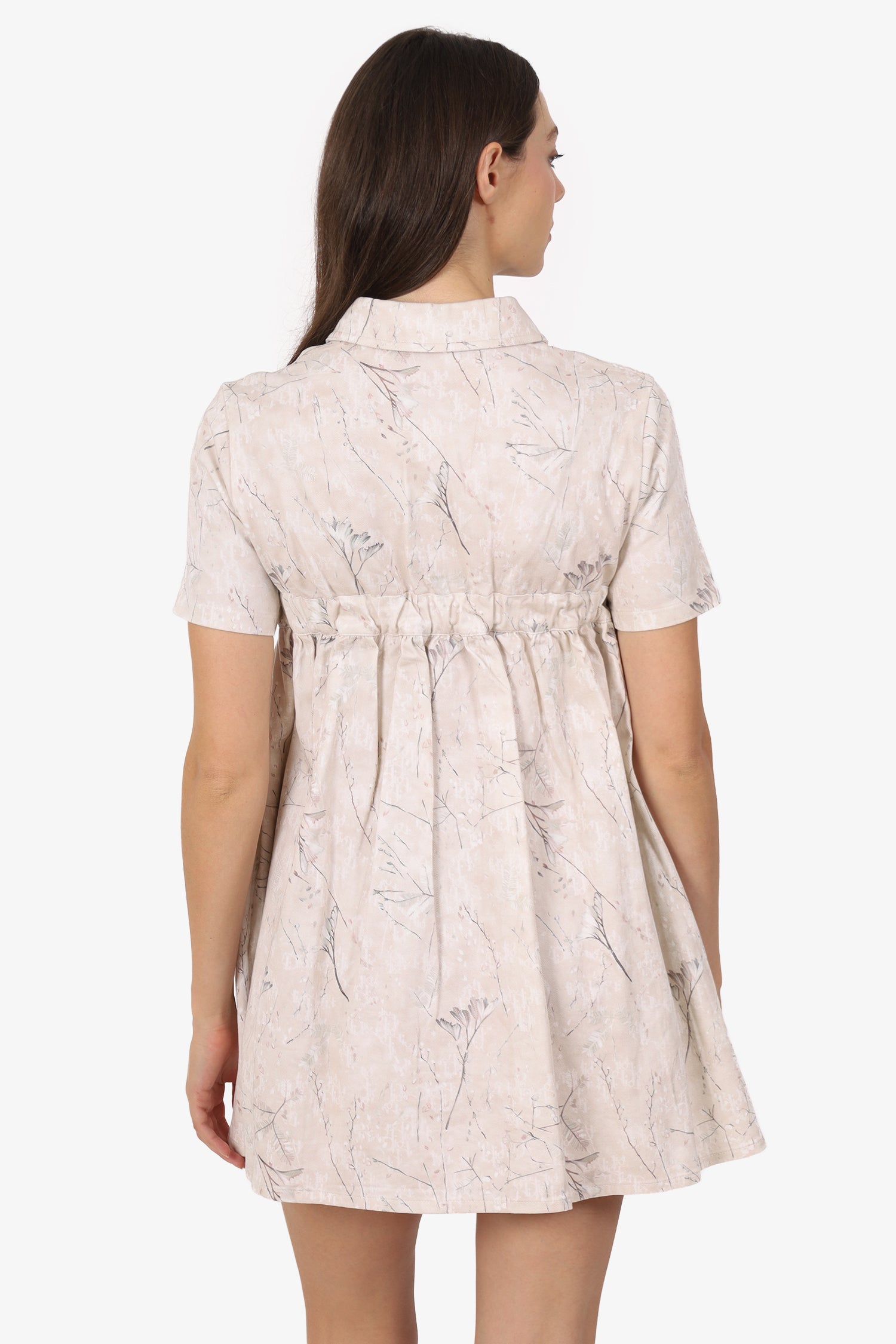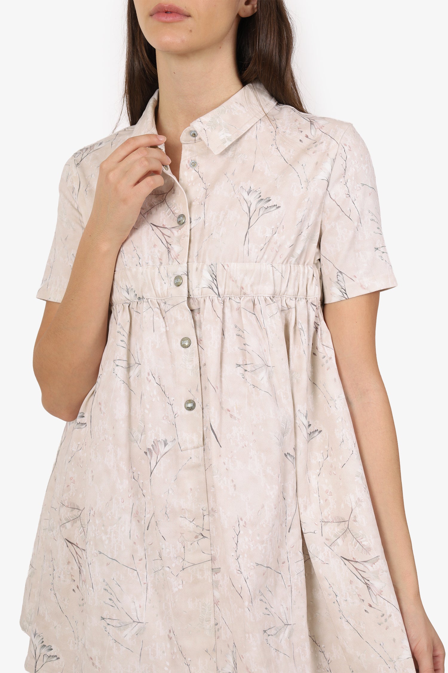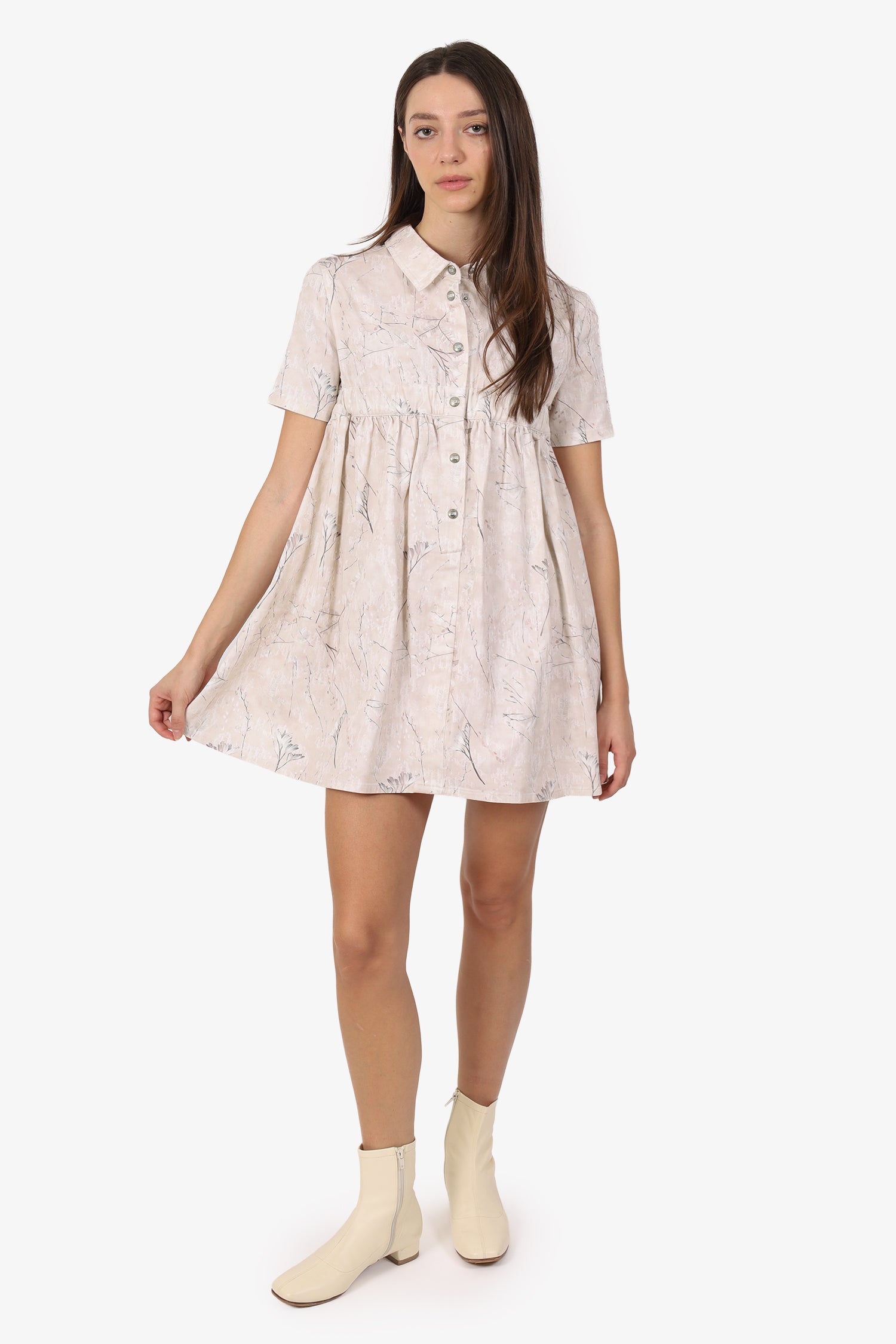 Refresh availabilityChristian Dior Beige/White Floral Print Short Sleeve Mini Dress. Slip-on. Collared neckline. Front snap button-up closure. Elasticated waistband. Silver-tone hardware. Tonal stitching.