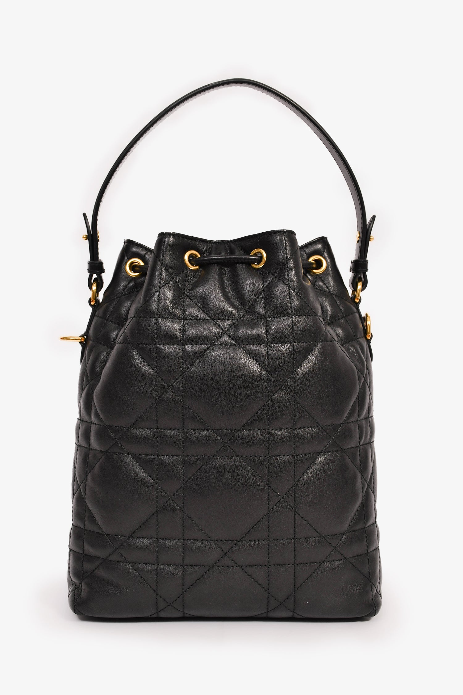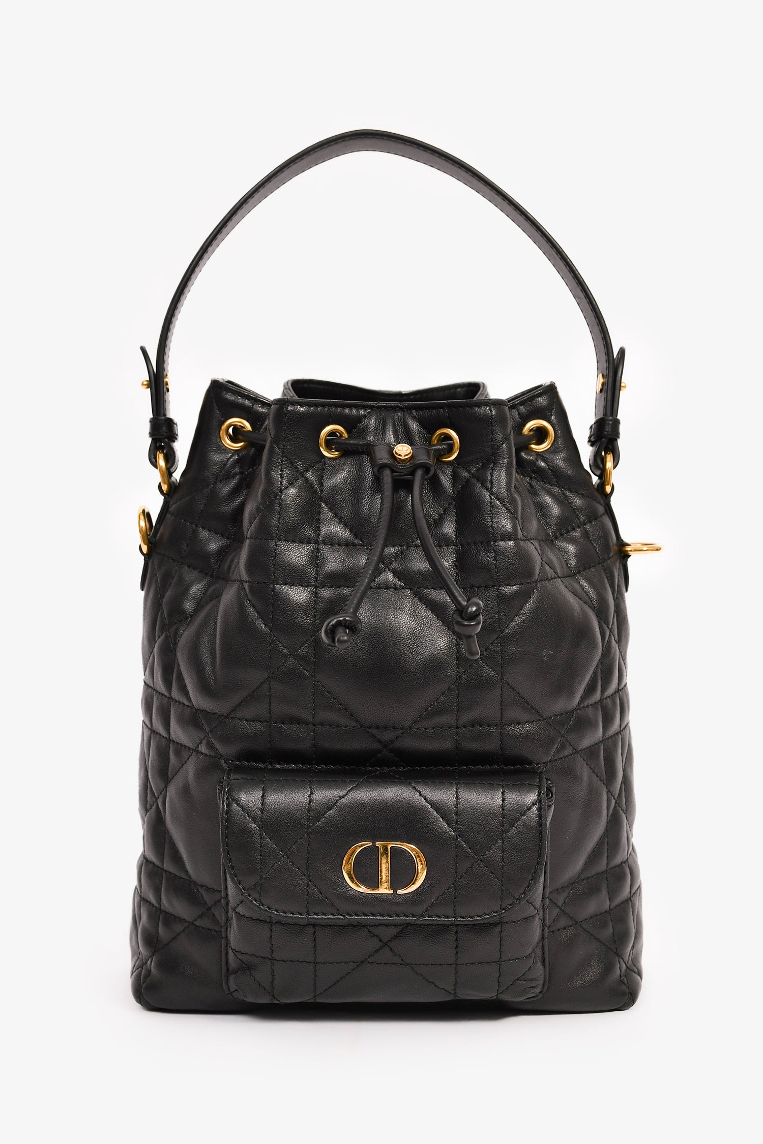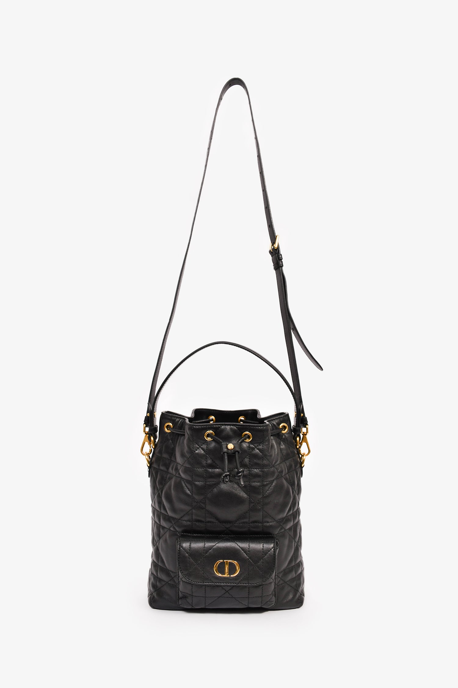 Refresh availabilityChristian Dior Black Cannage Leather 'Caro' Small Bucket Bag. Gold-tone hardware. Flat top handle. Adjustable pull-tab. Lined leather interior with a single pocket. Adjustable and removable shoulder strap. Tonal stitching.