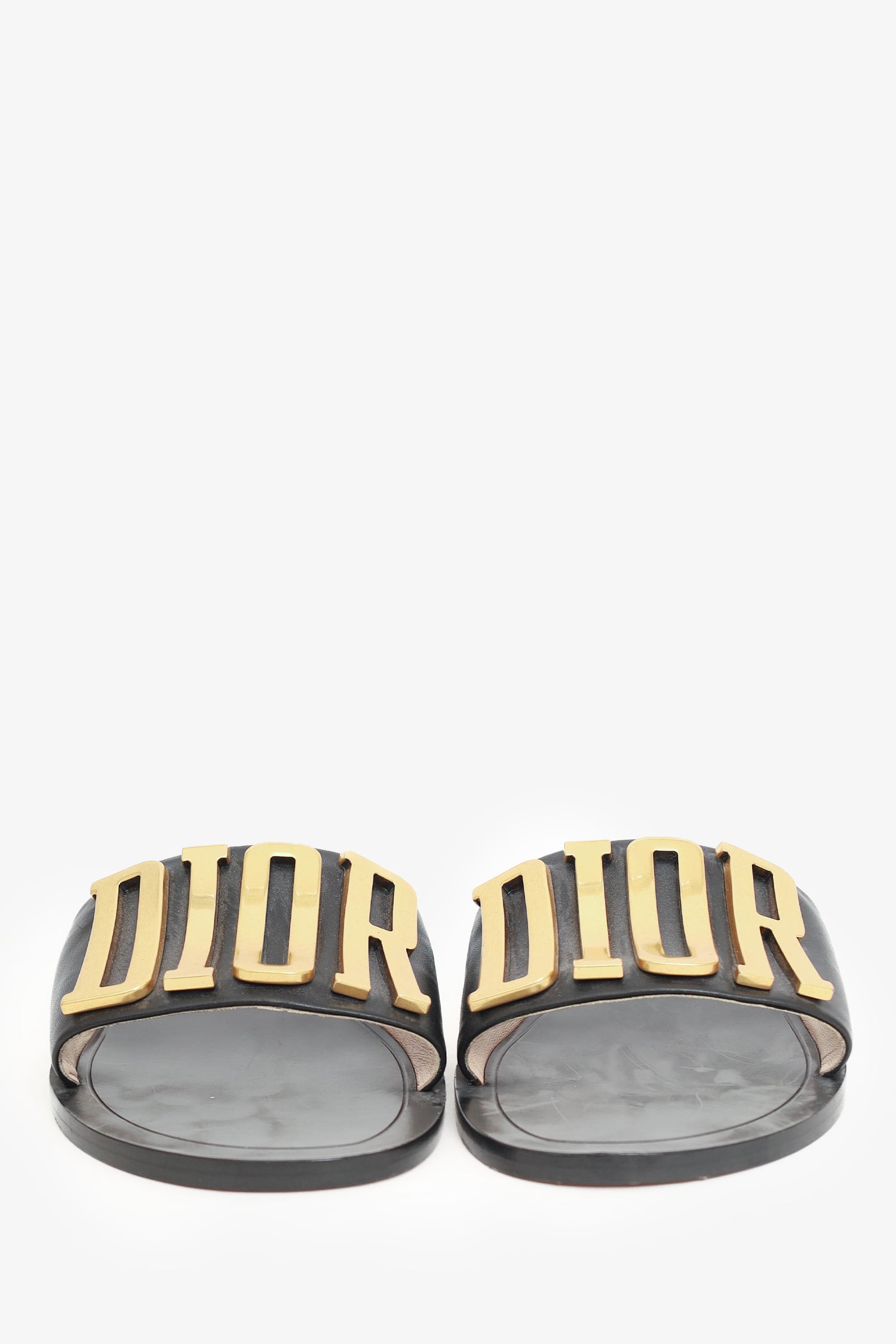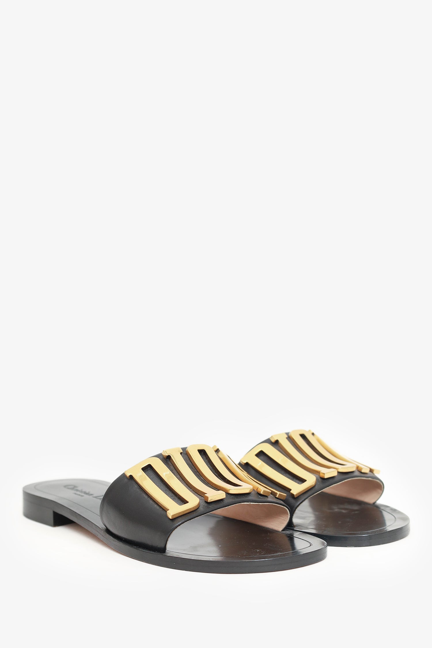 Christian Dior Black Leather Dior Evolution Flat Slides. Slip-on. Open round toe. Gold-tone hardware. Tonal stitching.