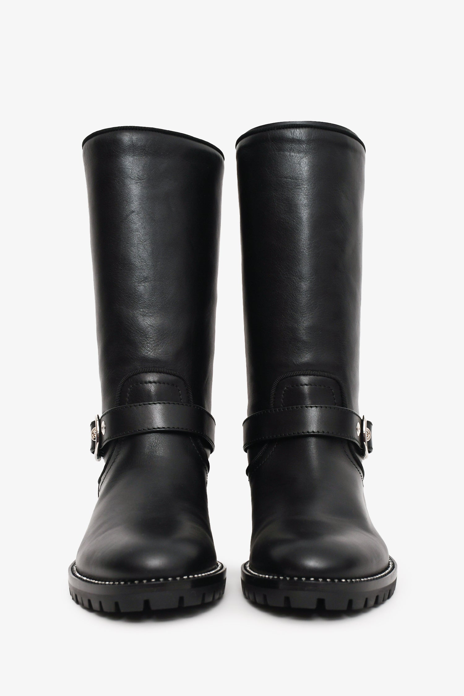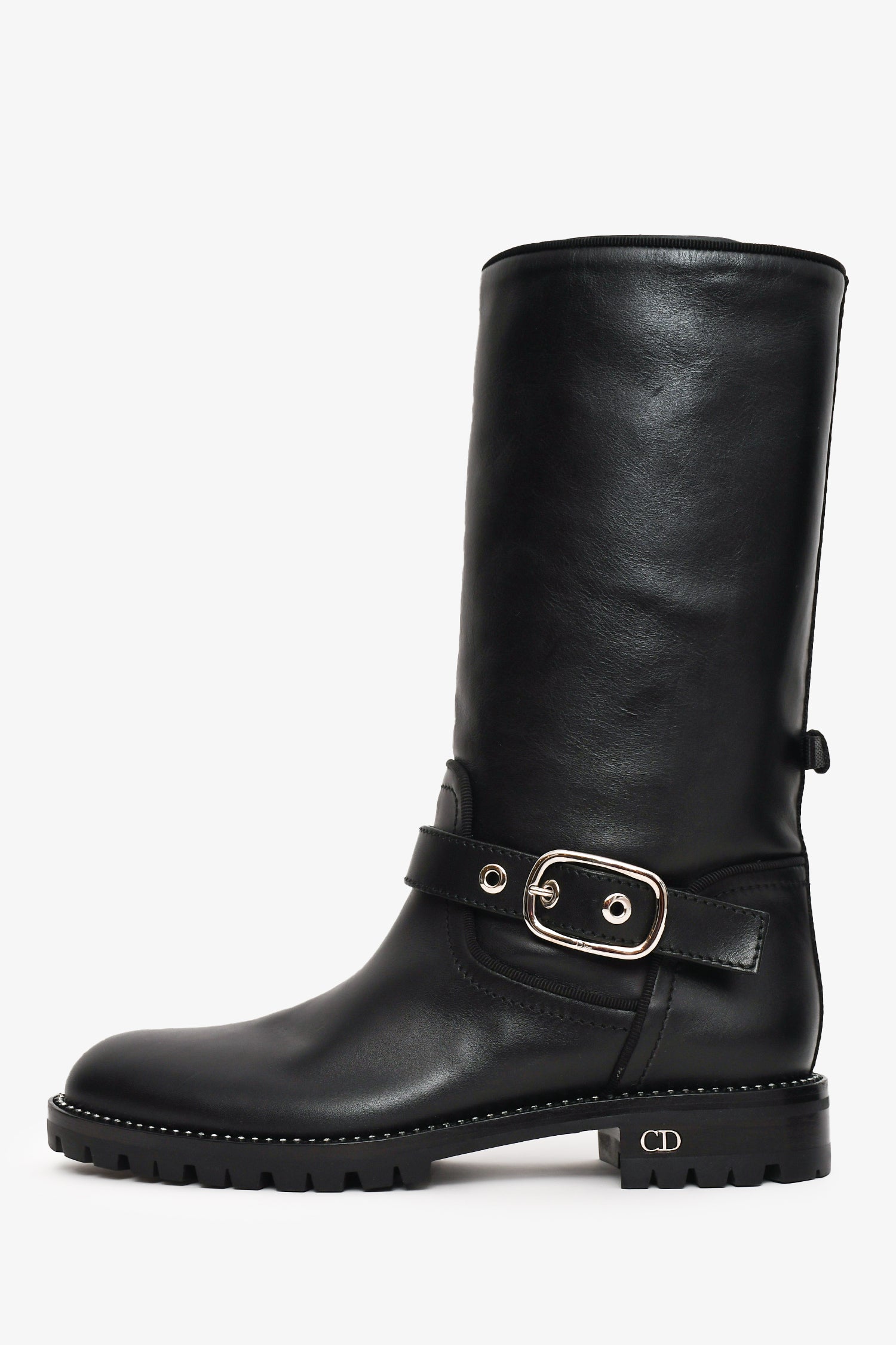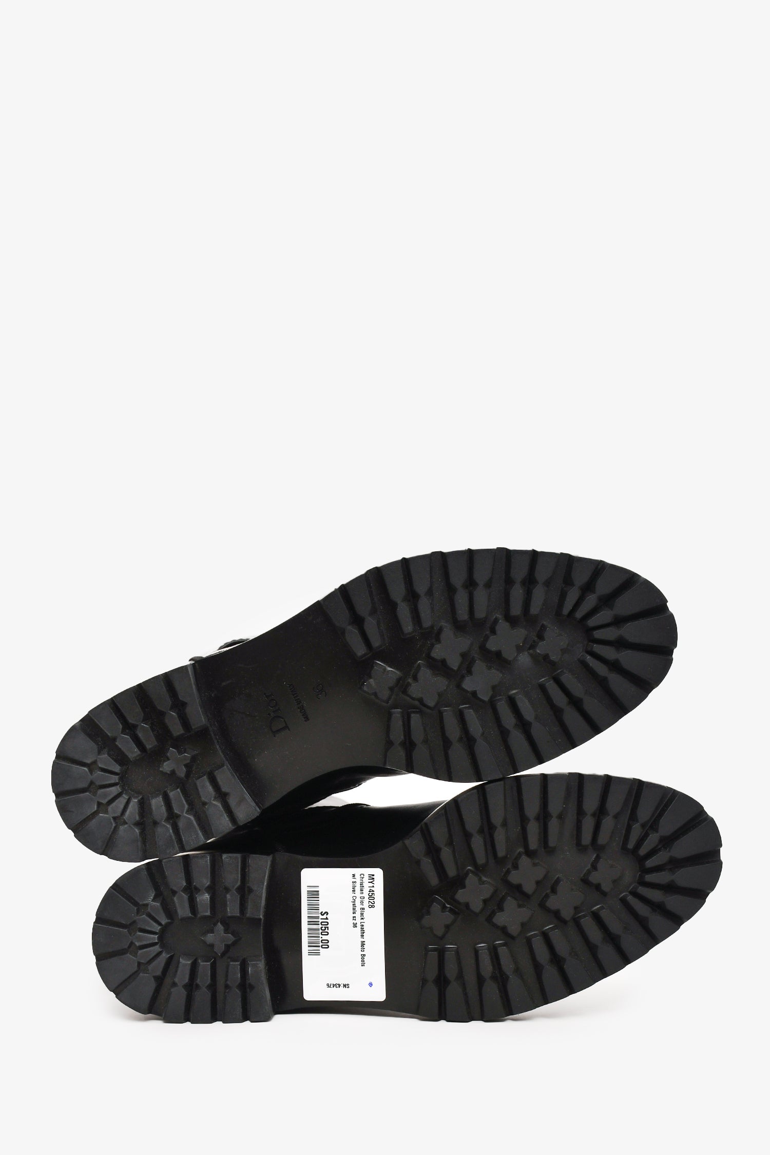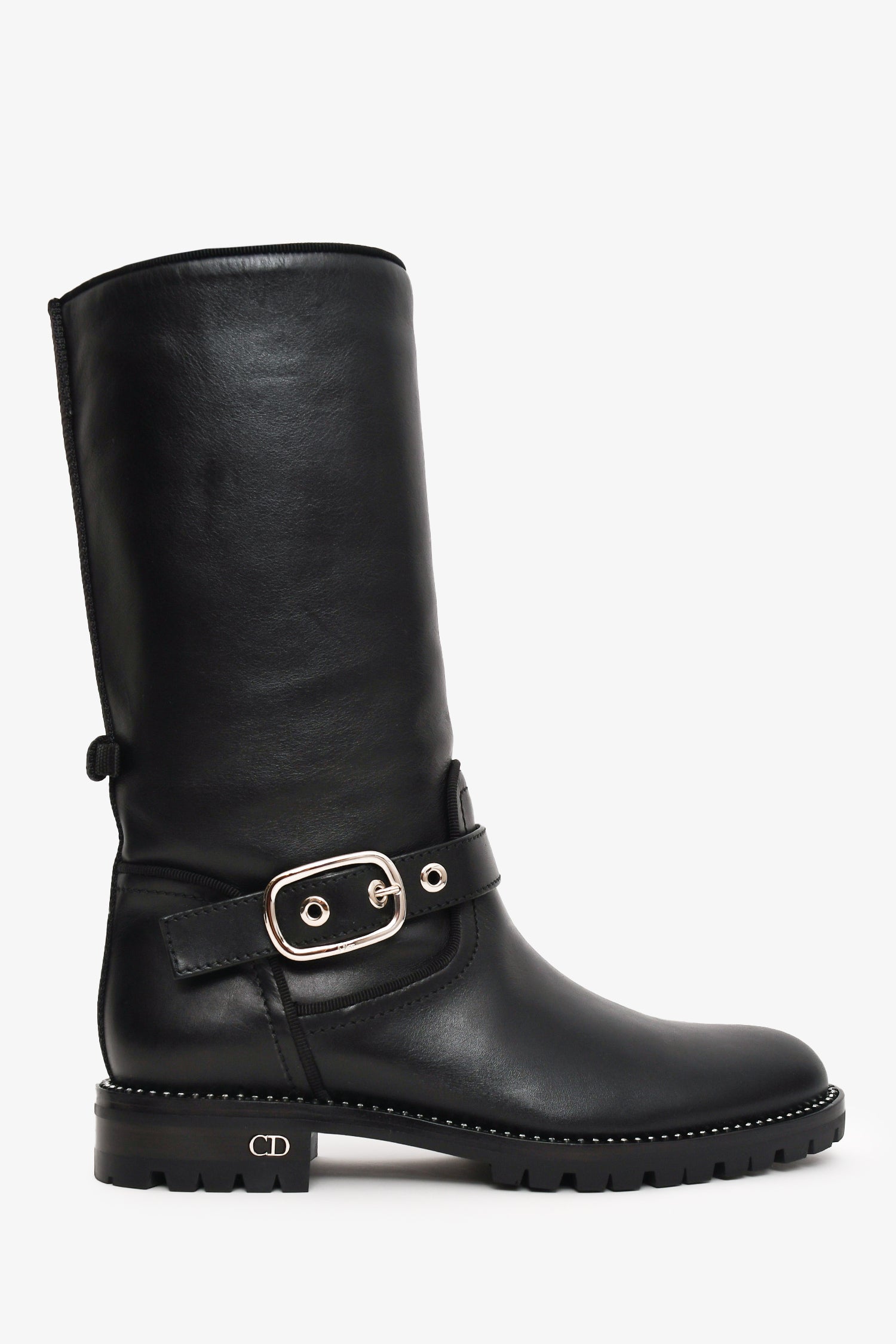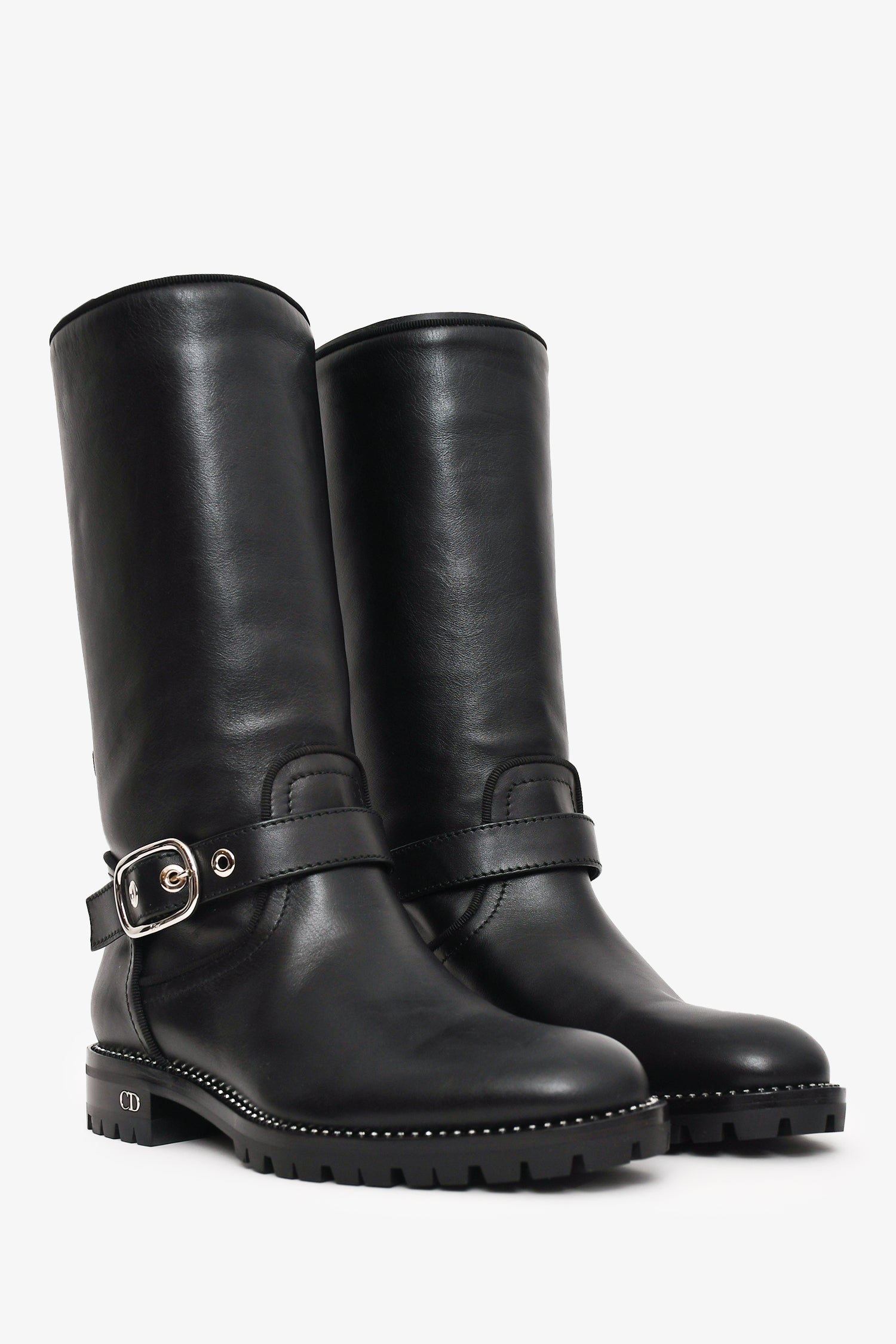 Refresh availabilityChristian Dior Black Leather Moto Boots with Silver Crystals. Treaded soles. Crystal embellishment on the soles. Buckled strap at the vamp. Grosgrain trimming. Tonal stitching.