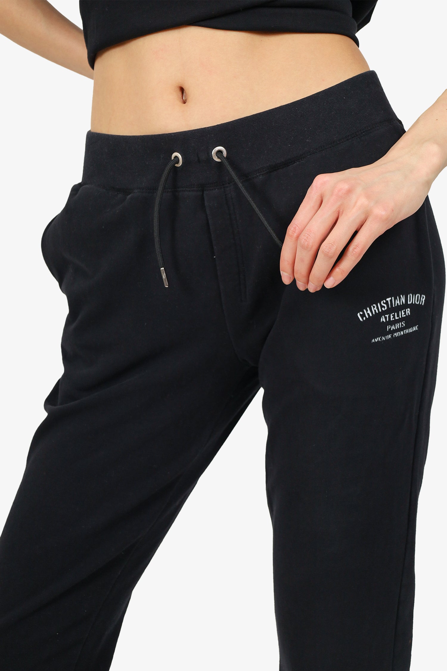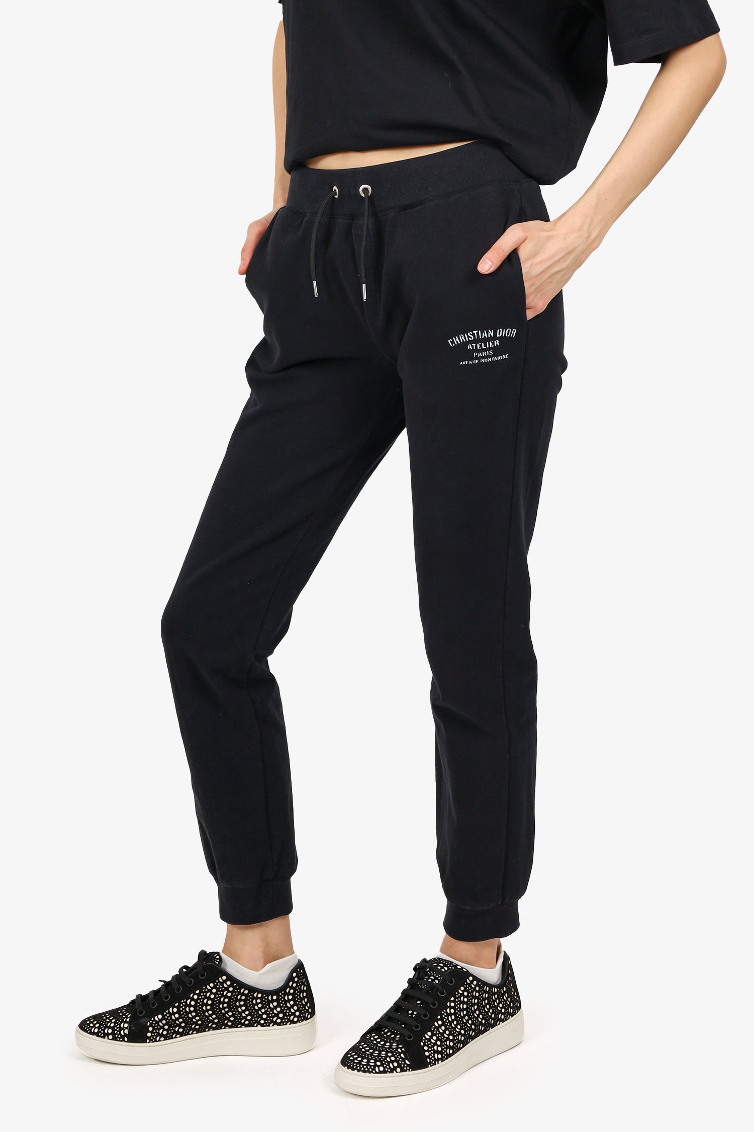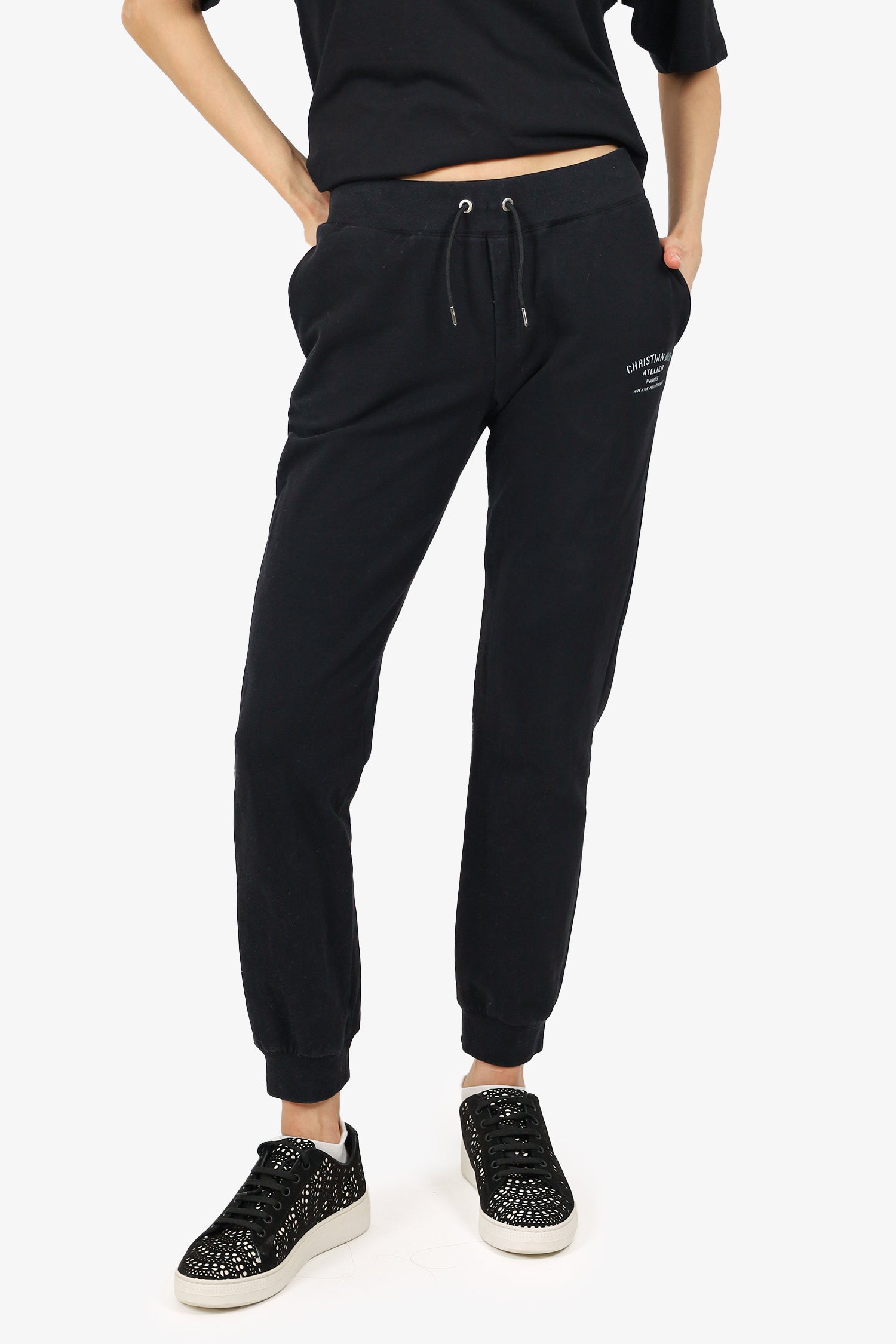 Refresh availabilityChristian Dior Black Logo Sweatpants. Elasticated waistband with drawstring closure. Elasticated ankle cuffs. 2 front exterior side slip pocket. Silver-tone hardware. Tonal stitching.