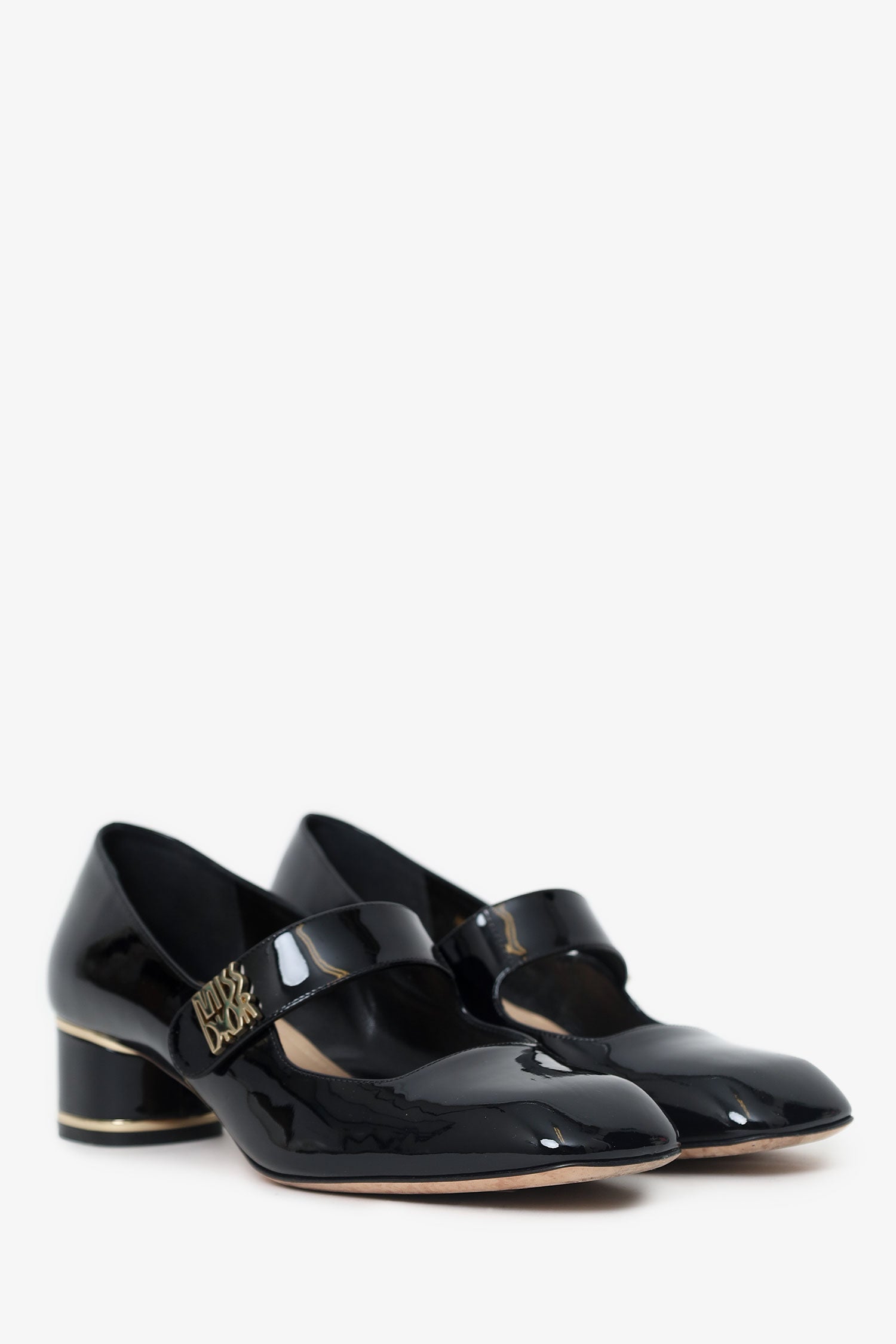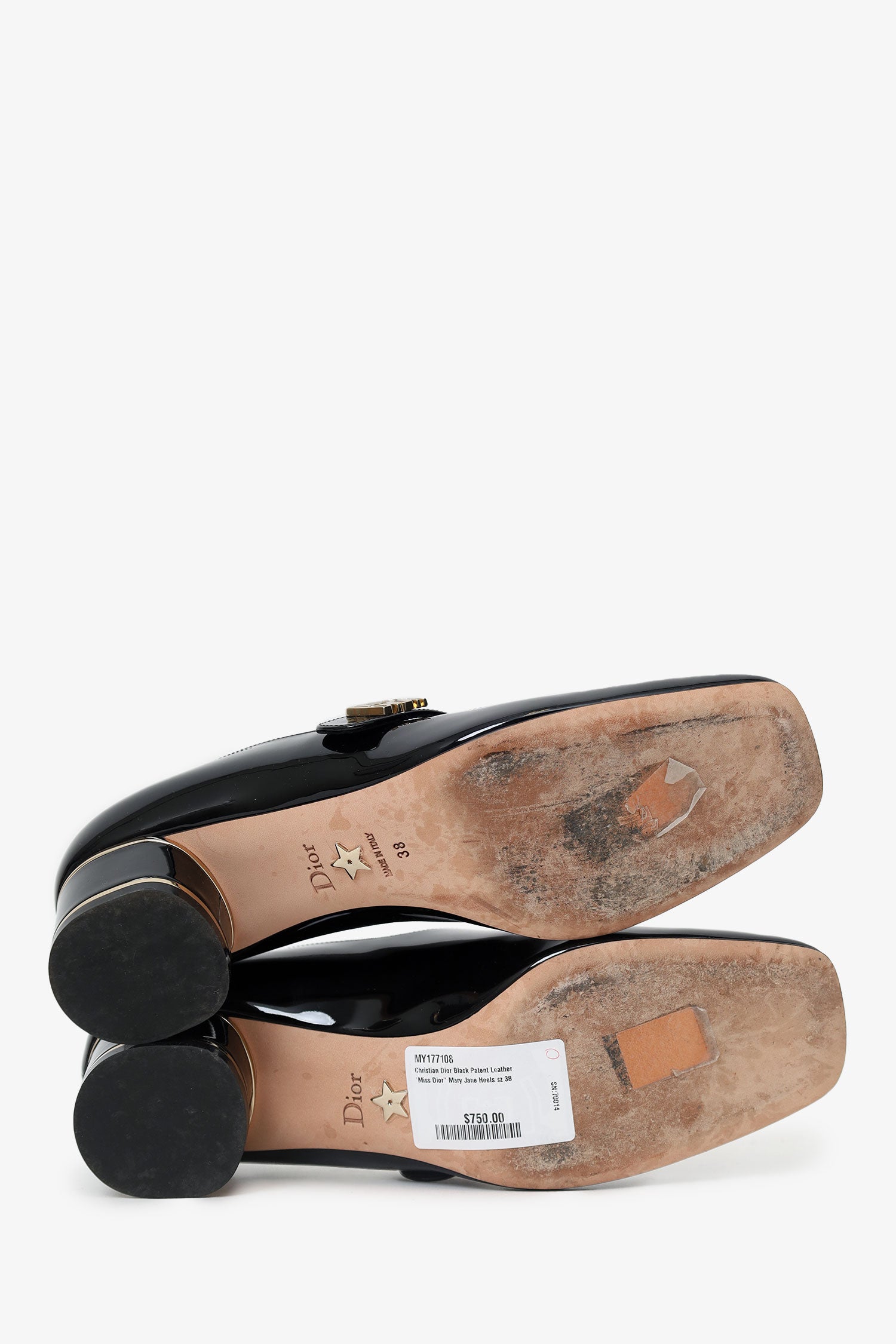 Refresh availabilityChristian Dior Black Patent Leather 'Miss Dior" Mary Jane Heels. Slip-on. Squared toe. Tonal stitching. Gold-tone hardware.