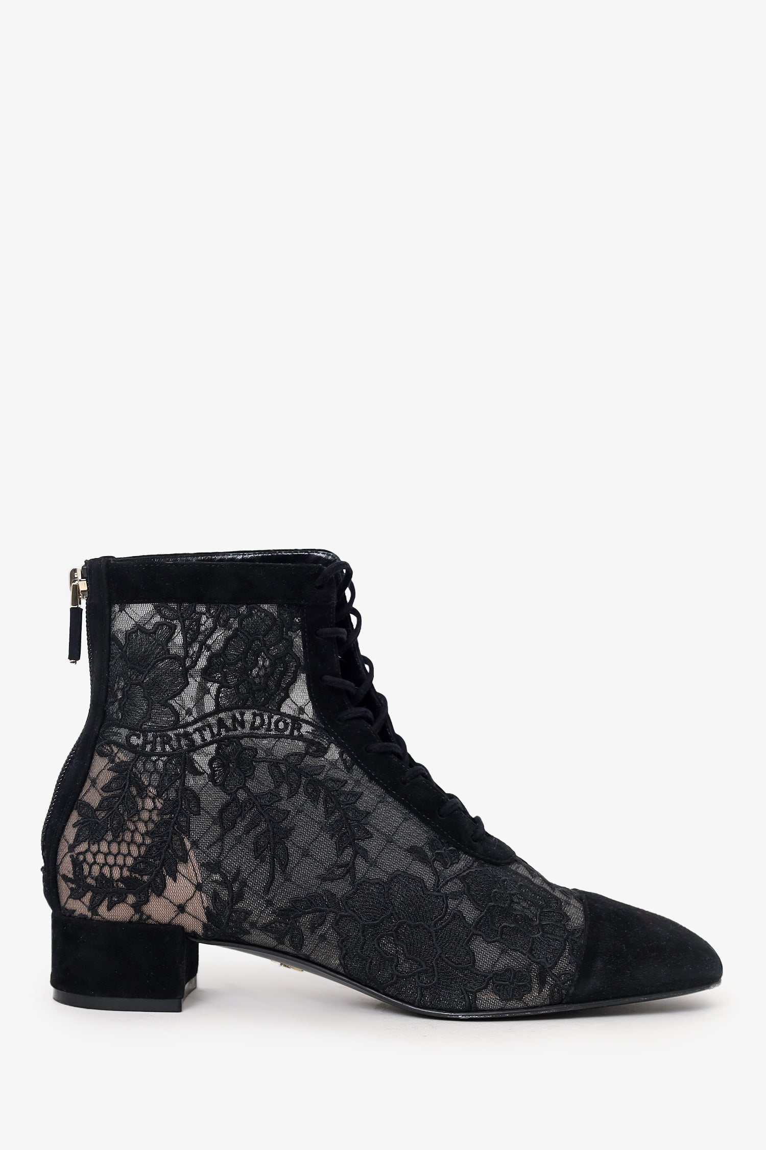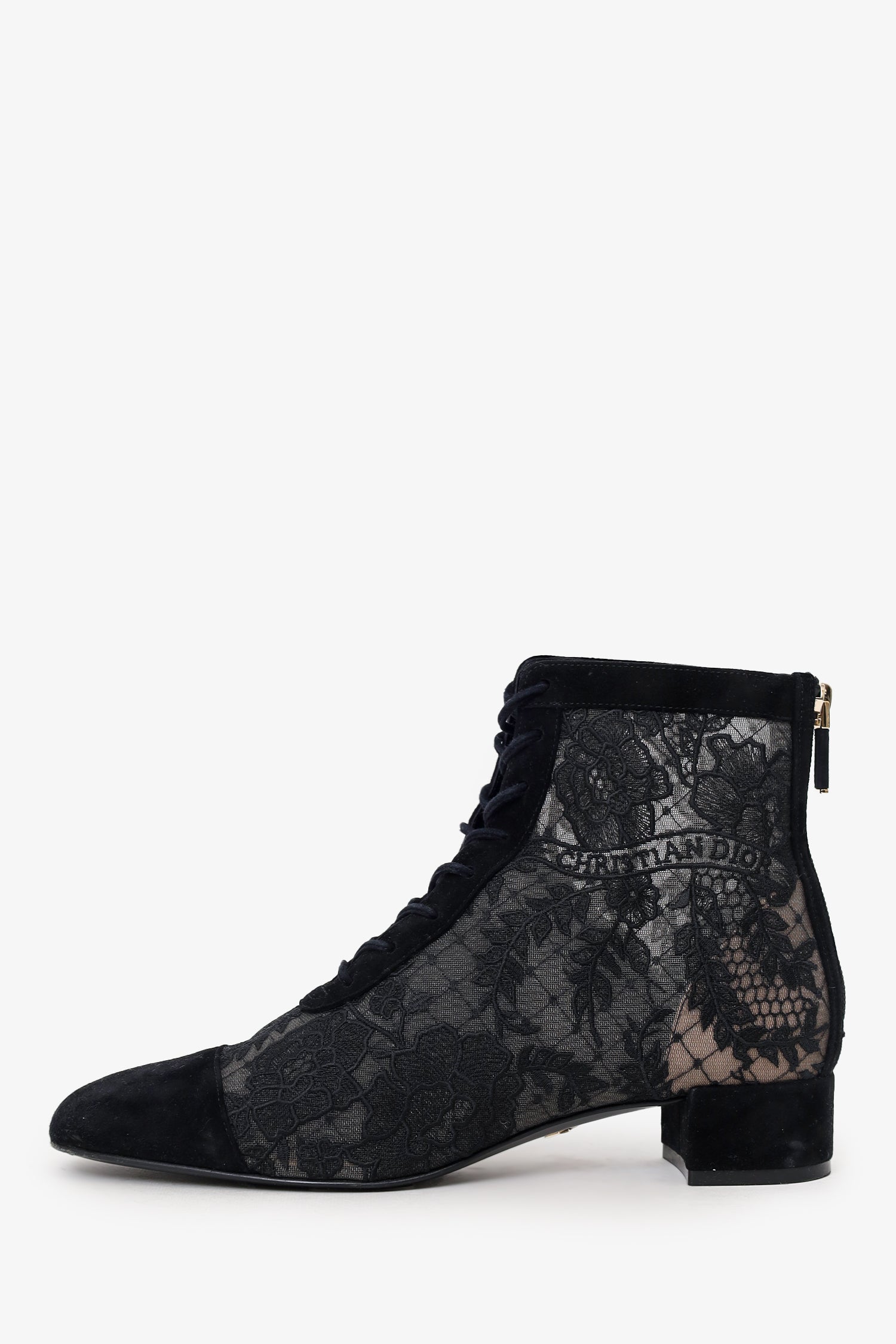 Refresh availabilityChristian Dior Black Suede/Mesh Embroidered Naughtily-D Ankle Boots. Pull-on. Square toe. Rear zip closure. Front lace-up closure. Mesh body. Tonal stitching.